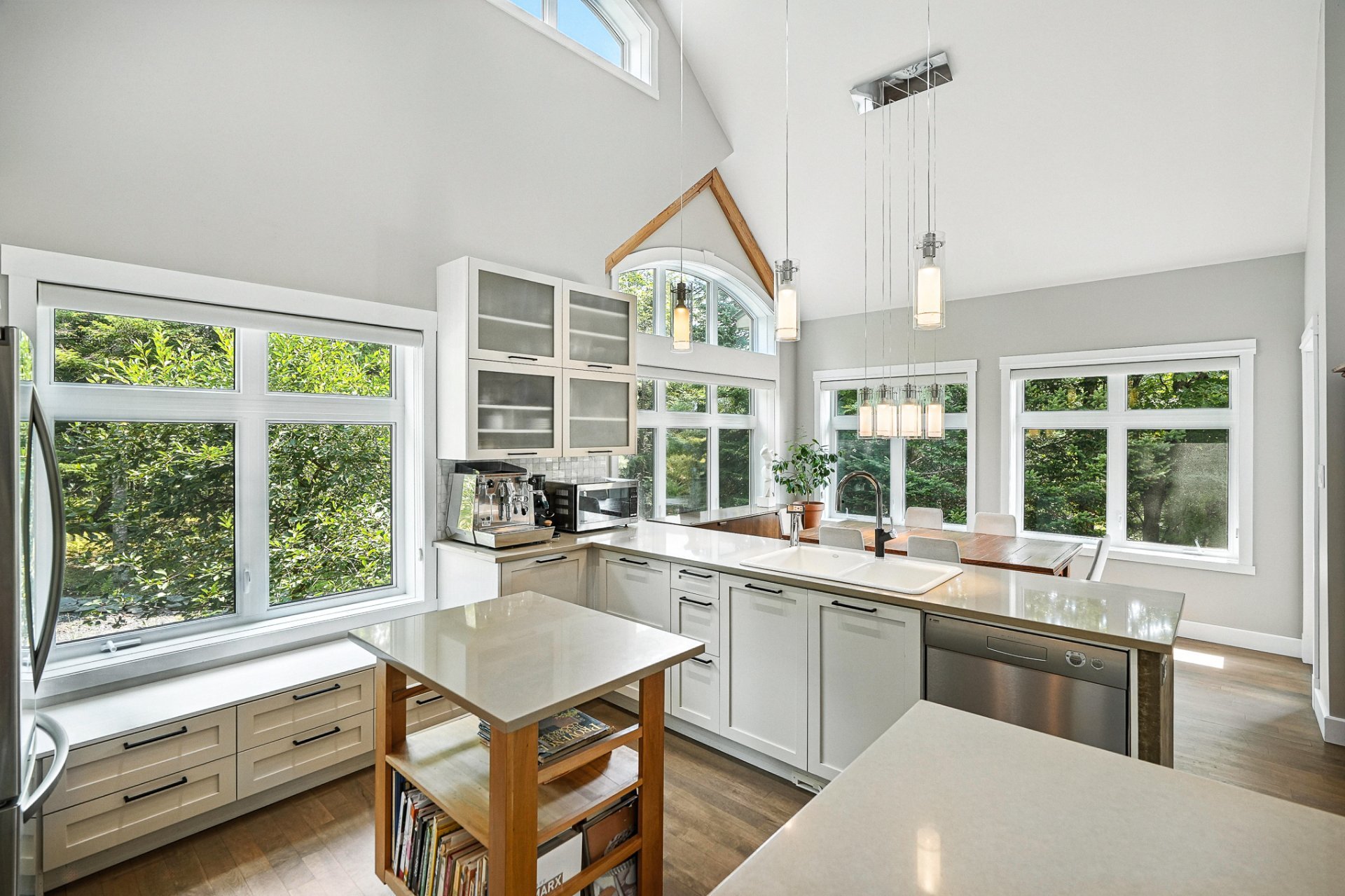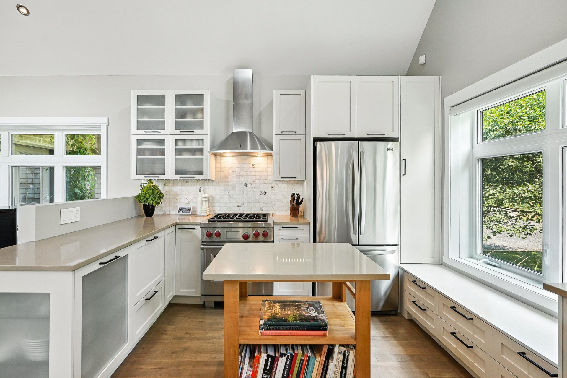 - The 8,000 W backup generator, refrigerator, Wolf gas range (electric oven), Asko dishwasher, all interior and exterior blinds, pendant light fixtures in the kitchen, dining room, main floor bedroom (or office), walk-in closet and garden level bedroom, centrally monitored alarm system, cellular transmitter for the alarm system, Hilo-compatible thermostats (9 zones).