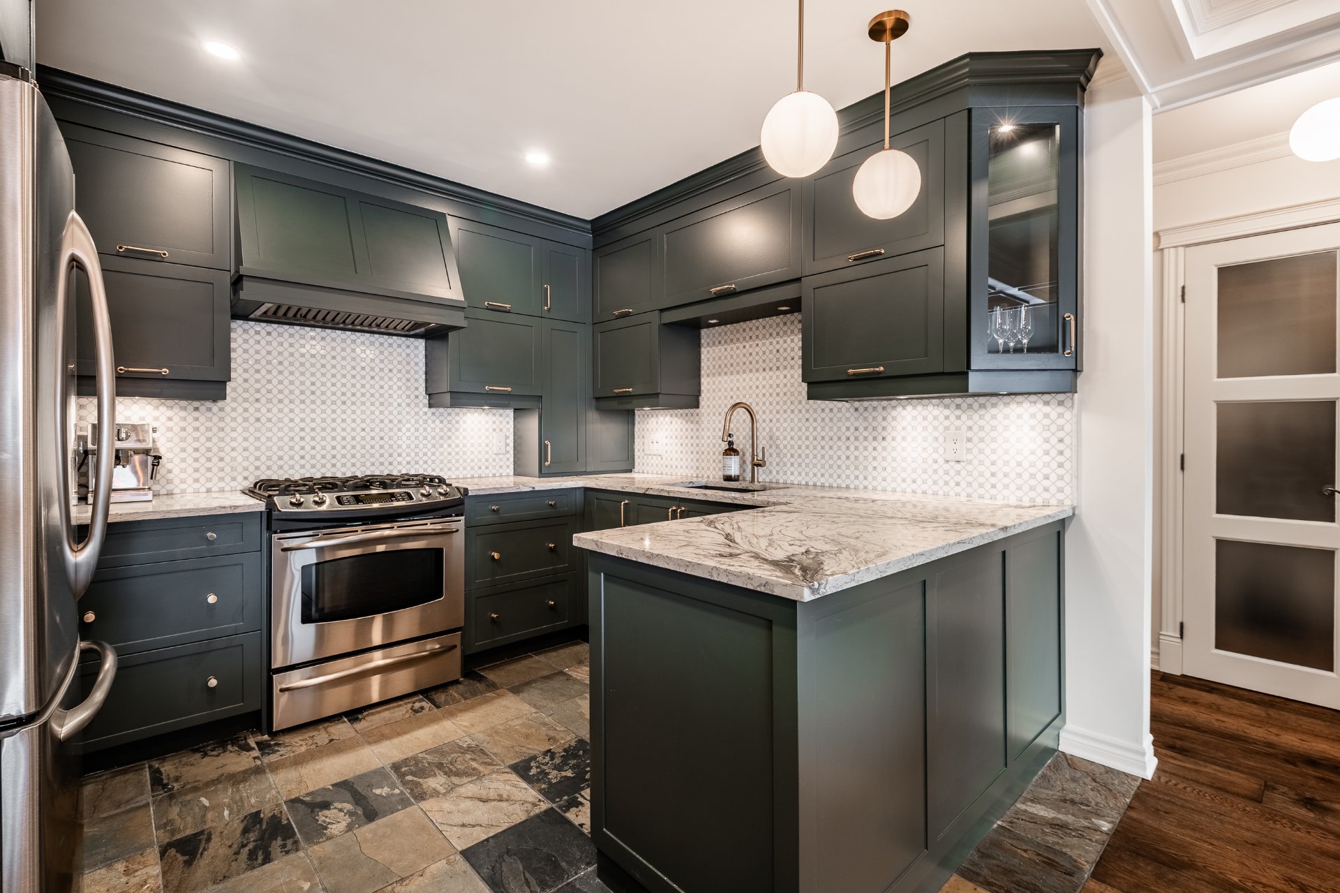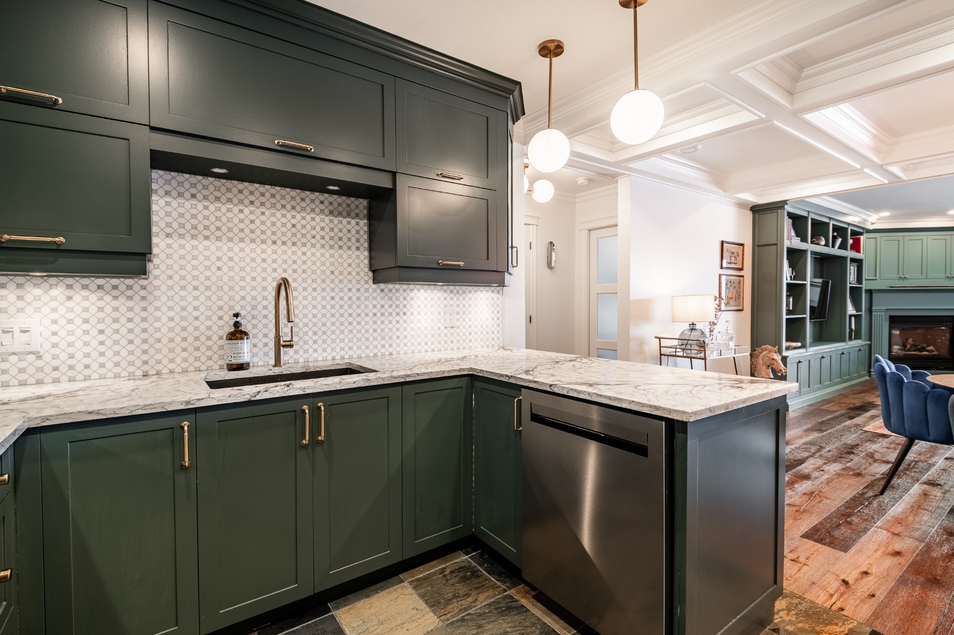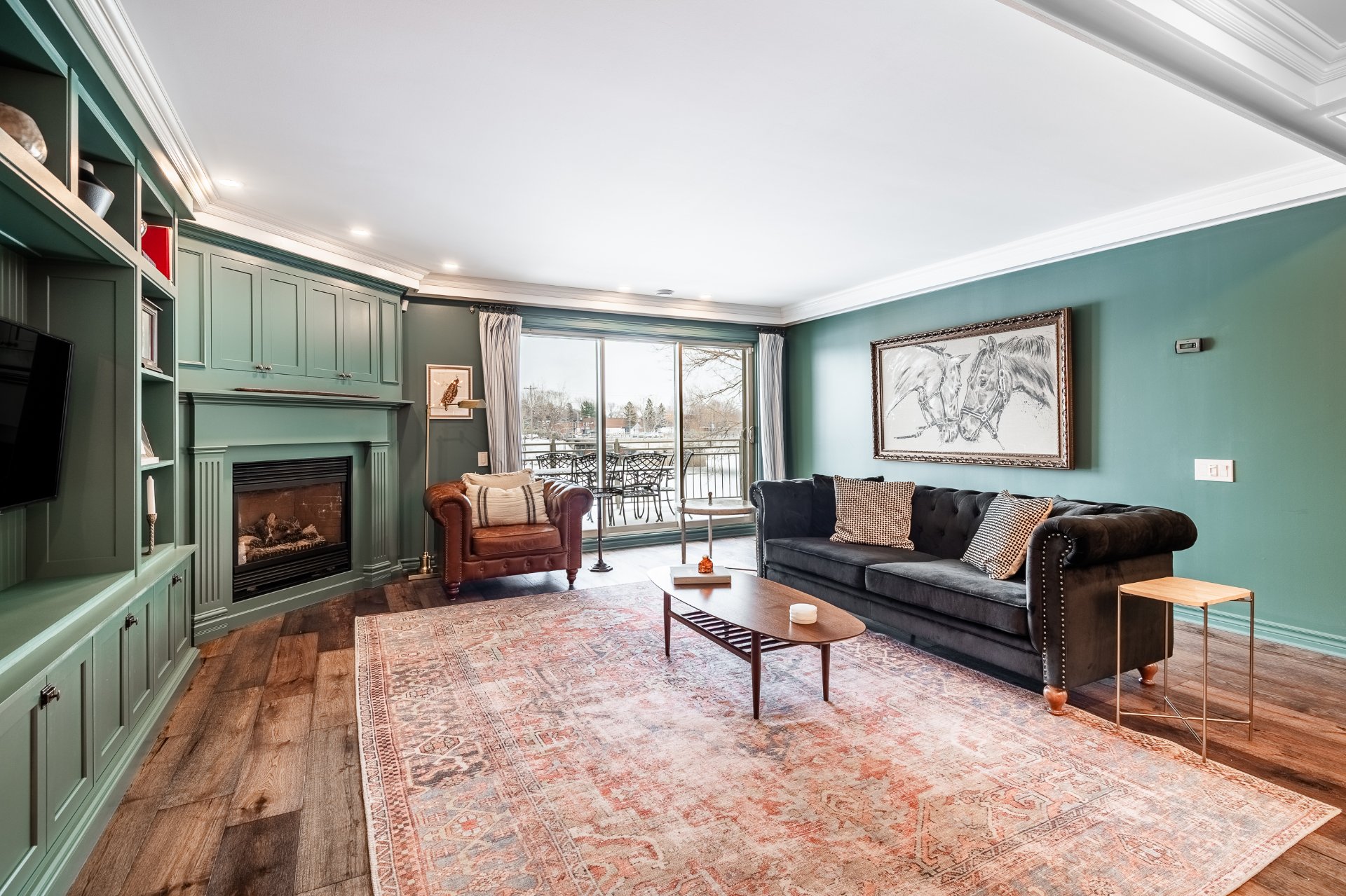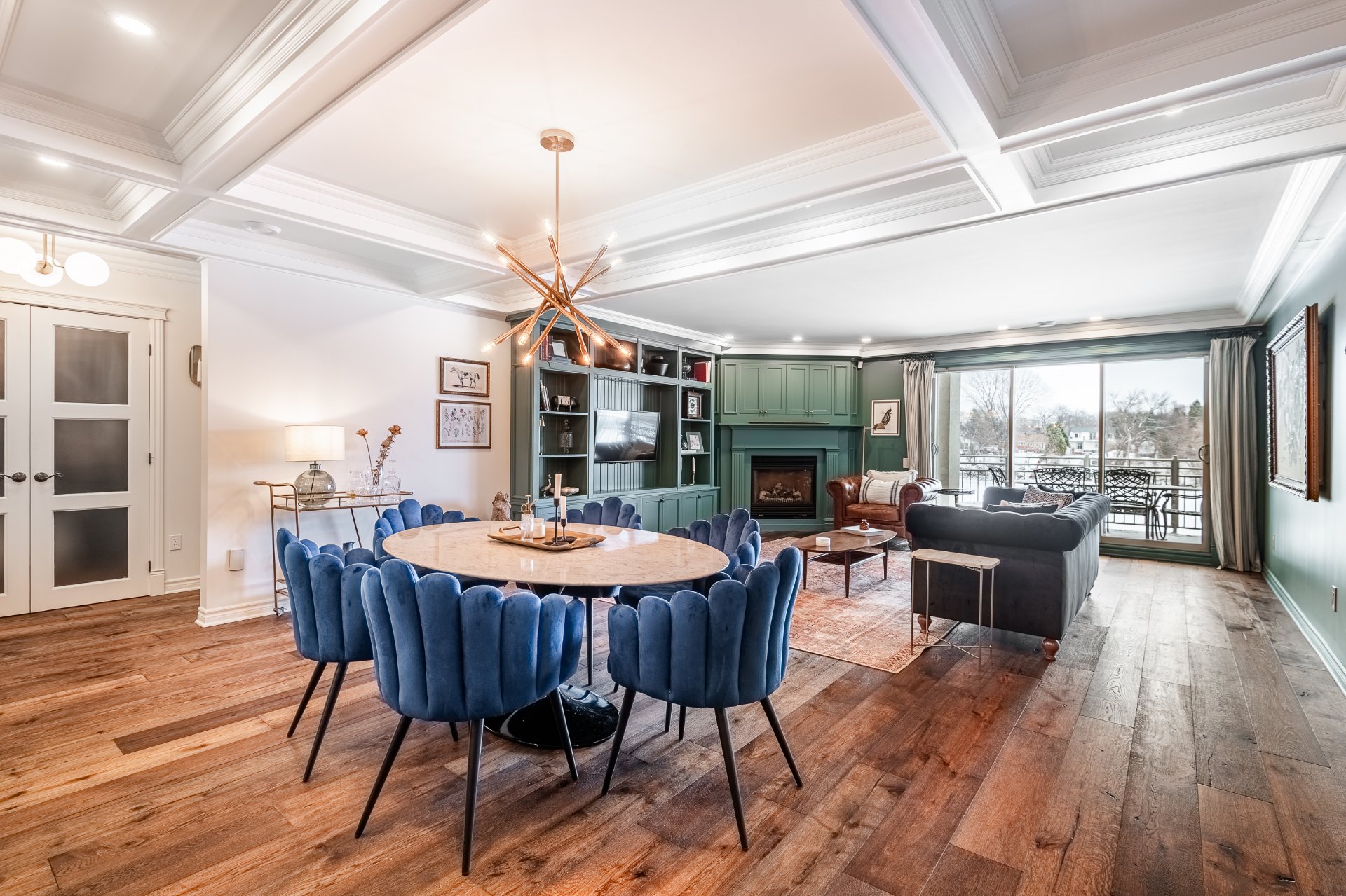 From the moment you enter, you are welcomed by a spacious and thoughtfully designed open-concept living area. The living room, enhanced by a gas fireplace and custom built-in shelving, creates a warm yet sophisticated ambiance. The kitchen, distinctly modern in design, features full-height cabinetry, an elegant backsplash, and high-quality finishes that perfectly balance style and functionality.