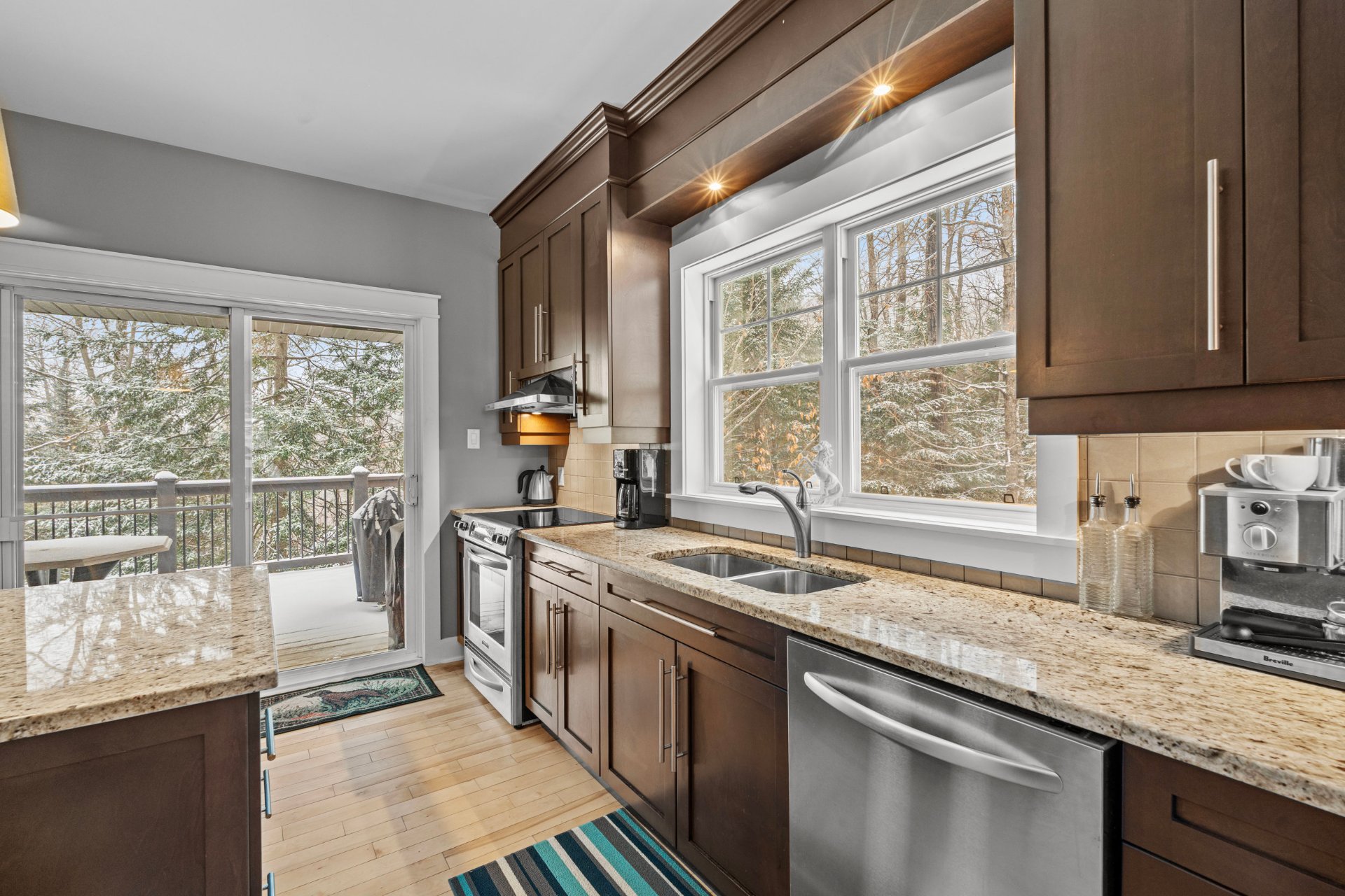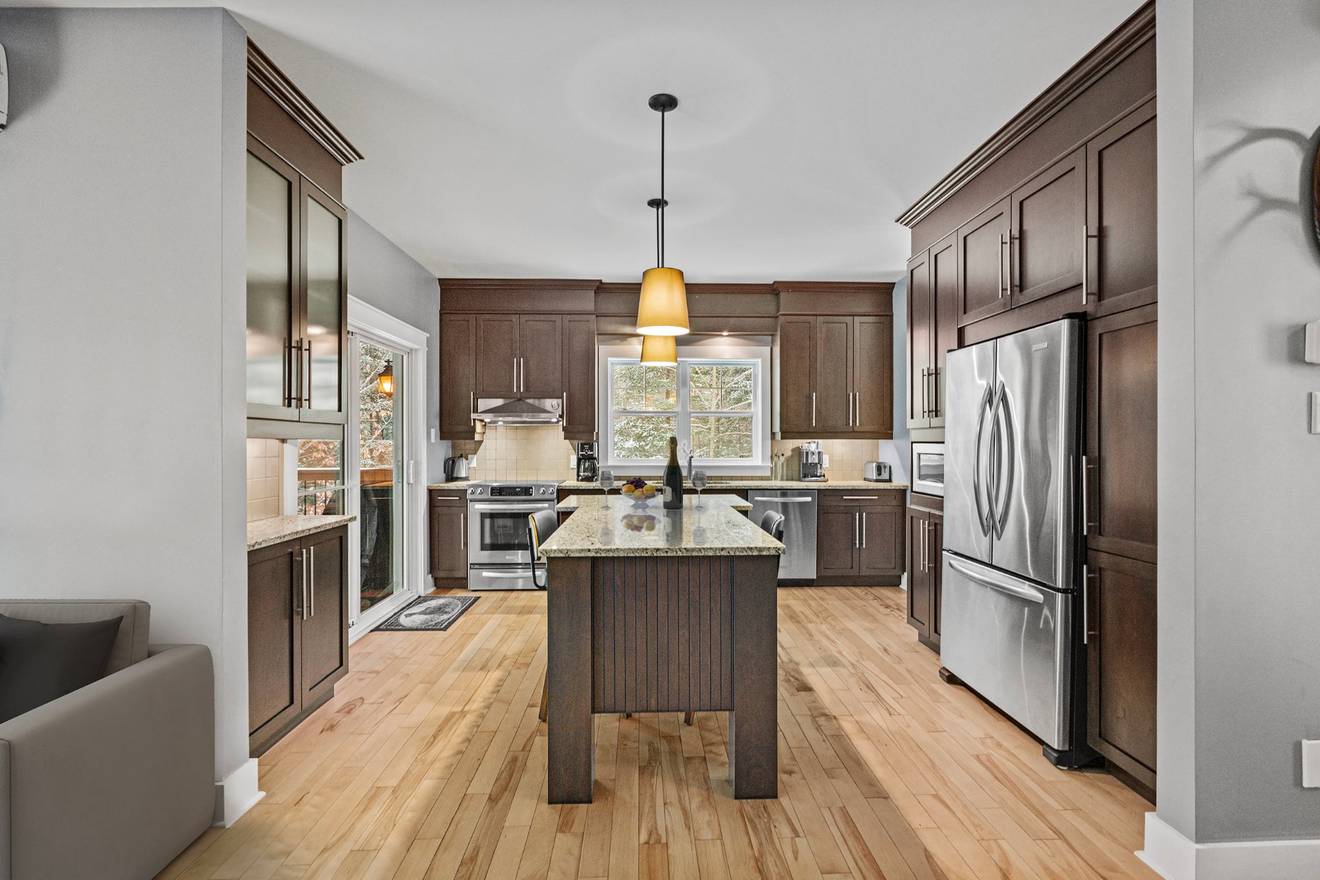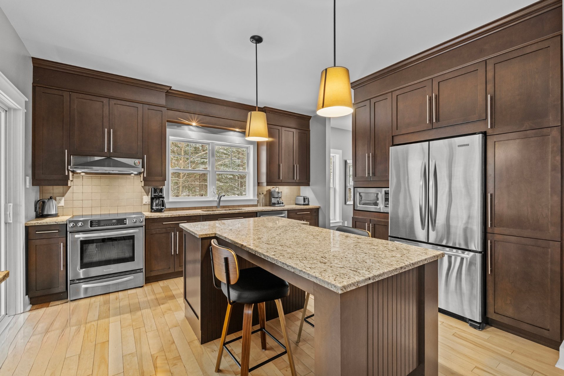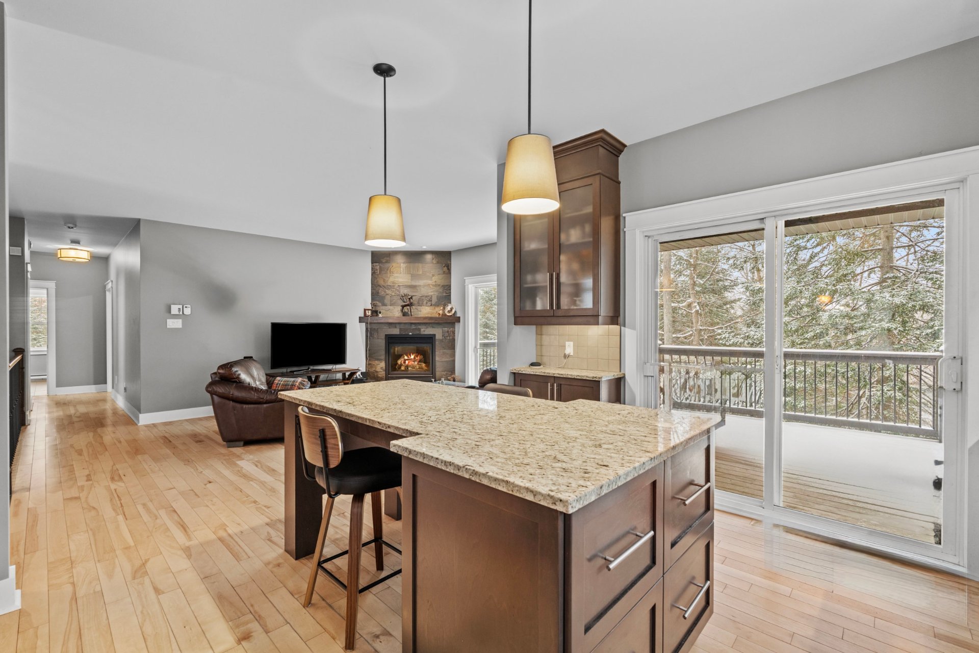 The living room, enhanced by a propane gas fireplace, creates a warm and welcoming ambiance, ideal for cozy evenings. The kitchen, distinctly modern, features a central granite island that fosters a friendly atmosphere, perfect for sharing unforgettable moments with your loved ones.
