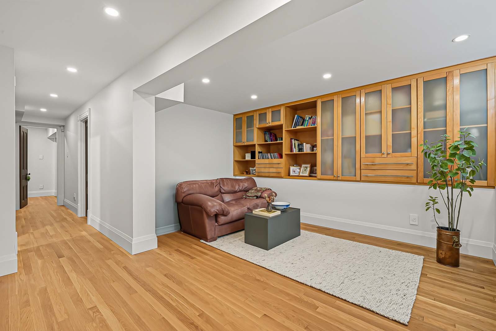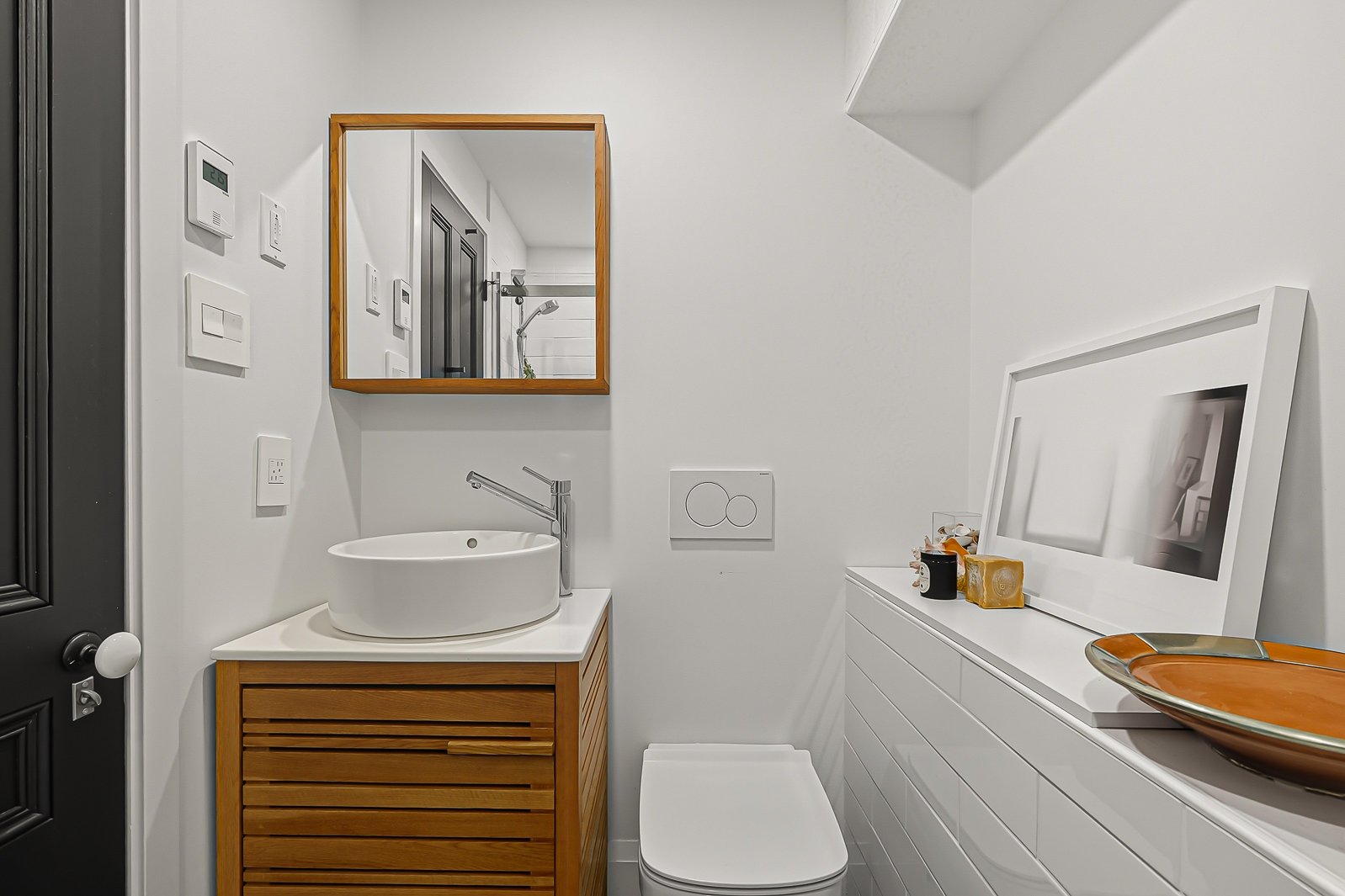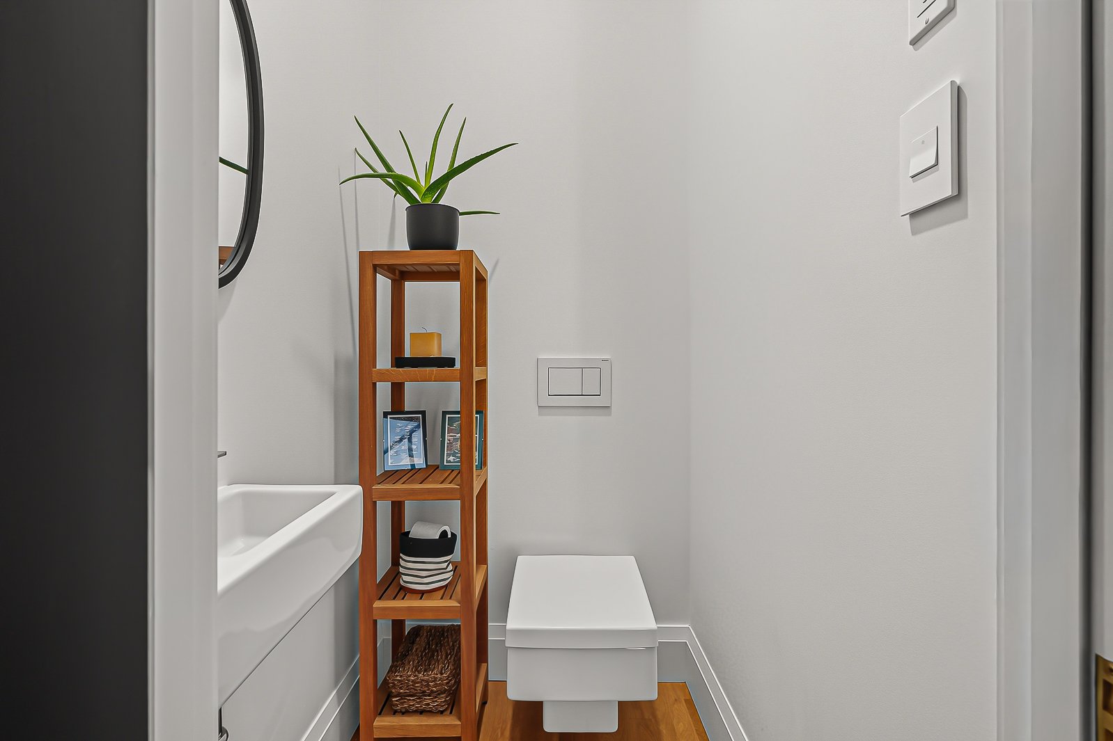 - 2 full bathrooms and a powder room with wall-mounted toilet and heated floors