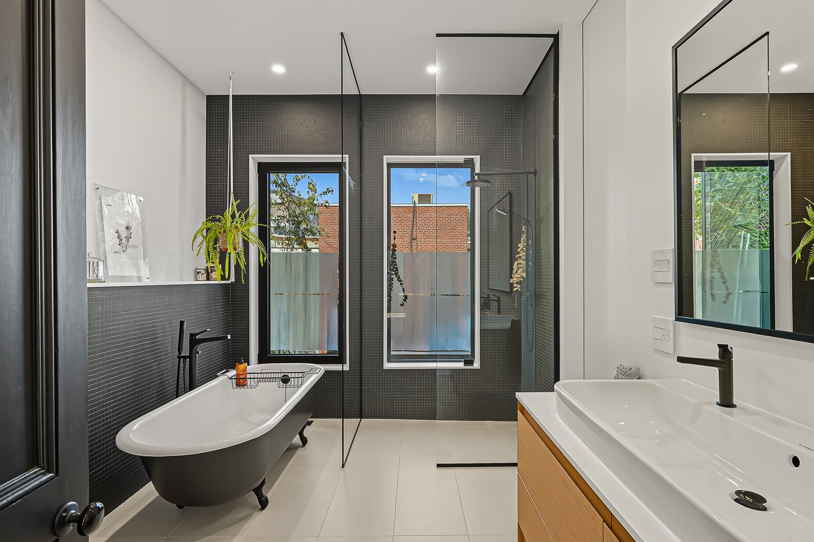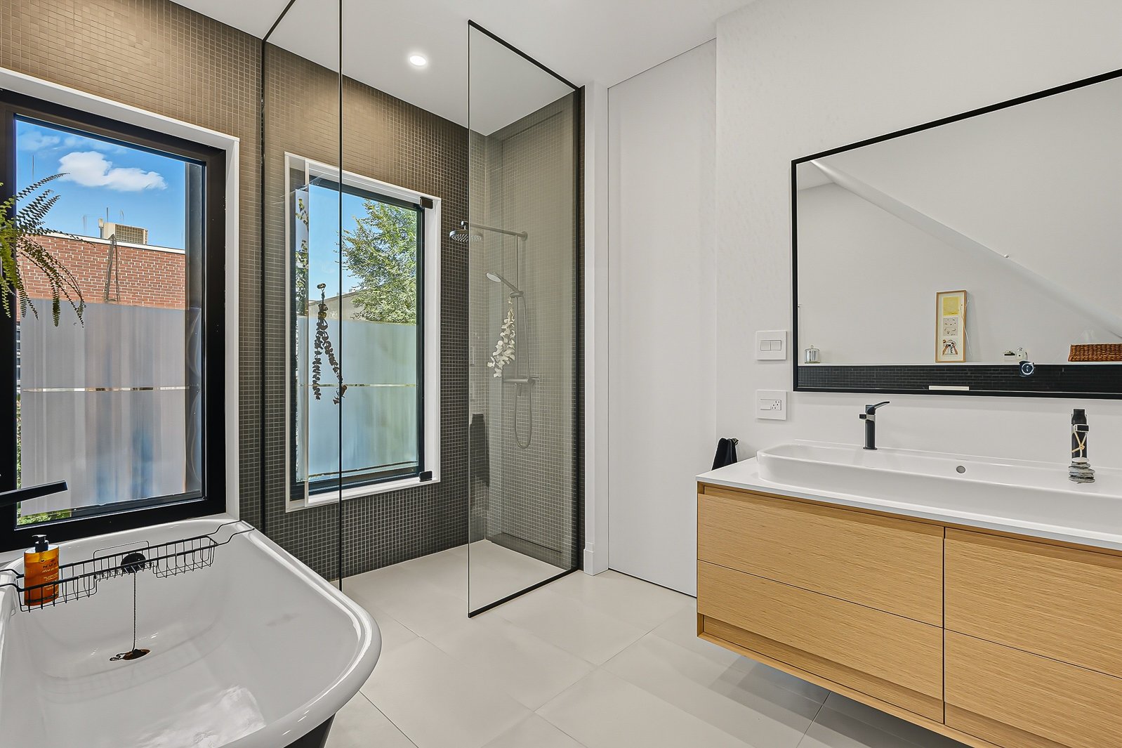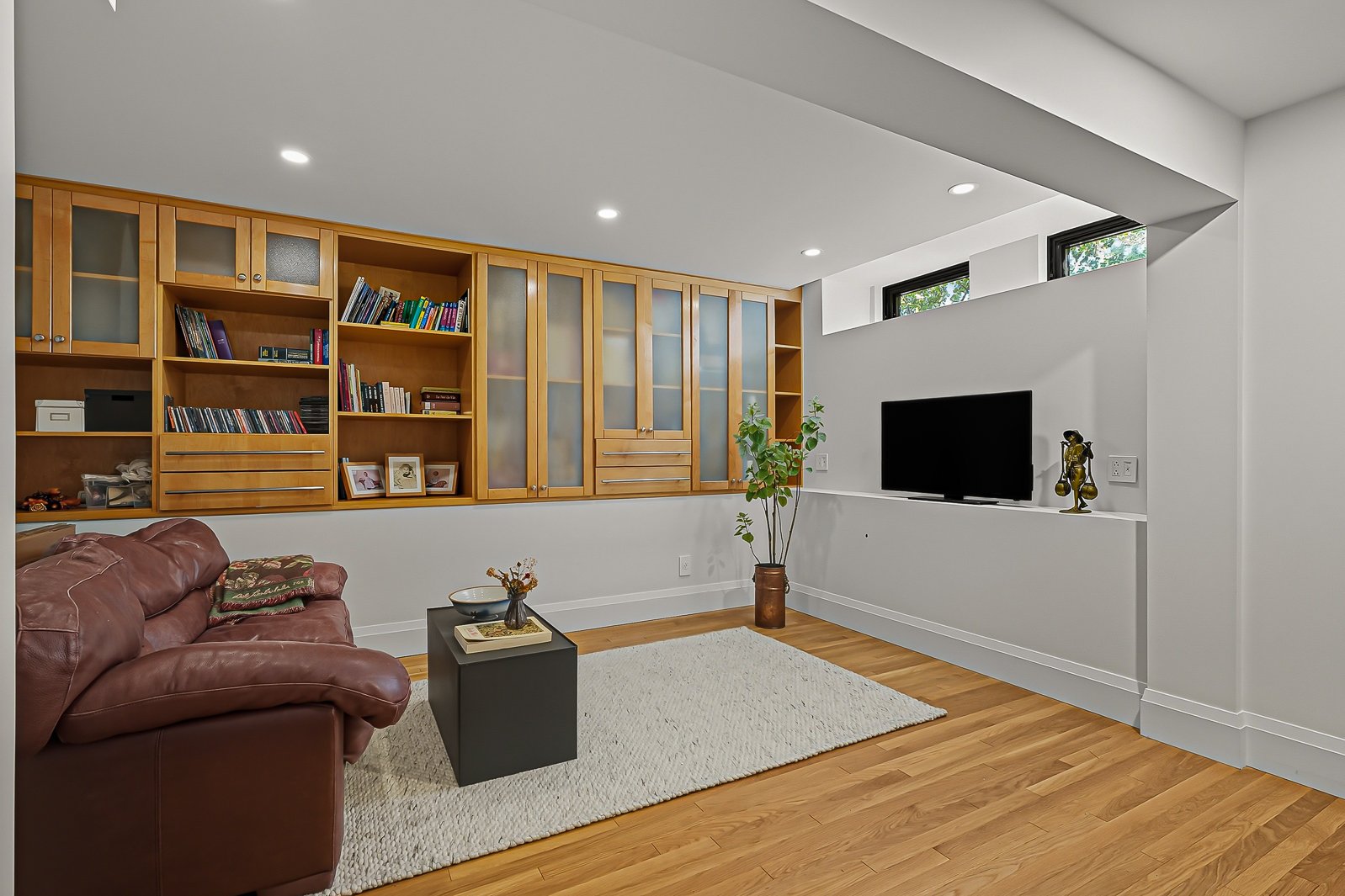 - 2 full bathrooms and a powder room with wall-mounted toilet and heated floors