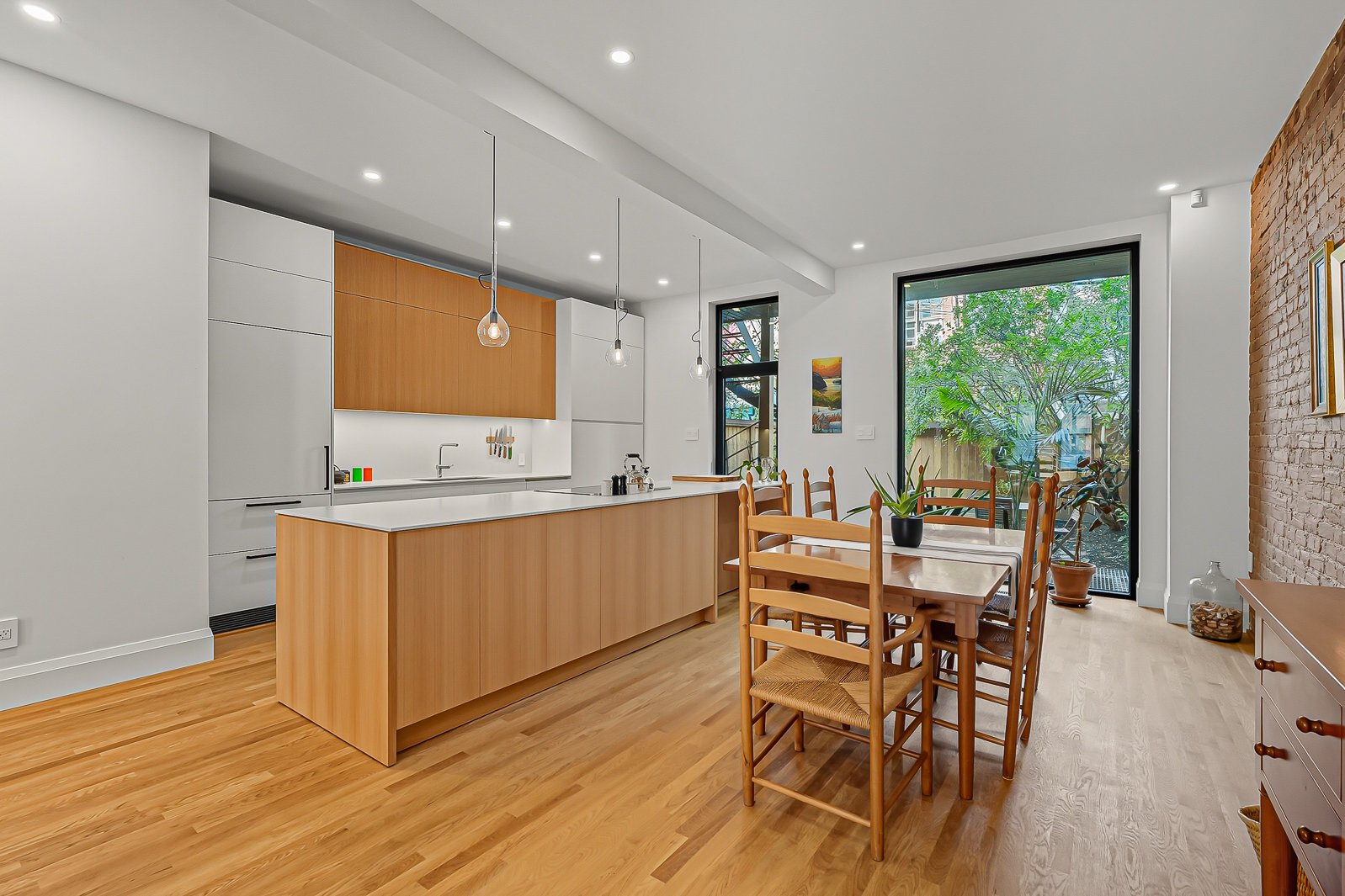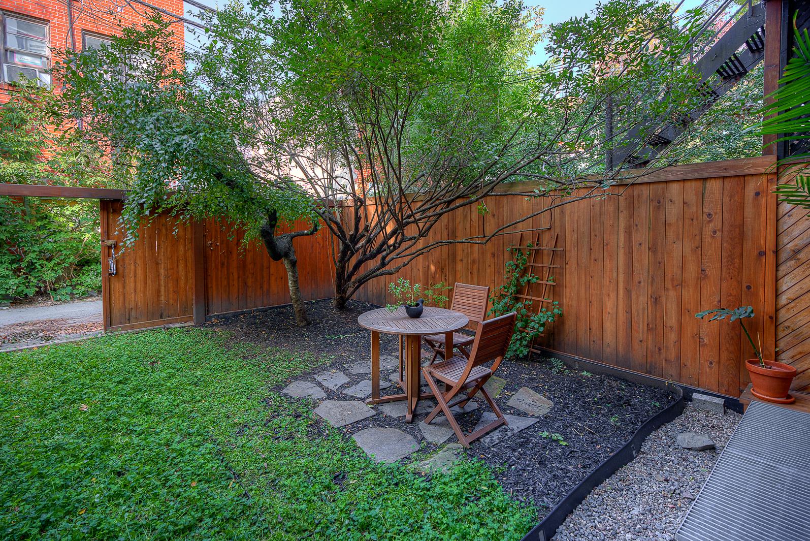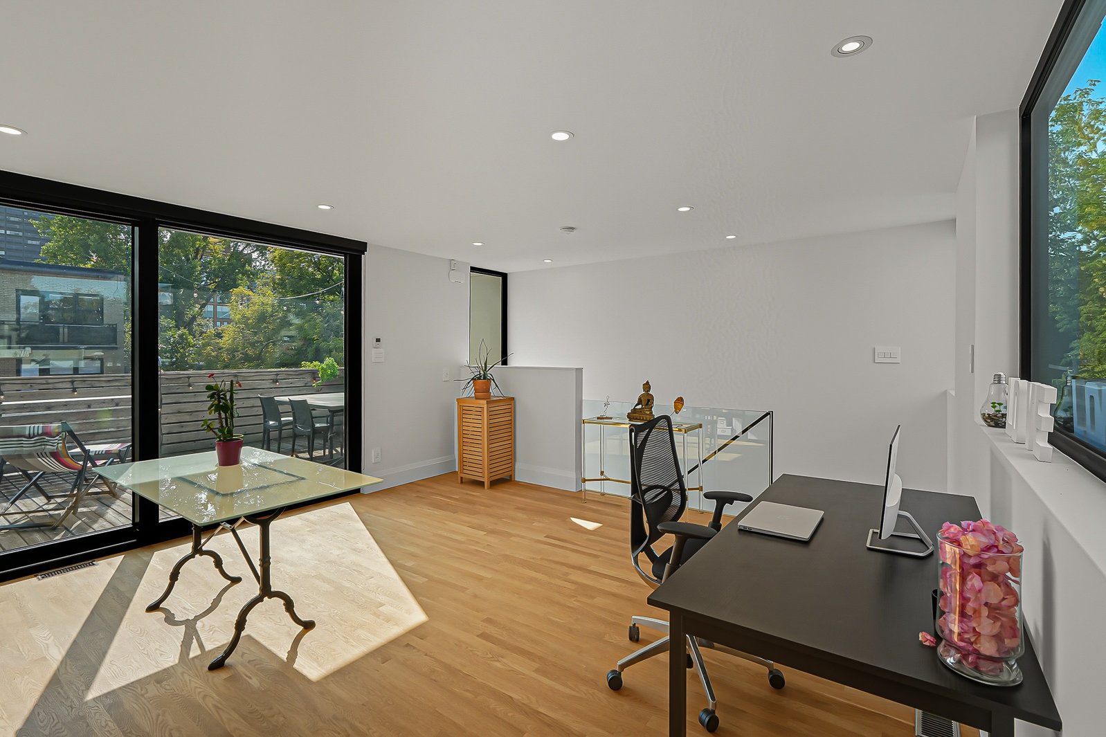 - 3 distinct outdoor spaces: 1 balcony off the master bedroom, a terrace off the mezzanine, and a private, fenced backyard accessed from the kitchen