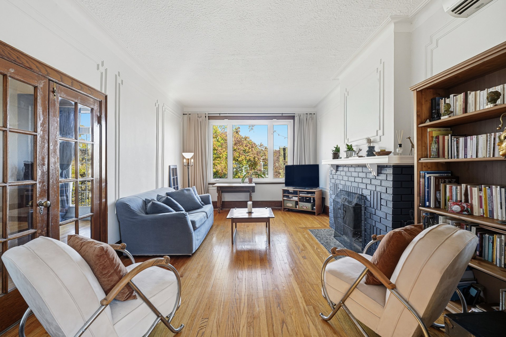 + Living room with decorative fireplace, French doors, and oversized windows overlooking the trees tops