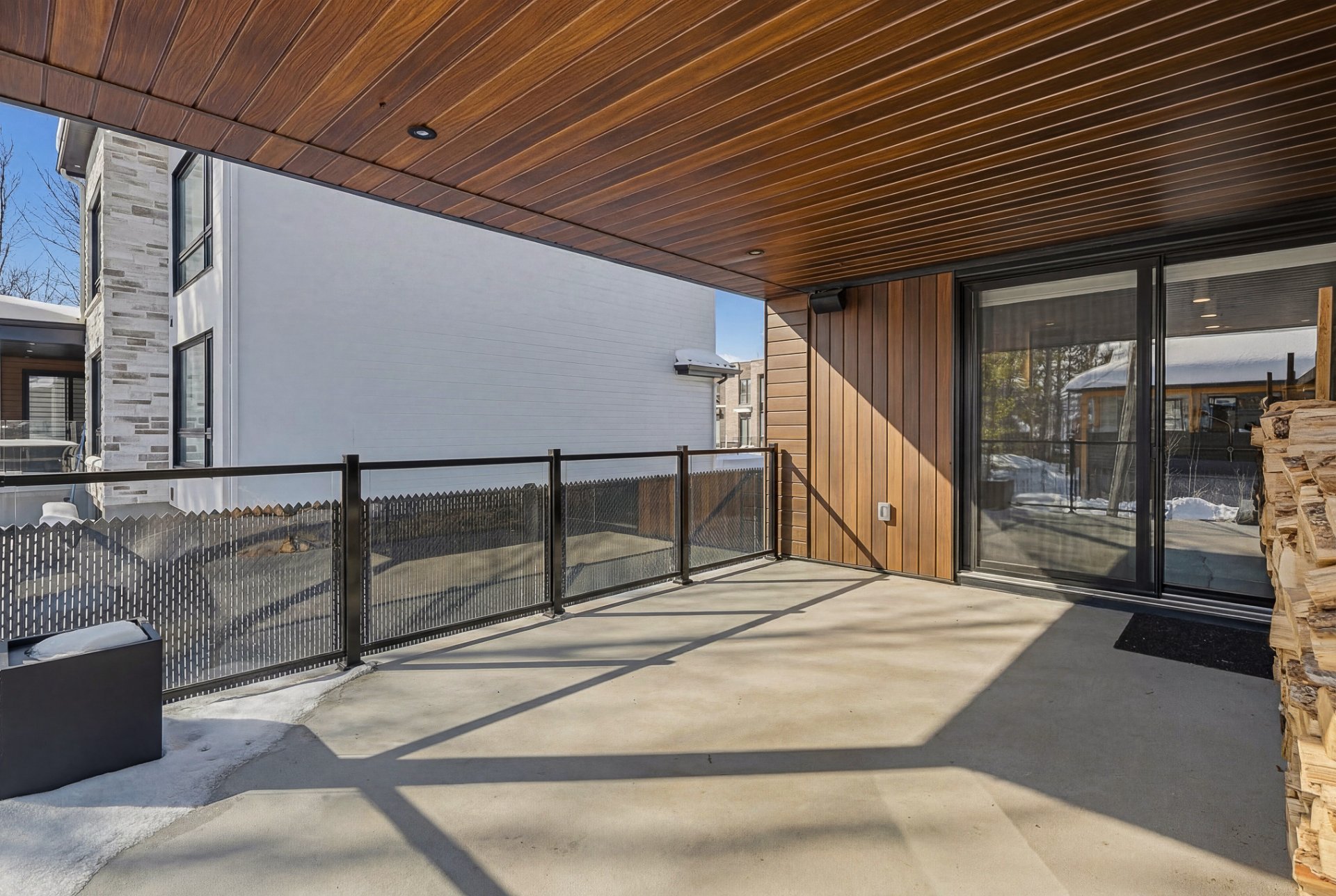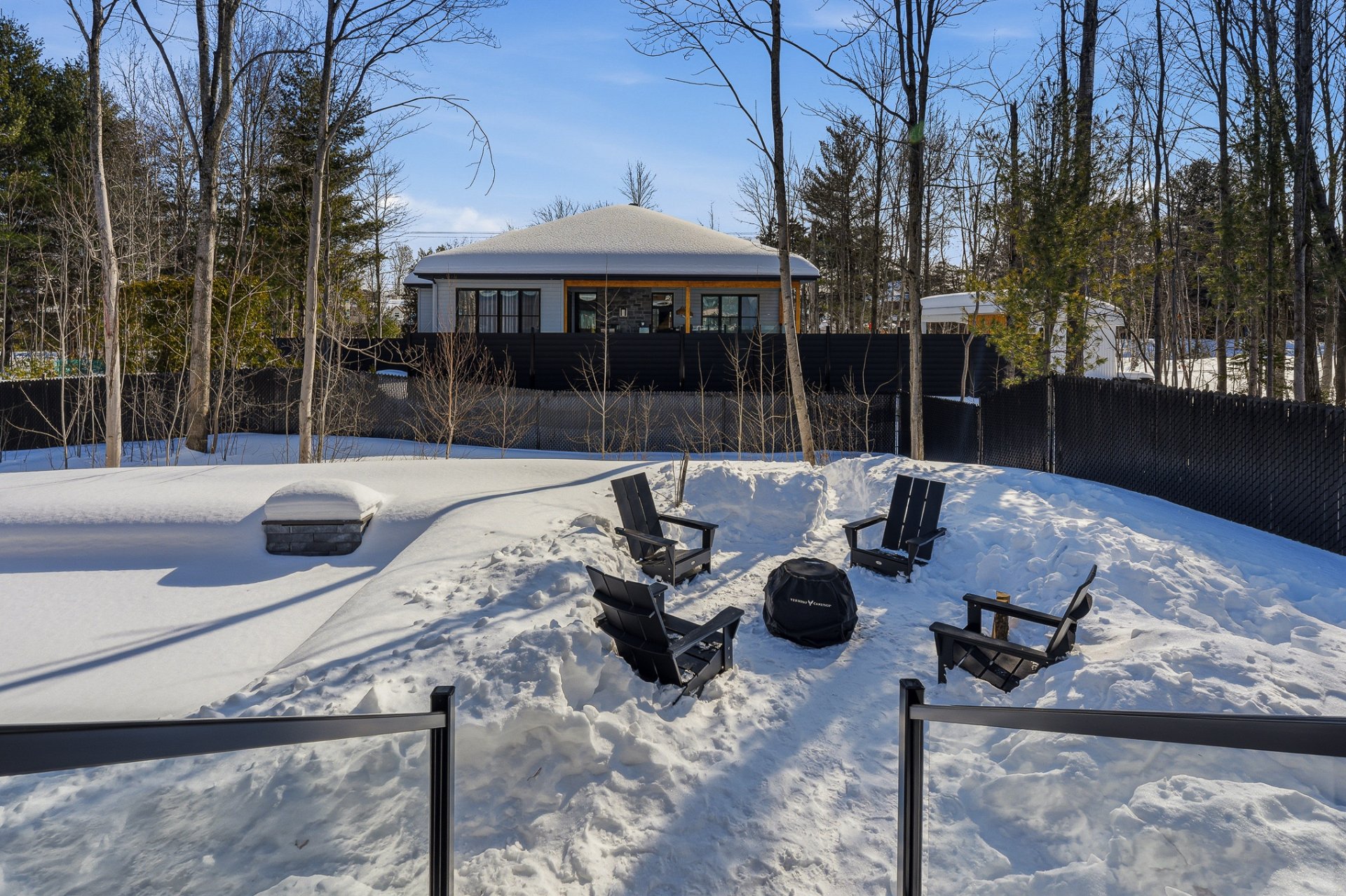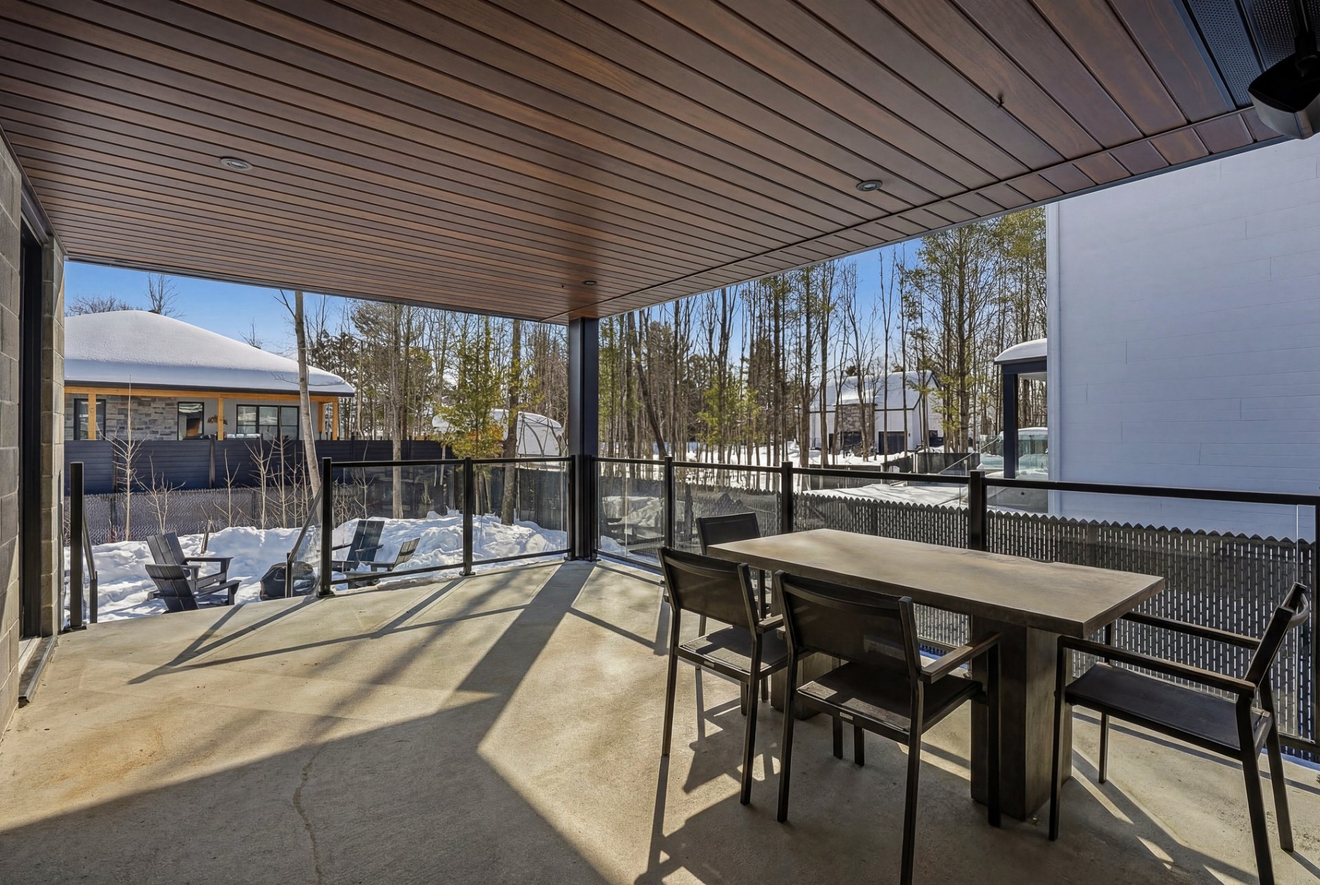 Outside, the landscaped backyard features a covered terrace with a gas BBQ hookup and a heated in-ground pool, allowing full enjoyment of the summer season. An integrated shed built into the foundation provides practical and discreet storage space.