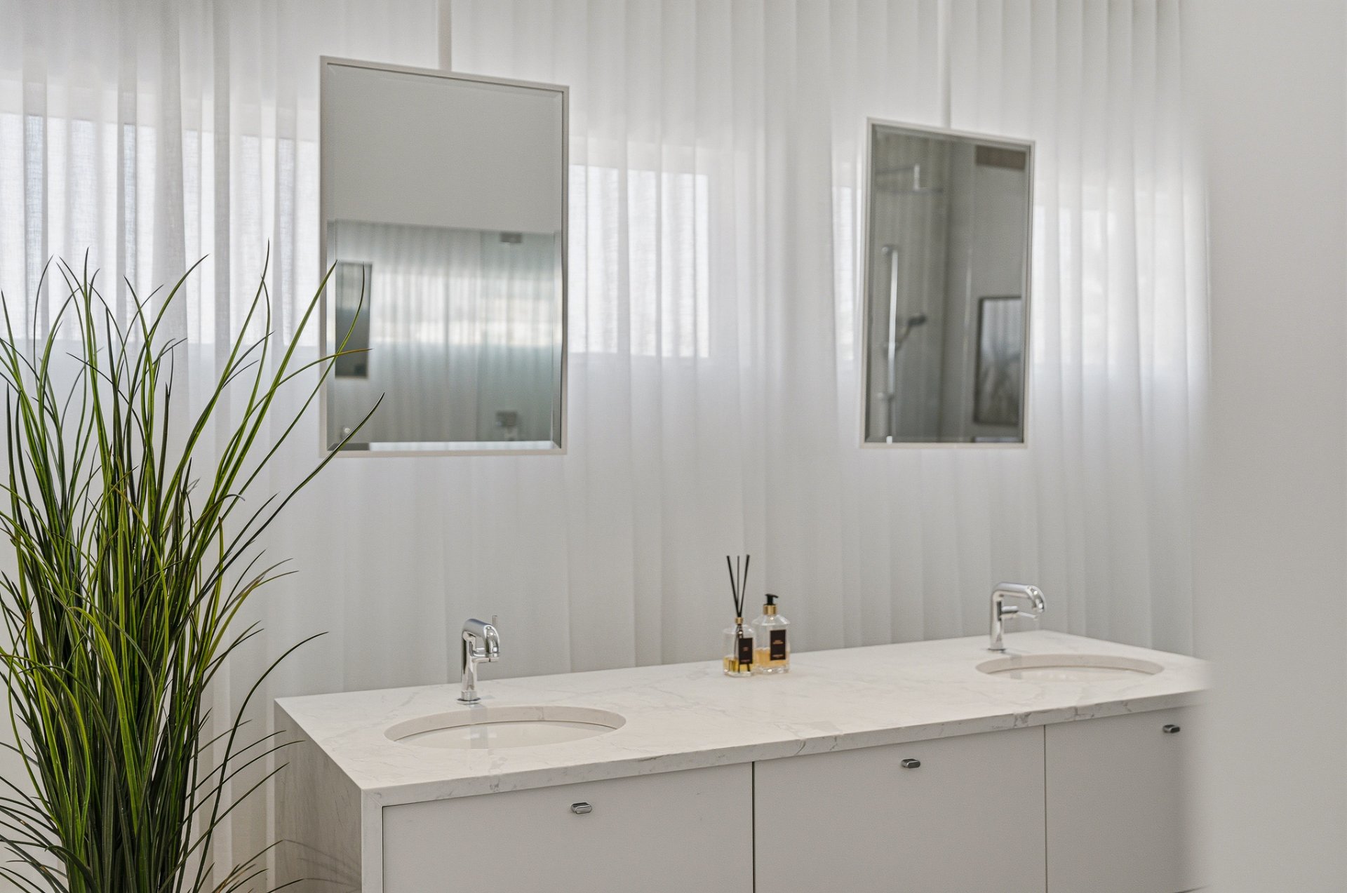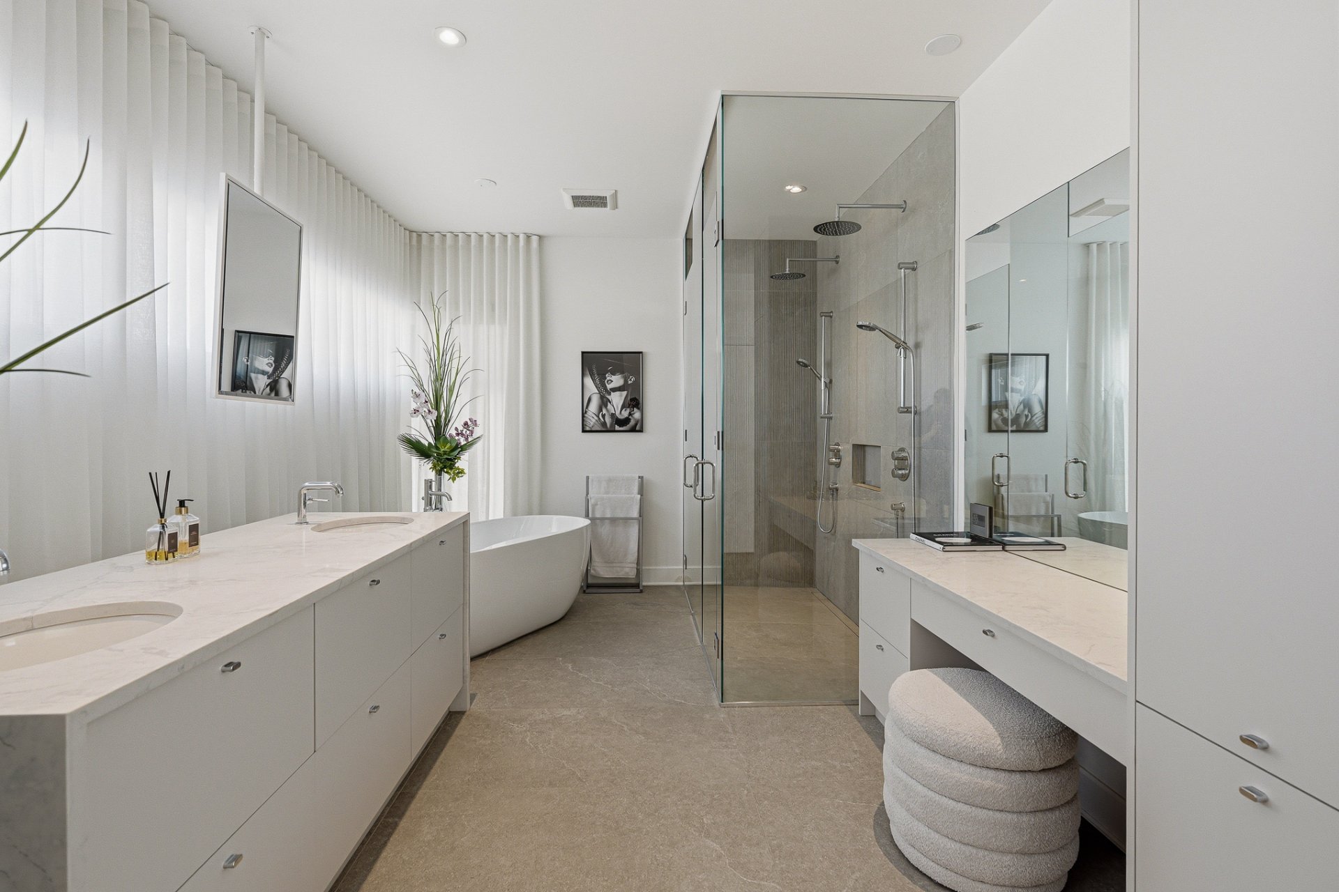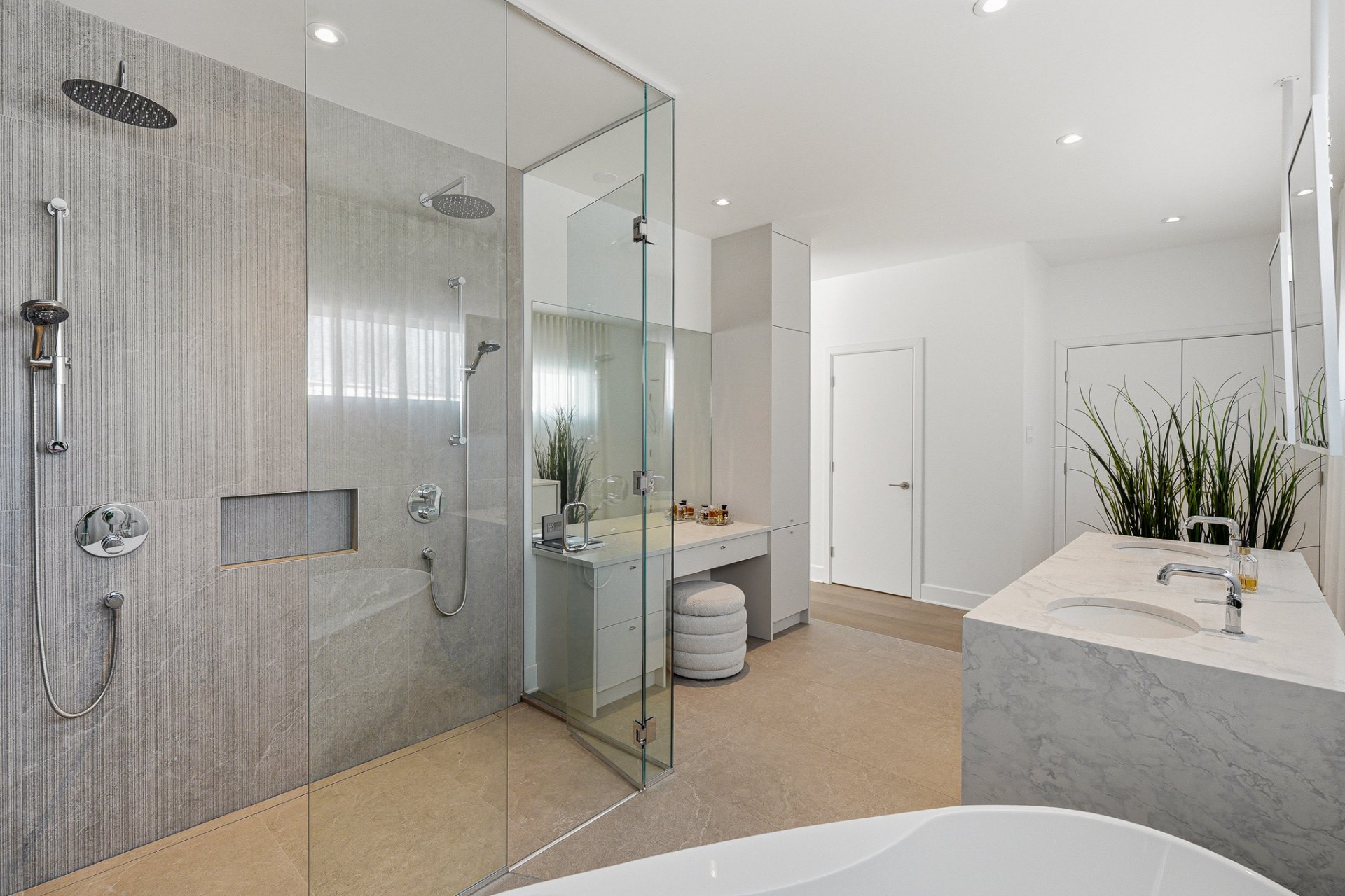 Upstairs, three bedrooms are thoughtfully designed, each with its own walk-in closet. The primary suite stands out with a spectacular ensuite bathroom featuring two separate showers, a freestanding tub, and two distinct vanity areas with suspended mirrors, creating a true private spa atmosphere. An additional full bathroom and a separate powder room complete this level.