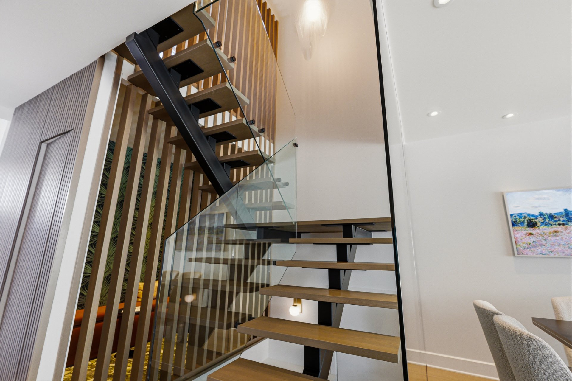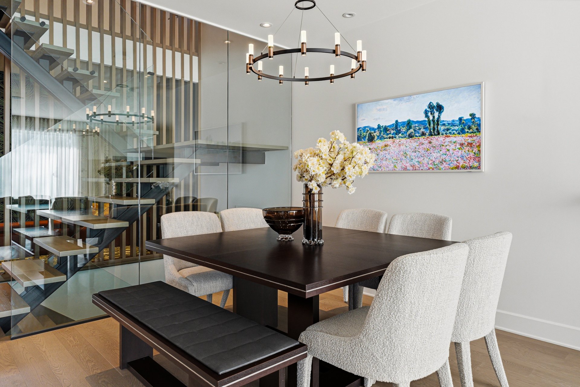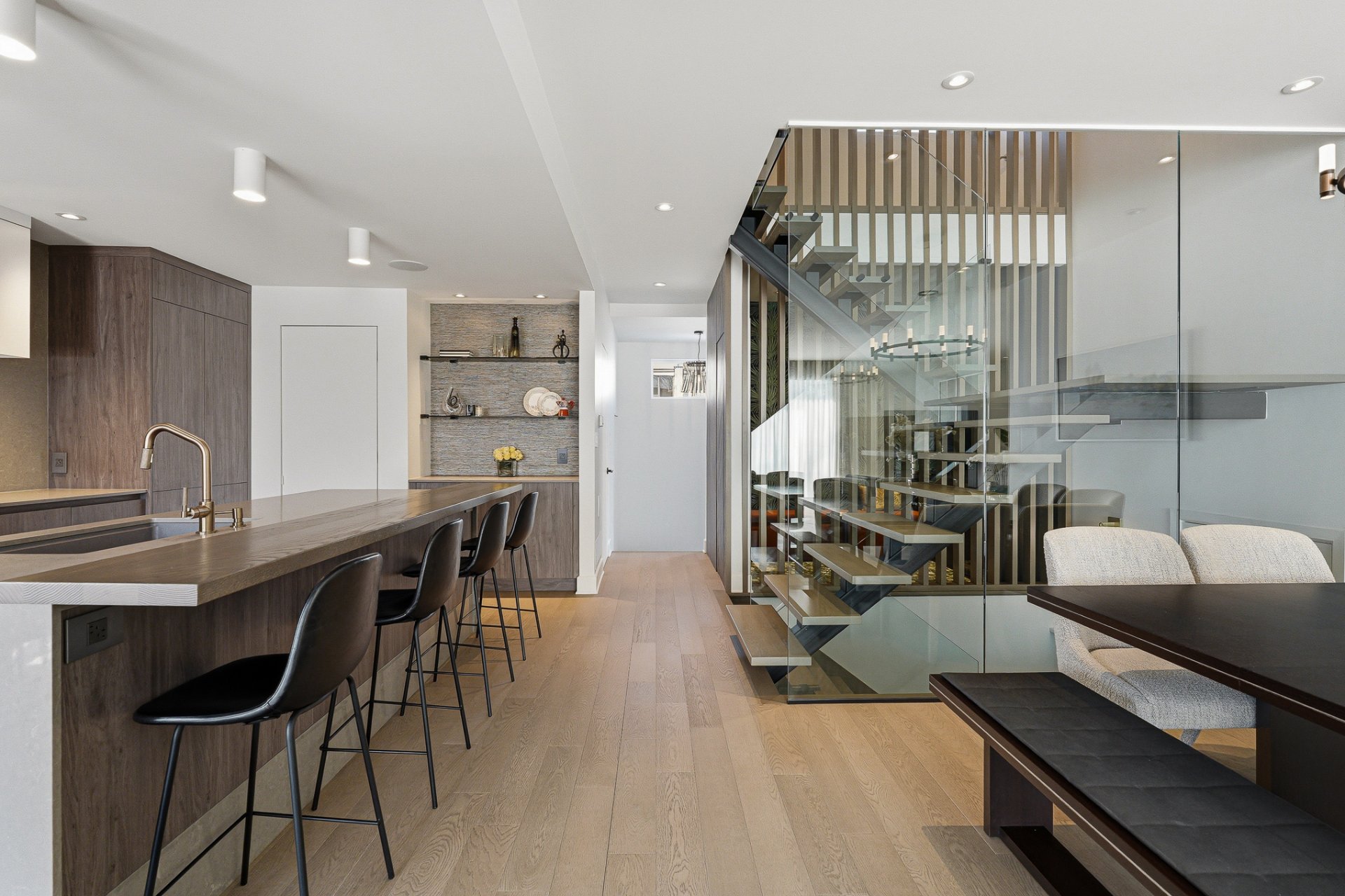 From the moment you step inside, a spacious foyer with 11-foot ceilings impresses with its volume and natural light. The integrated vestibule with built-in storage offers both functionality and elegance, while showcasing the striking central-stringer staircase with glass railings -- a true architectural statement piece.