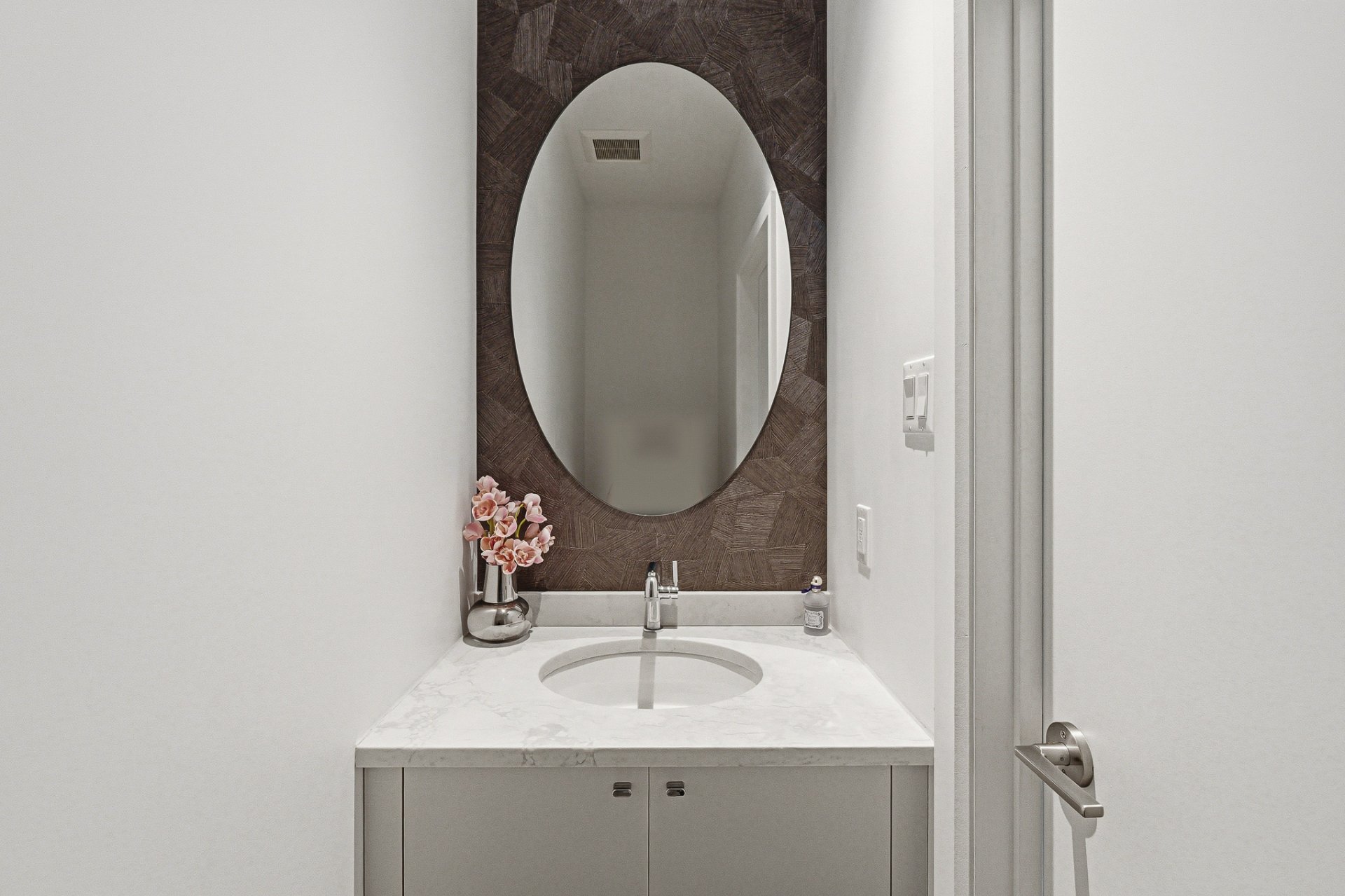 The main floor, featuring 9-foot ceilings, offers a harmonious open-concept layout that seamlessly connects the living room, dining area, and kitchen. Expansive windows flood the space with natural light, while engineered American oak hardwood floors add warmth and sophistication.
