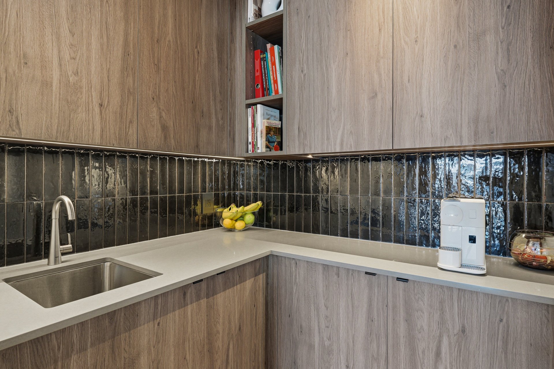The sleek, high-end kitchen is equipped with a large central island with breakfast counter, granite countertops and backsplash, and concealed appliances integrated into the cabinetry for a minimalist aesthetic. A gas range completes the space. A fully outfitted walk-in pantry with counter and sink provides additional practical and discreet workspace. The kitchen opens onto a covered terrace through a large patio door.