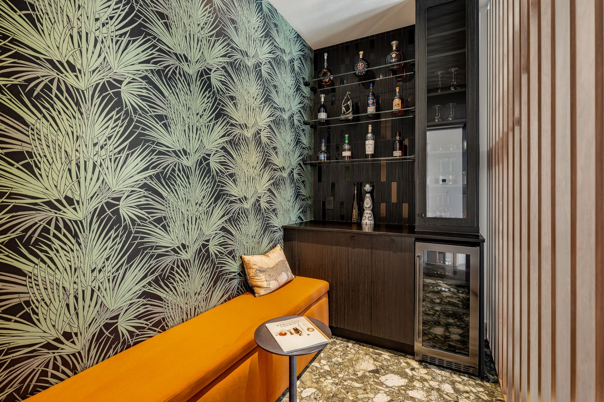 The living room offers a warm and inviting atmosphere with its wood-burning fireplace clad in Ermosa Brown marble and generous windows. A built-in two-zone speaker system (indoor and outdoor) enhances everyday living and entertaining. An elegant powder room with marble vanity completes the level, along with a speakeasy-style bar area featuring granite countertops and ample storage -- perfect for hosting memorable evenings.