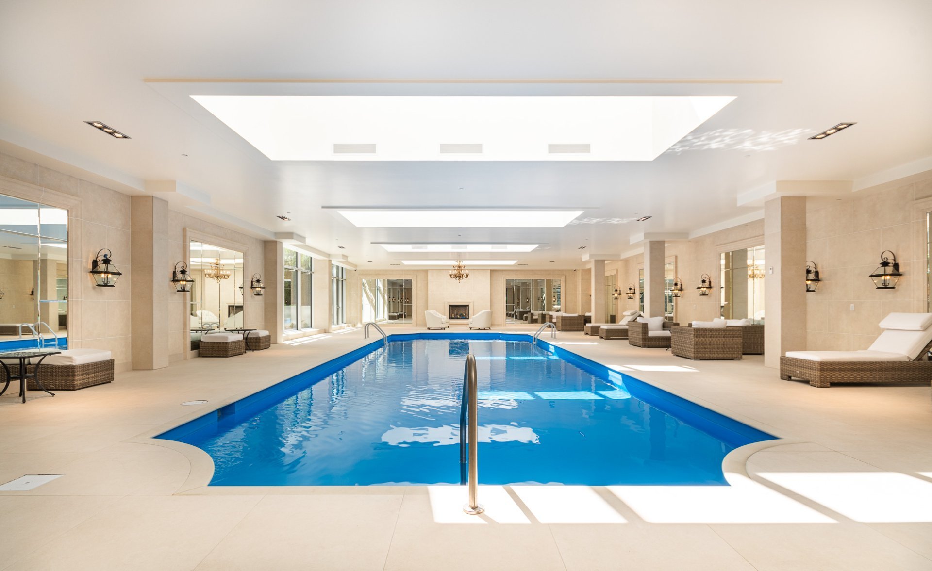 -Interior swimming pool with over sized skylights and glass on two exterior faces with fireplace in pool area.