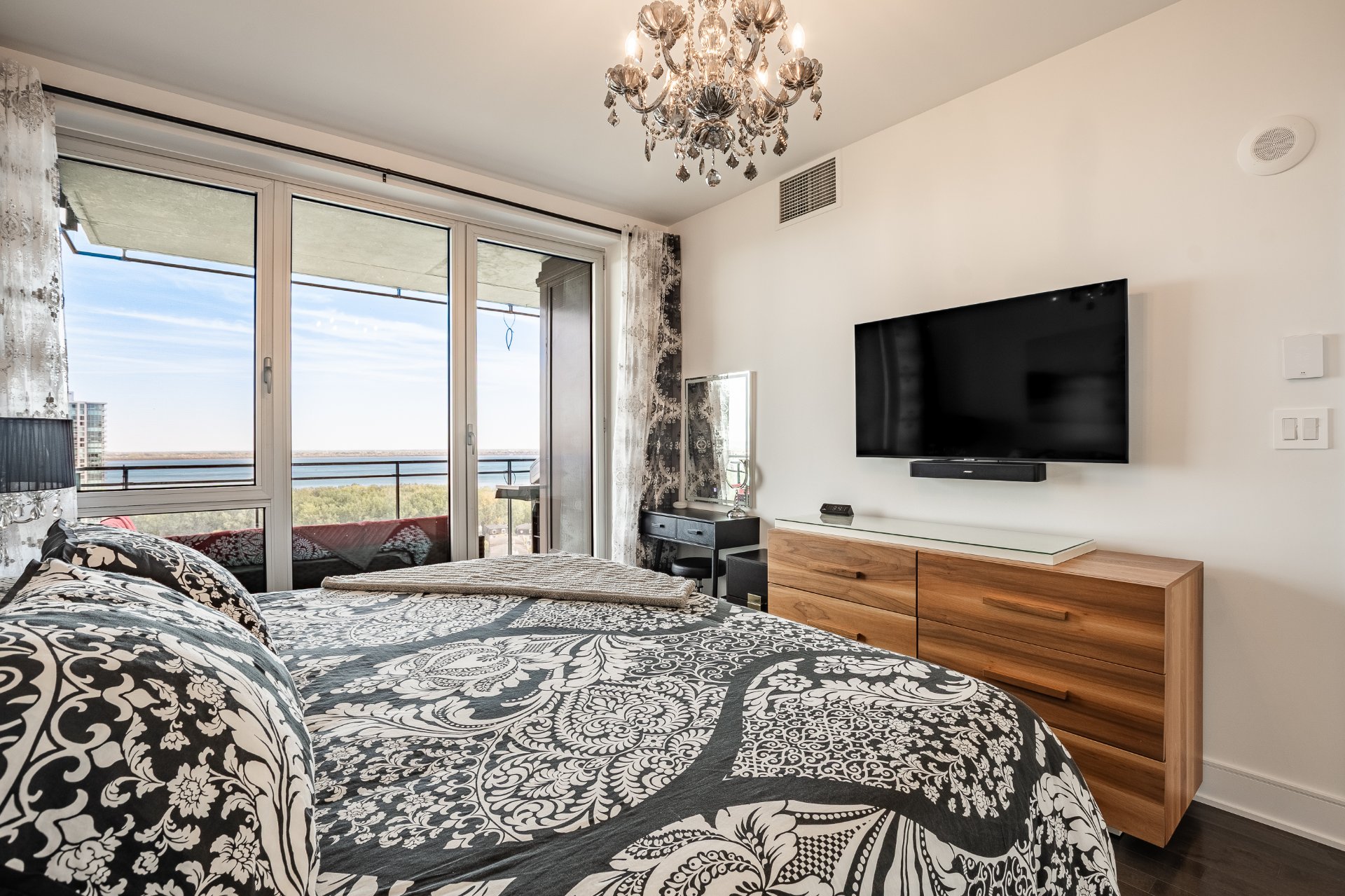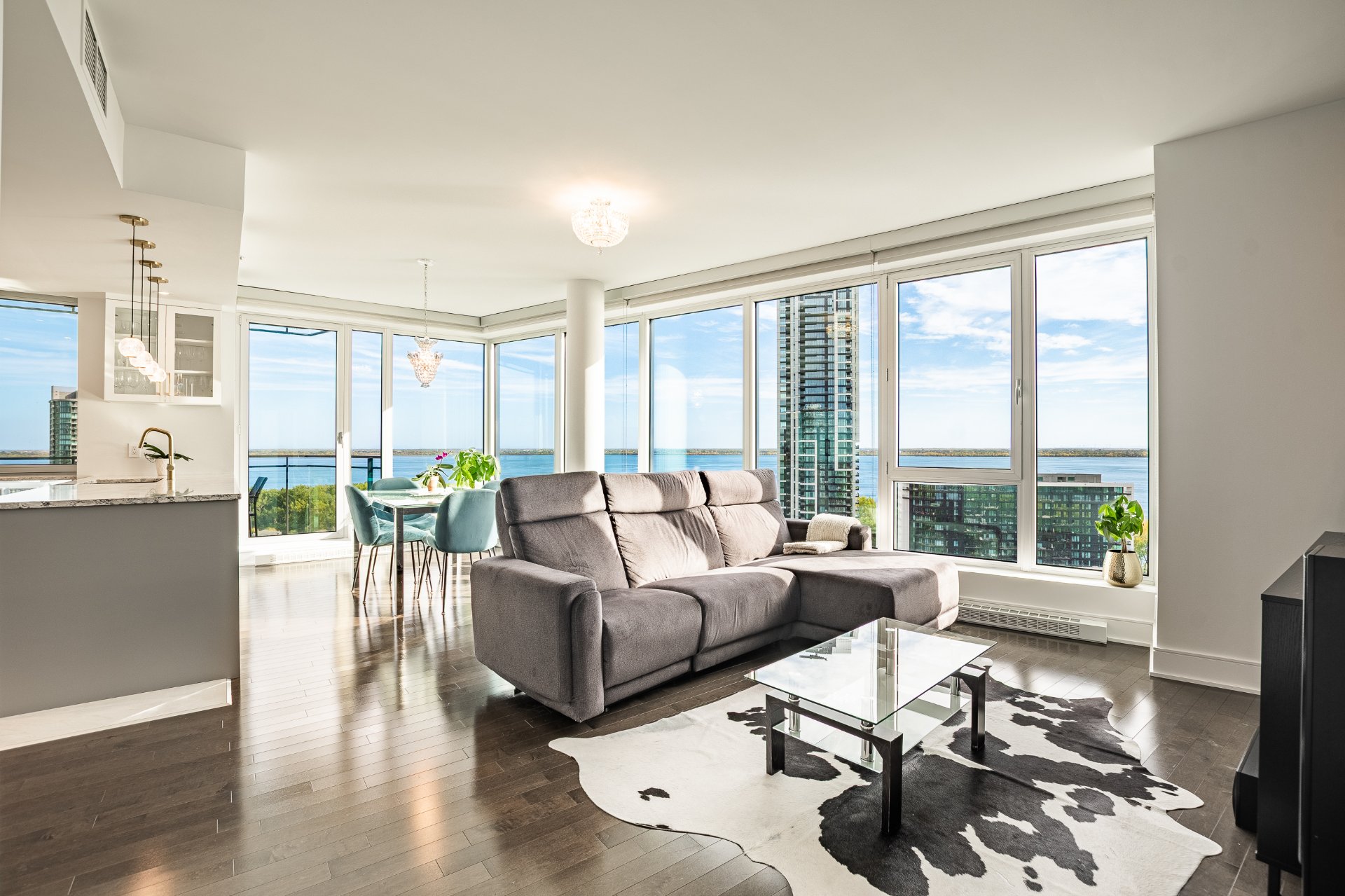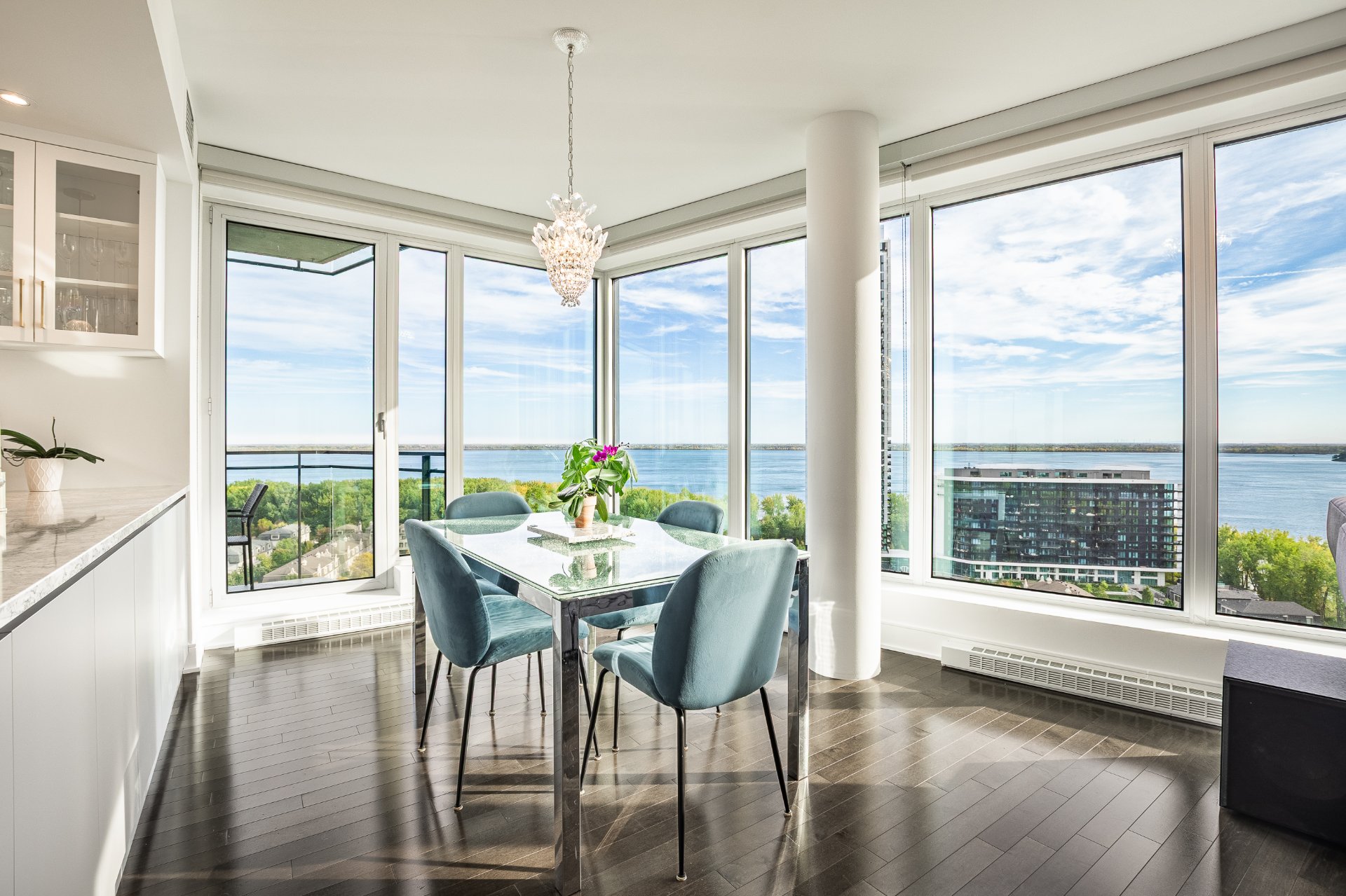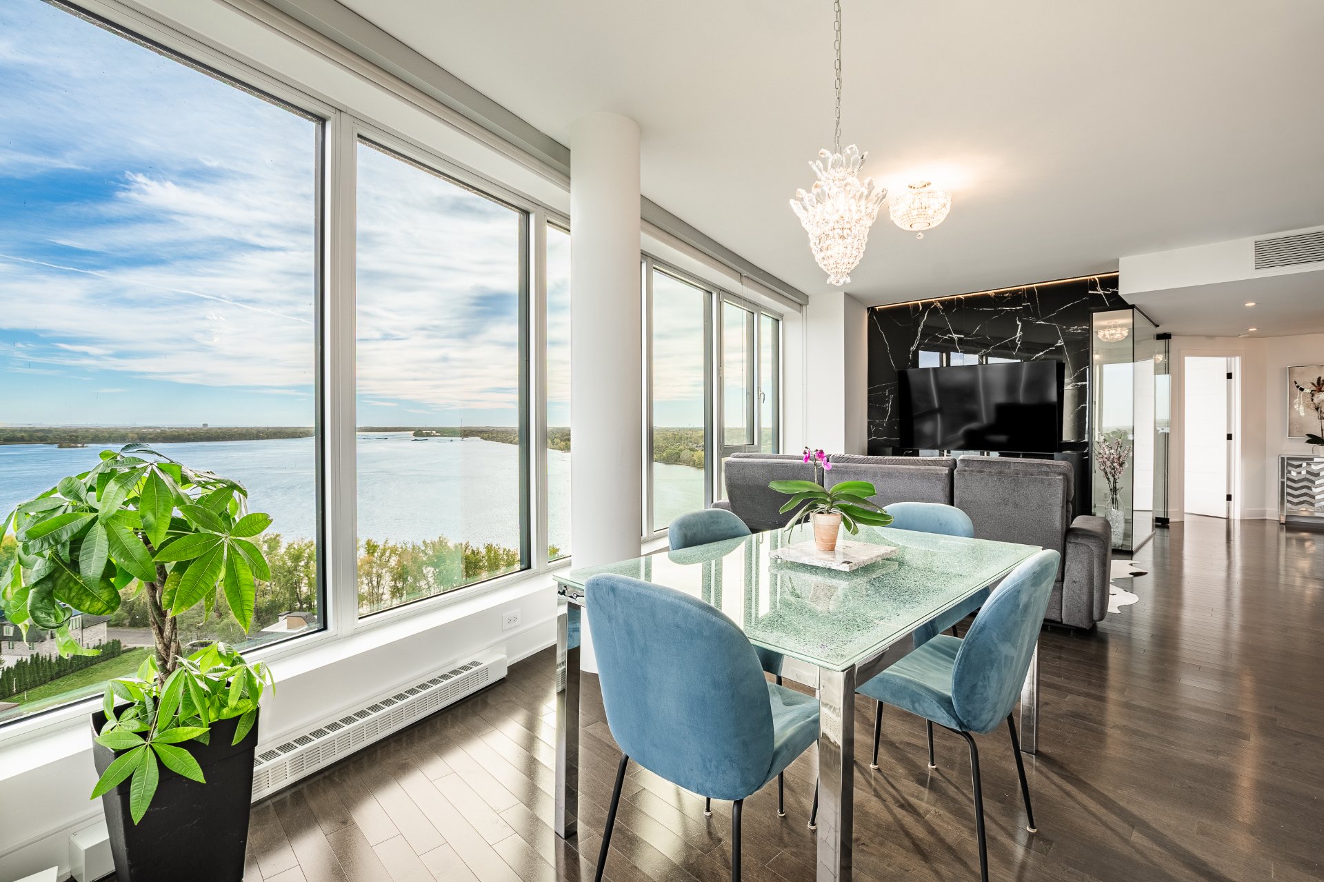 Symphonia, the jewel of the Pointe sud area of Nuns' Island, is set in a prestigious residential setting surrounded by water and greenery, offering residents exceptional views of the river and golf course. This unique unit with its sleek design captivates with panoramic views from every room and its southeast/southwest orientation, which ensures optimal sunshine throughout the day.