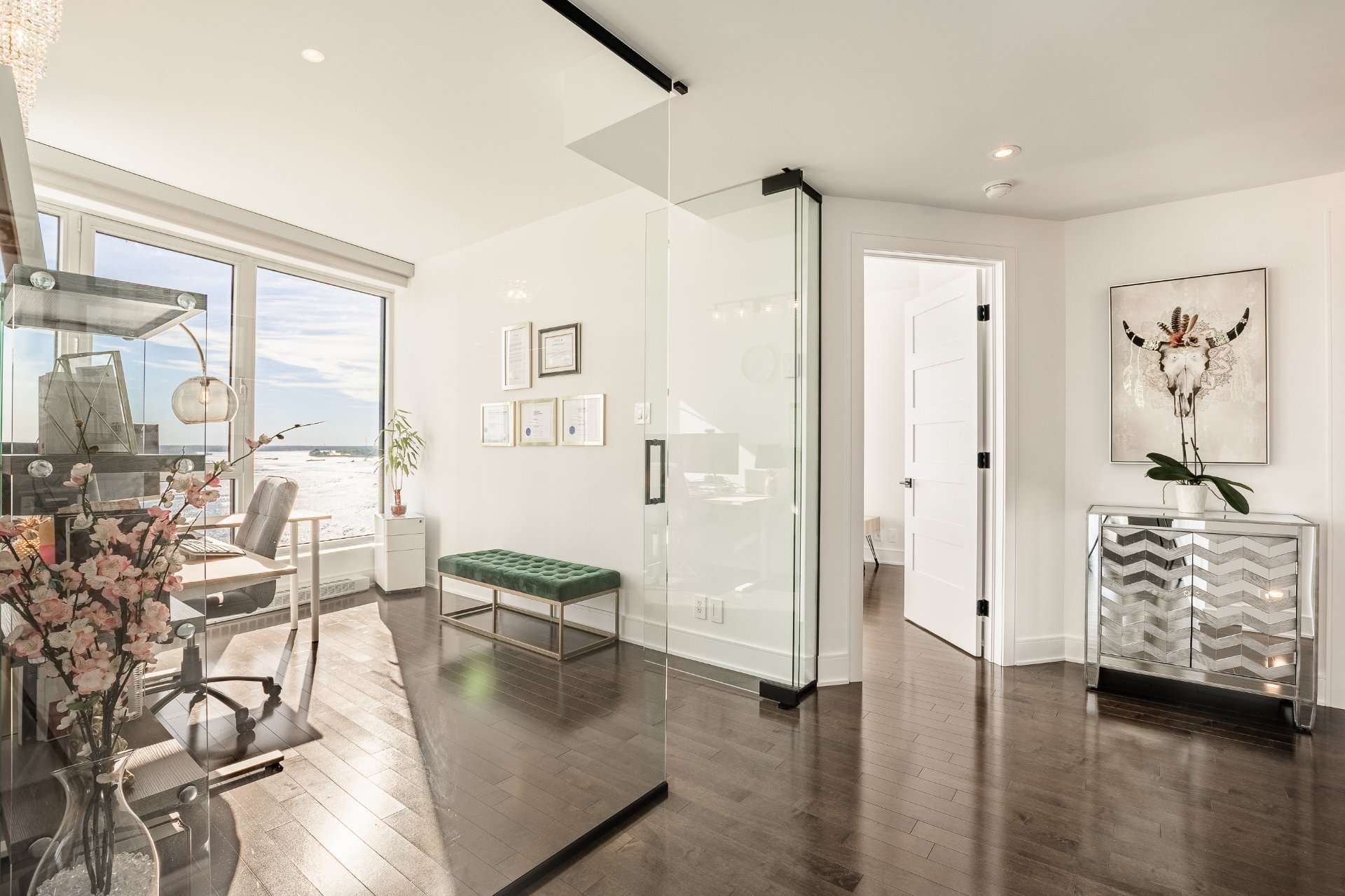 Three spacious bedrooms, one of which has been converted into an office with a glass wall. The master suite offers a walk-in closet and en-suite bathroom, while the second bedroom also benefits from beautiful river views.