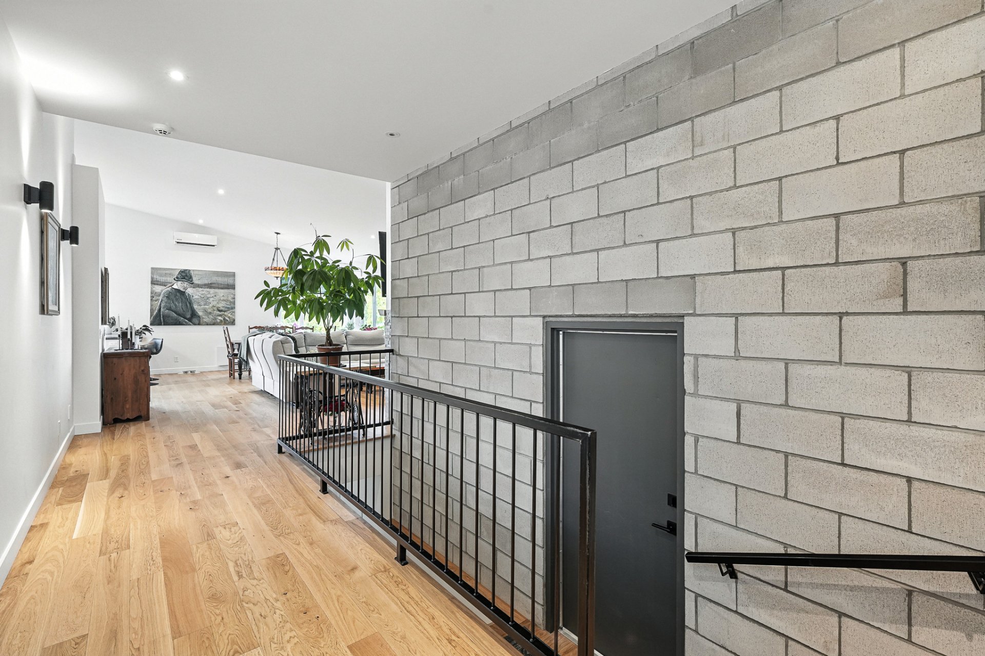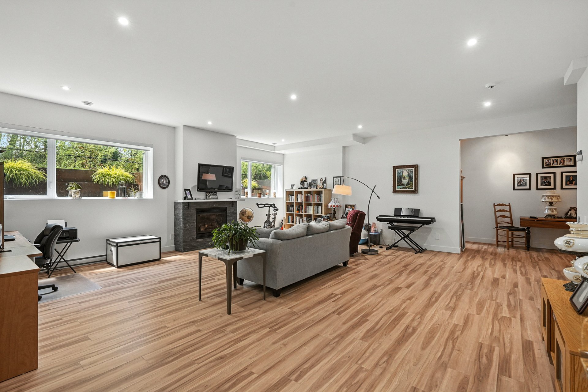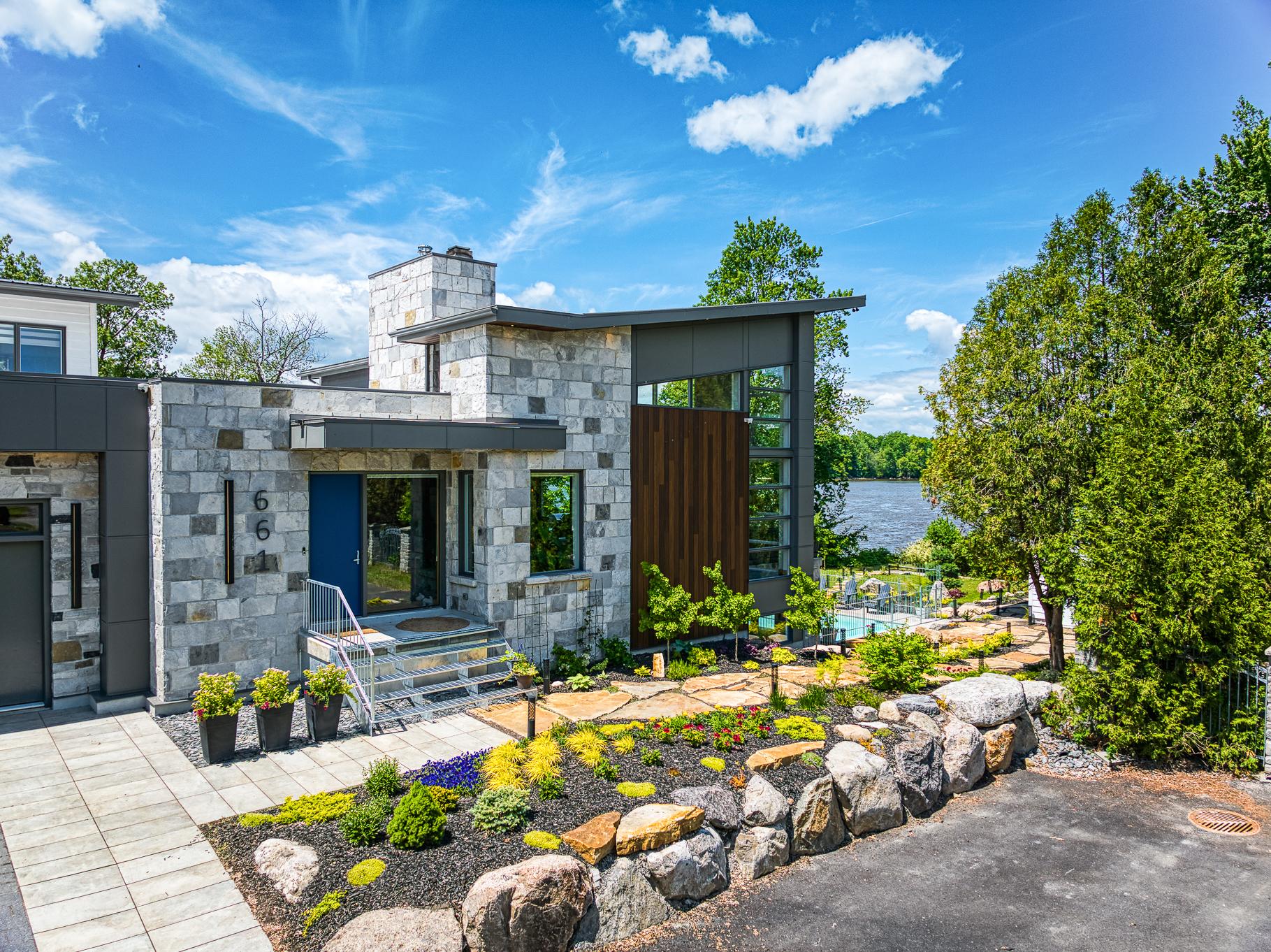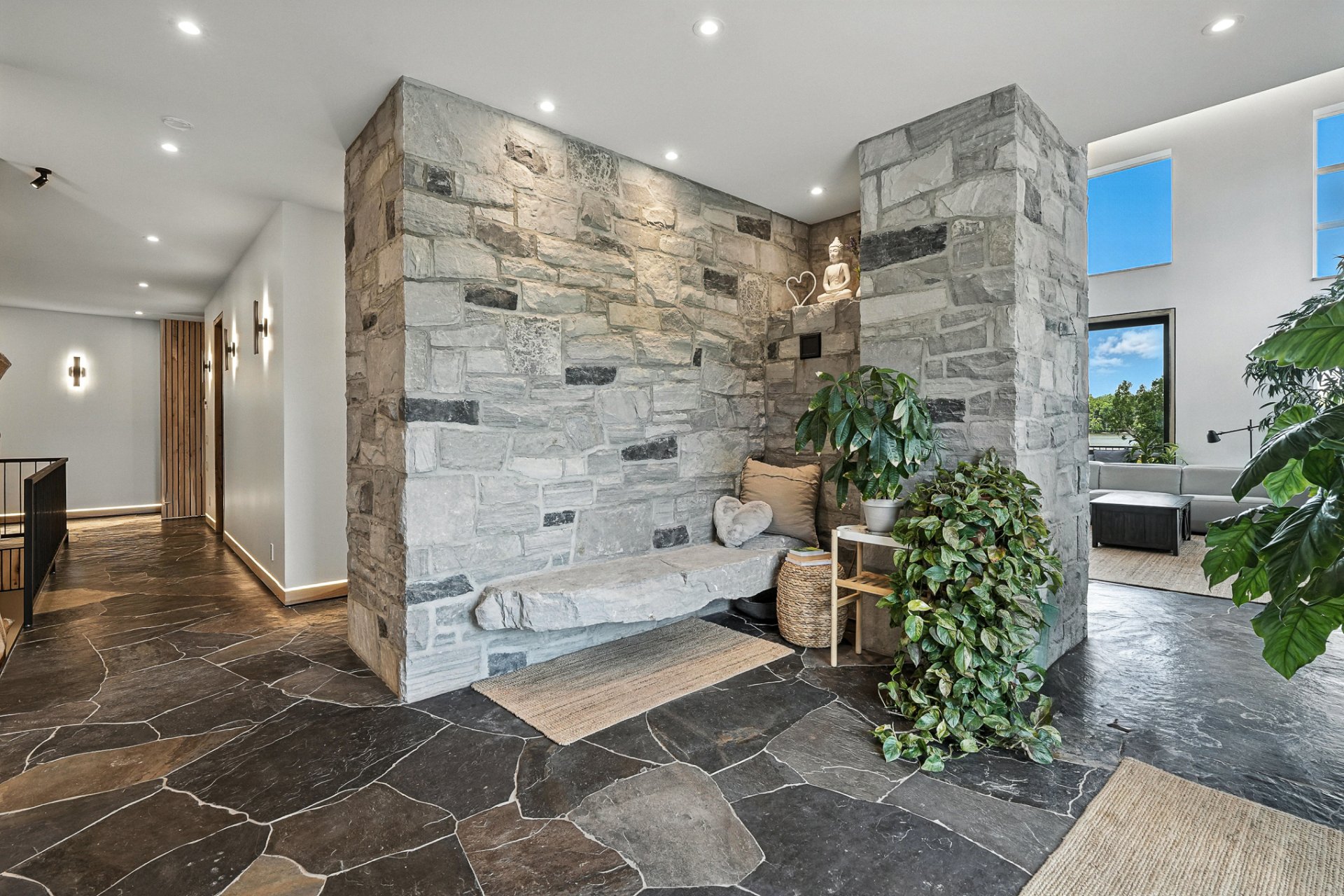 Discover this intergenerational property along the Mille-Îles River, where contemporary architecture blends harmoniously with noble materials and a unique artisanal concept. The natural stone entrance and its cantilevered bench integrated into the fireplace create a truly remarkable setting.