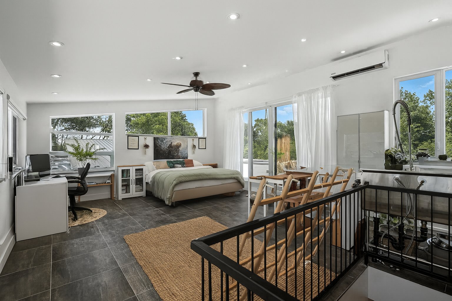 The main floor boasts ceilings over 9feet high and is bathed in light thanks to abundant windows offering stunning views of the outdoors. The living room stands out with its solid ash ceiling, reclaimed on site and crafted in place, adding natural warmth and an eco-friendly touch to the space. The large 24-foot patio door elegantly connects the interior to one of the terraces.
