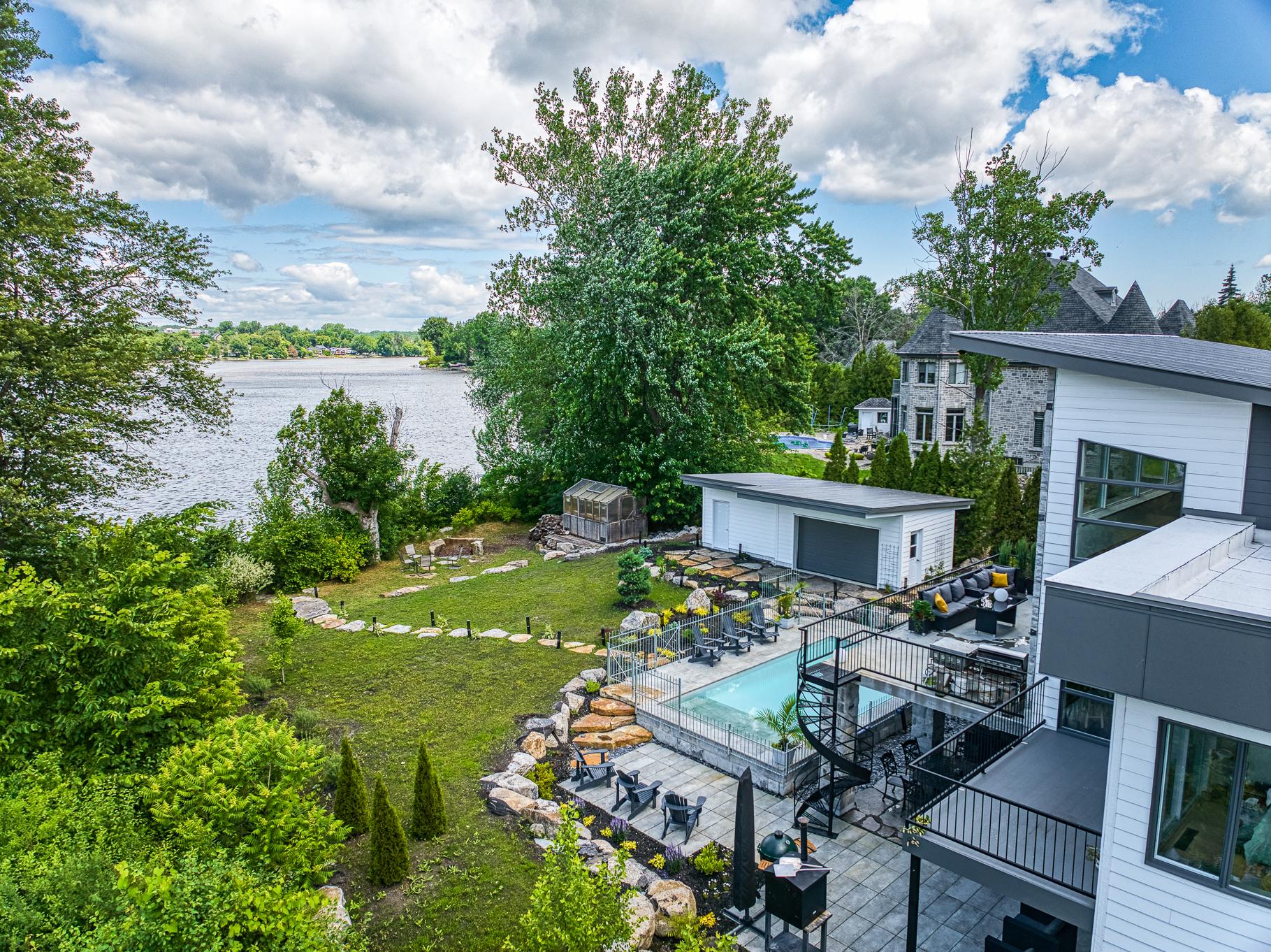 Discover this exceptional intergenerational property on the shores of the Rivière des Mille-Îles. Its contemporary architecture showcases noble materials and remarkable artisanal craftsmanship: a hall with stone fireplace, heated slate flooring, living room with reclaimed ash wood ceiling, and a high-end kitchen with concrete island. Features include a floating staircase, concrete window seats, five bedrooms each with a private bathroom, three terraces, a pool house, an in-ground pool, and the possibility of installing a dock.