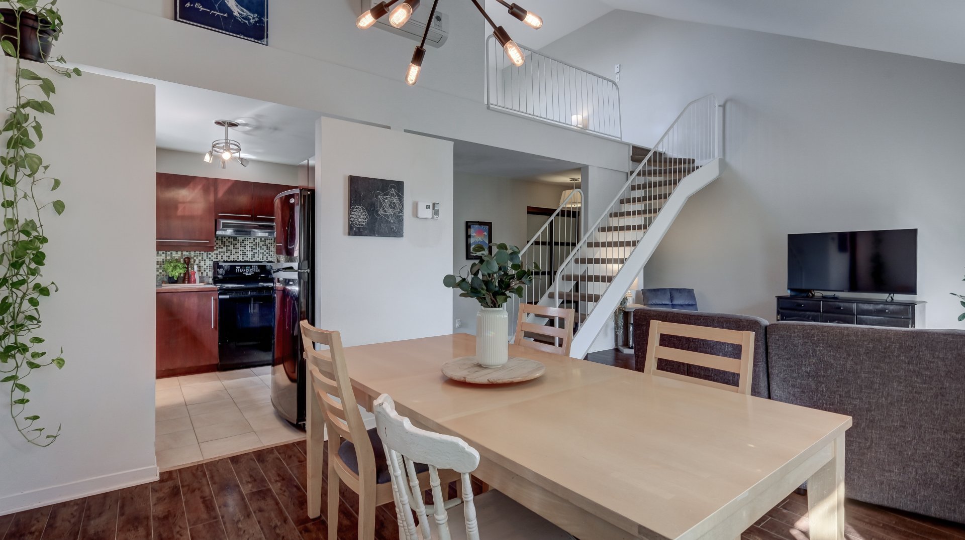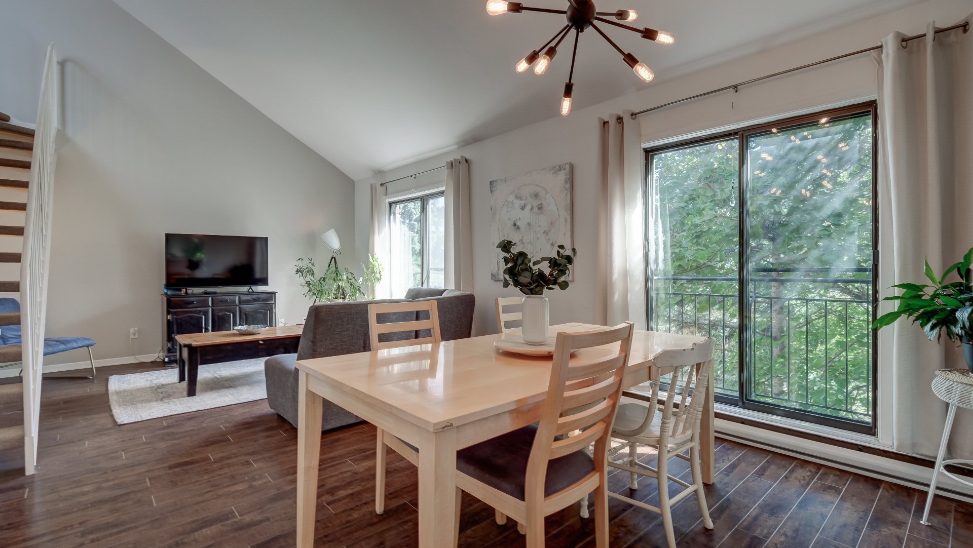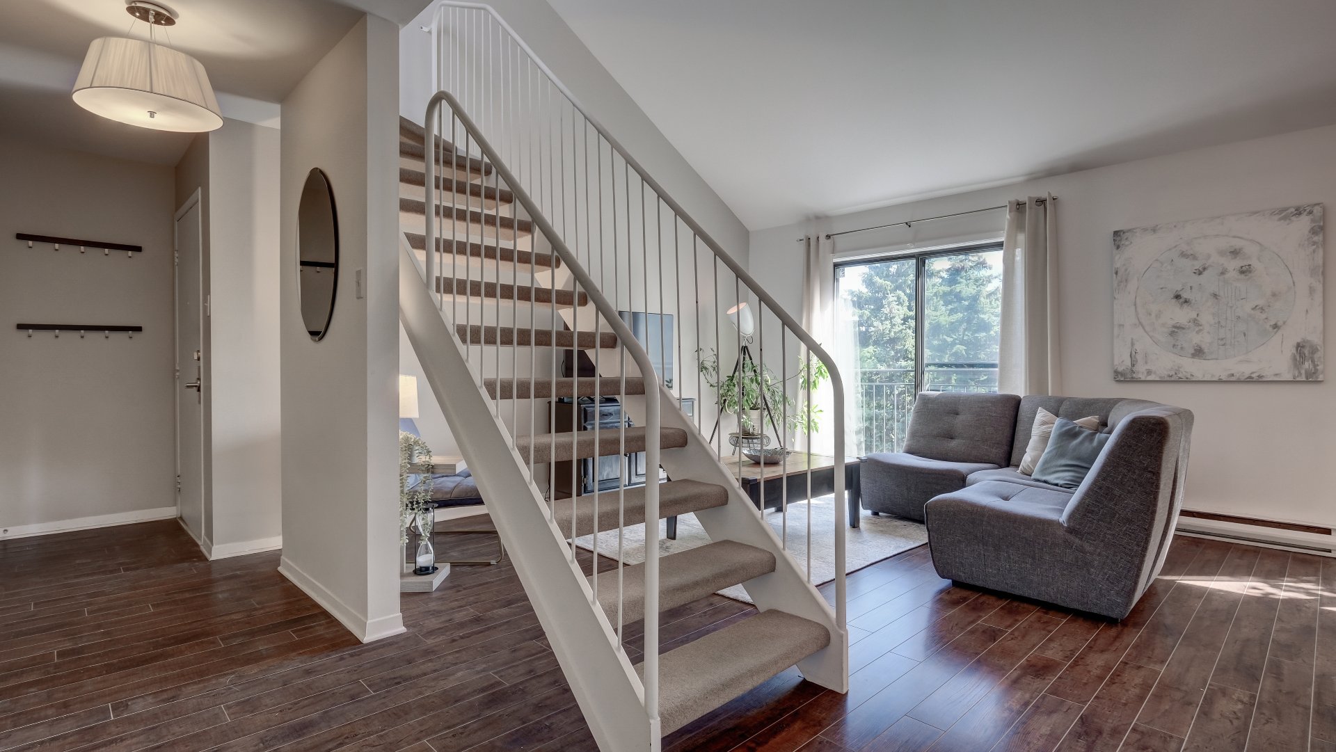 Beautiful two-story condominium located in a peaceful complex with a central park. The property offers two good-sized bedrooms, including a master bedroom with a walk-in closet, as well as a versatile mezzanine that can be used as an office, family room, or playroom. Abundant natural light on all levels. You will enjoy a separate laundry room, plenty of storage space, including storage in the garage, and an indoor garage. The mezzanine provides access to a pleasant private terrace with an unobstructed view of Montreal. Strategic location.