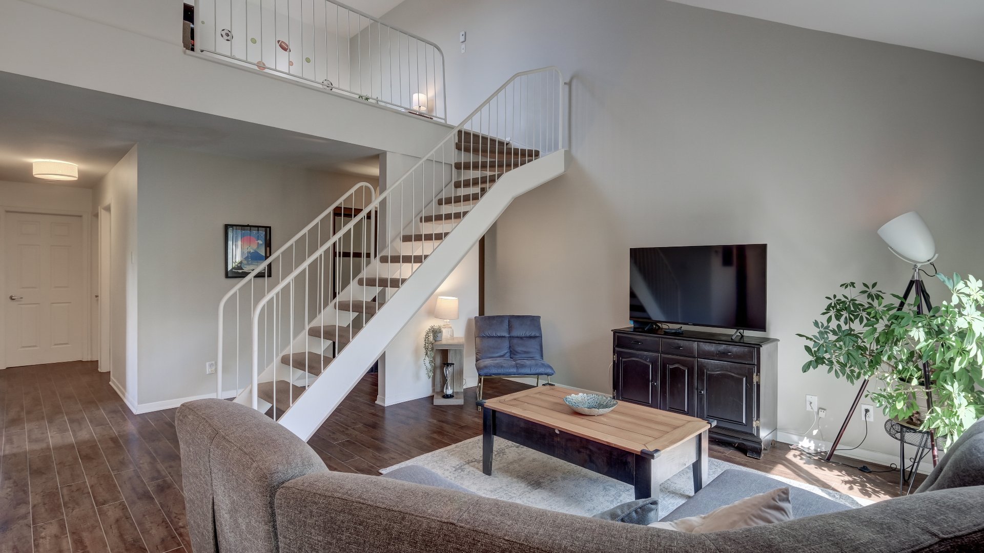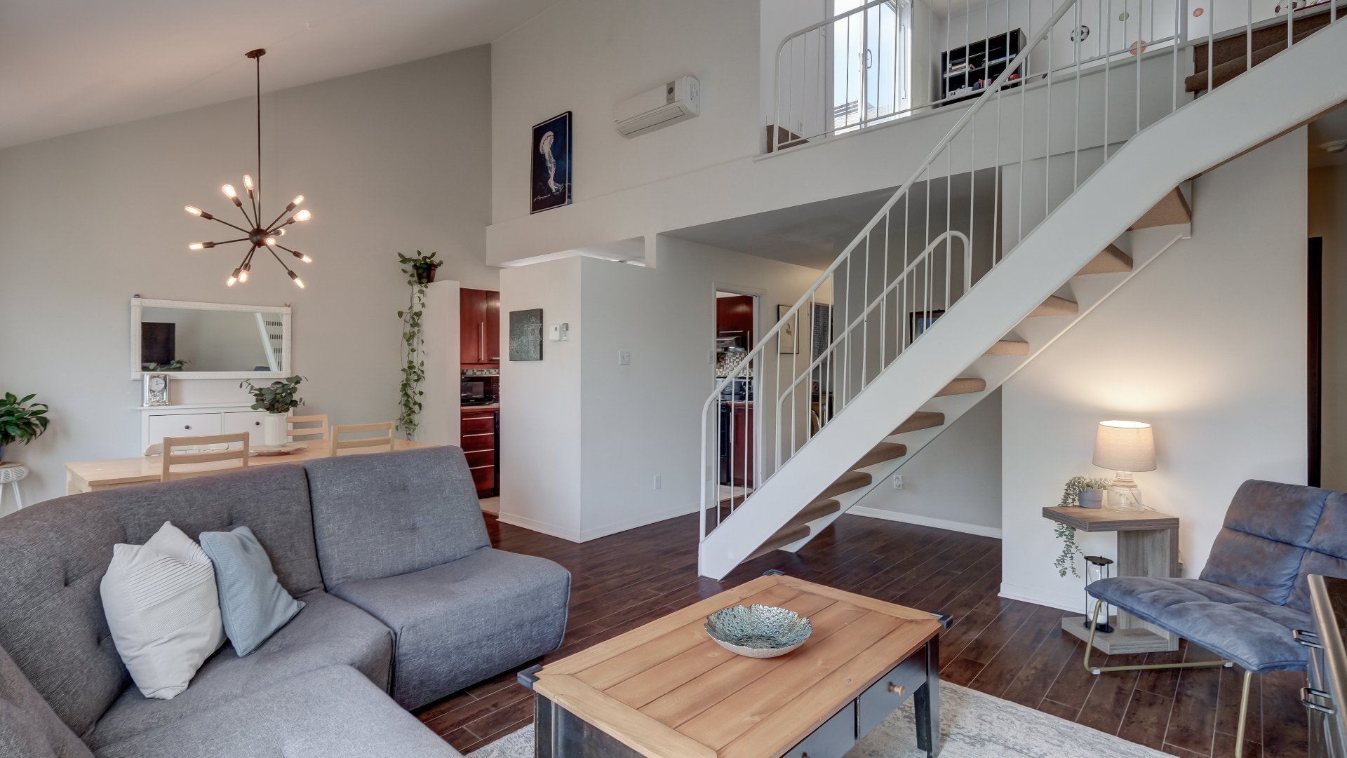 Spacious two-story condo with mezzanine and private terrace offering unobstructed views of Montreal.