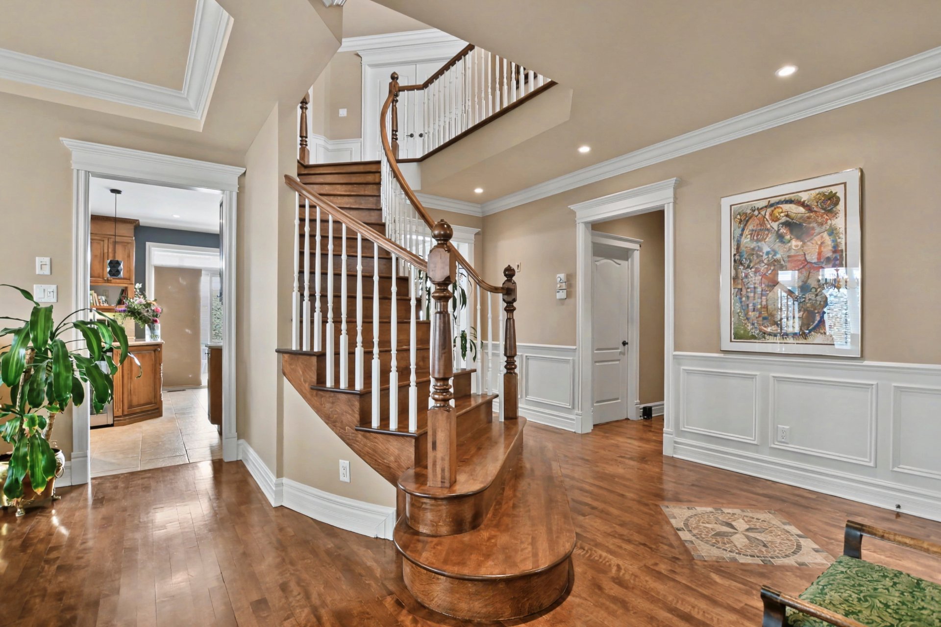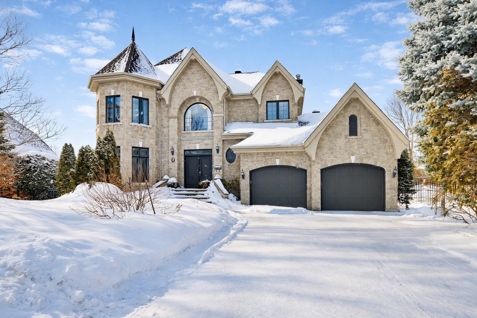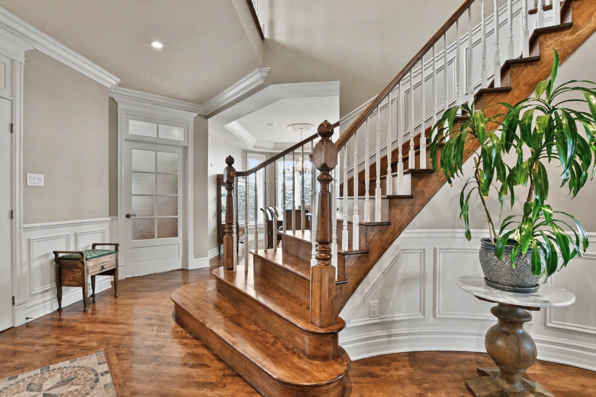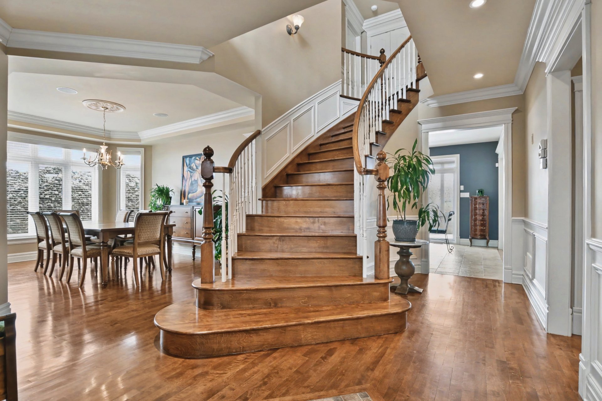From the moment you step inside, you are welcomed by a spacious vestibule with walk-in closet, generous living areas, 9-foot ceilings on the main floor and 10-foot ceilings in the living room, a majestic stone fireplace façade, and a grand curved staircase.