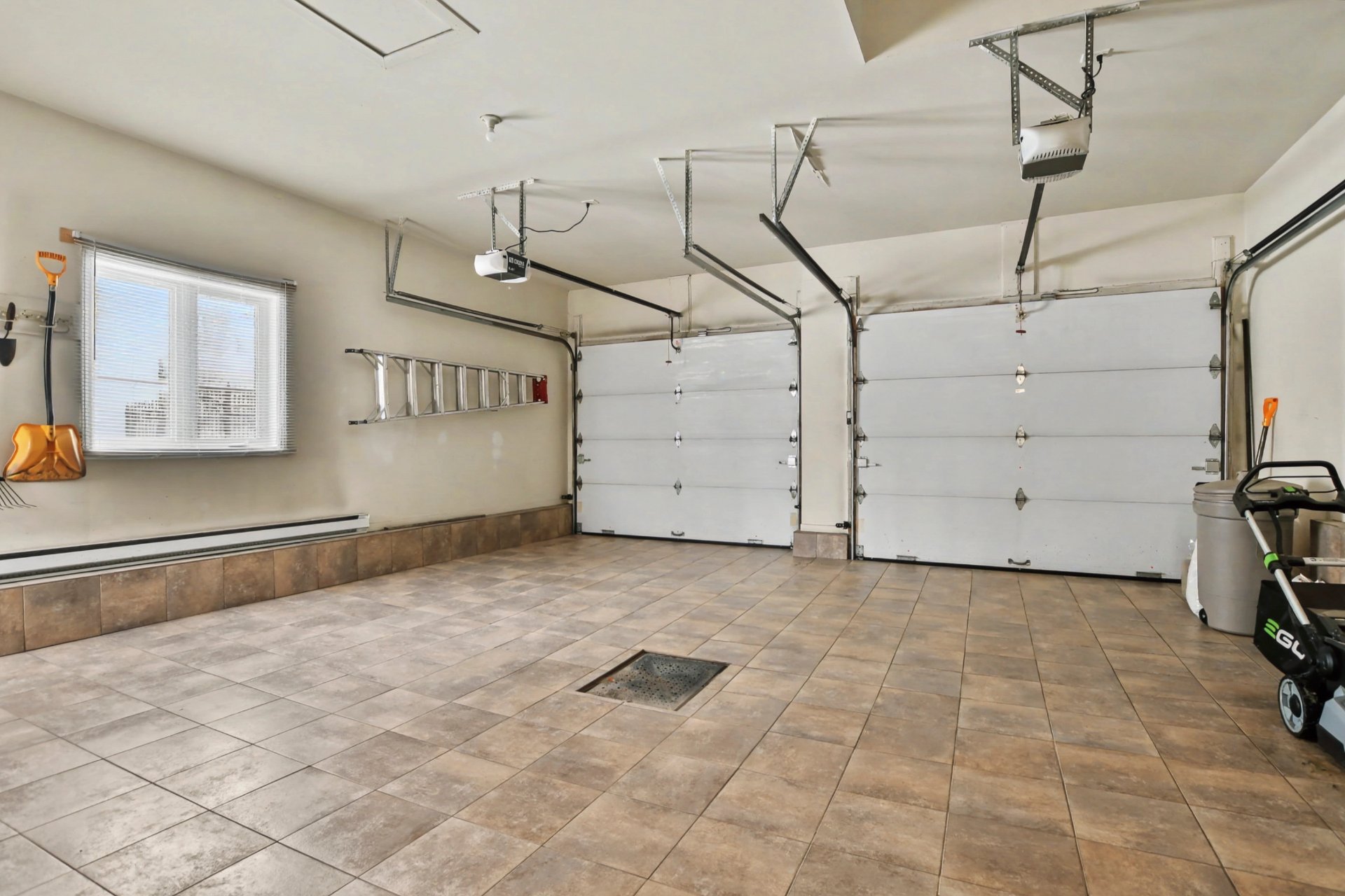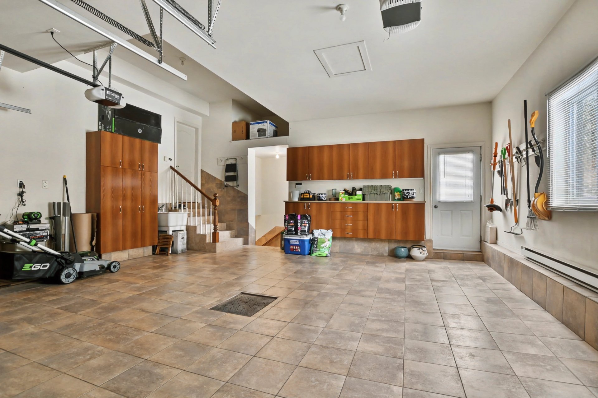The double garage is impressive with its full ceramic finish, including the stairway leading to the basement, numerous storage cabinets, and a practical utility sink.