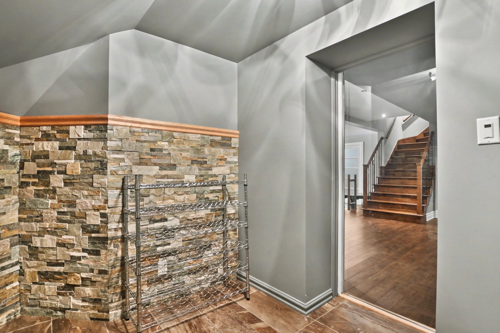The fully finished basement features a spacious family room, one additional bedroom with the possibility of a second, a wine cellar with stone walls, and a full bathroom.