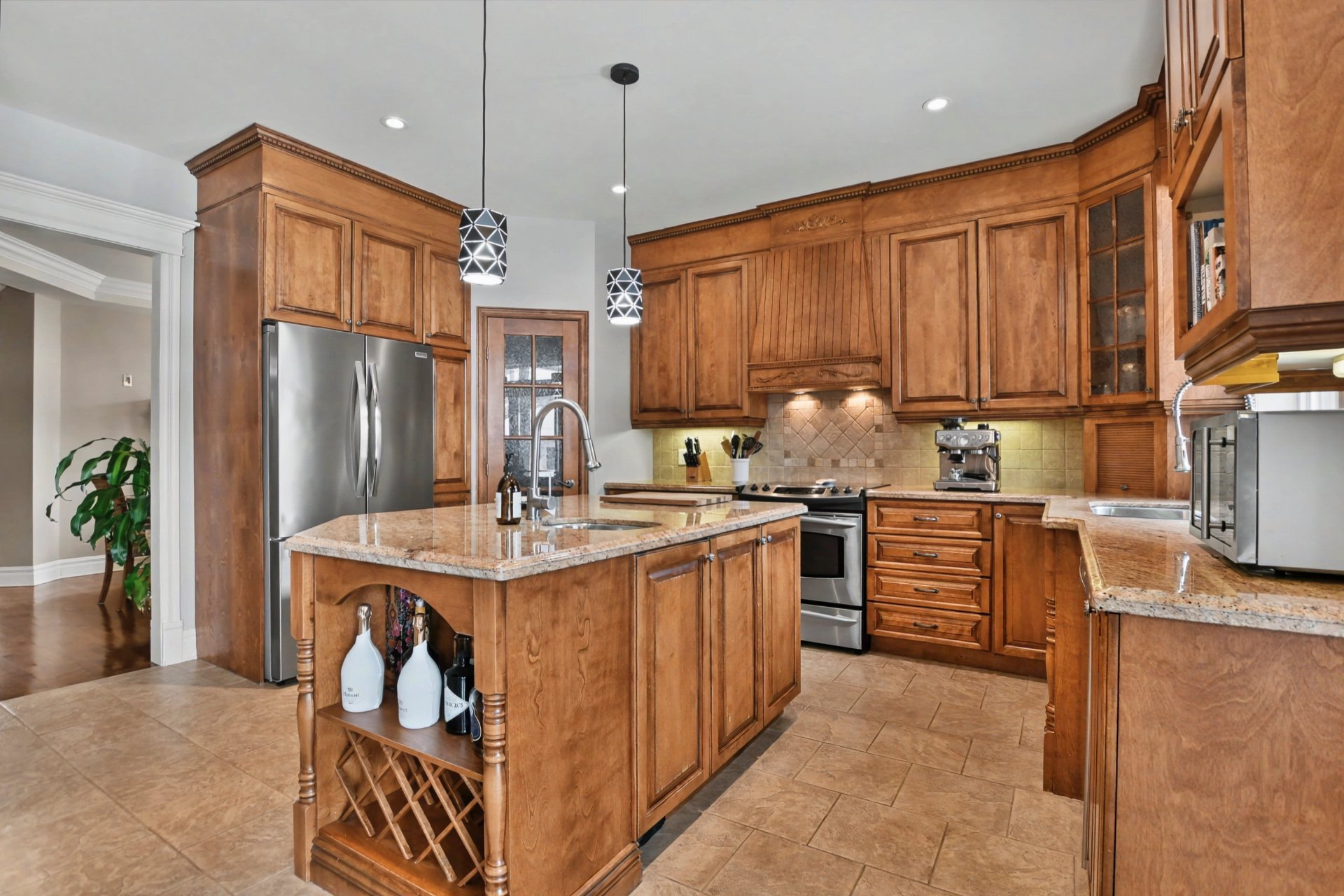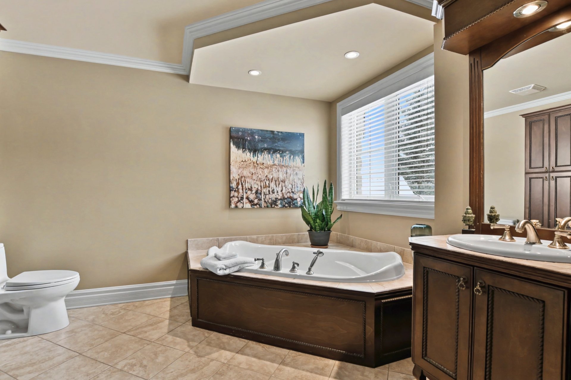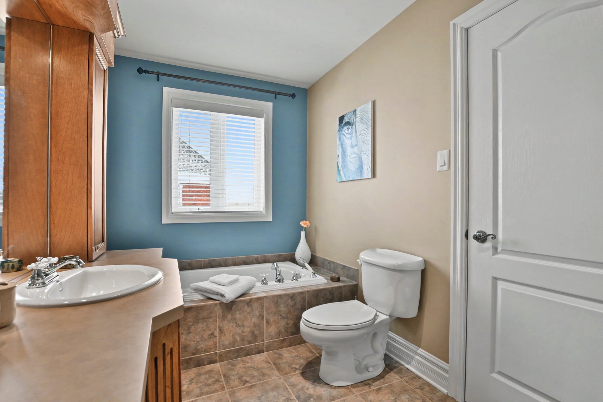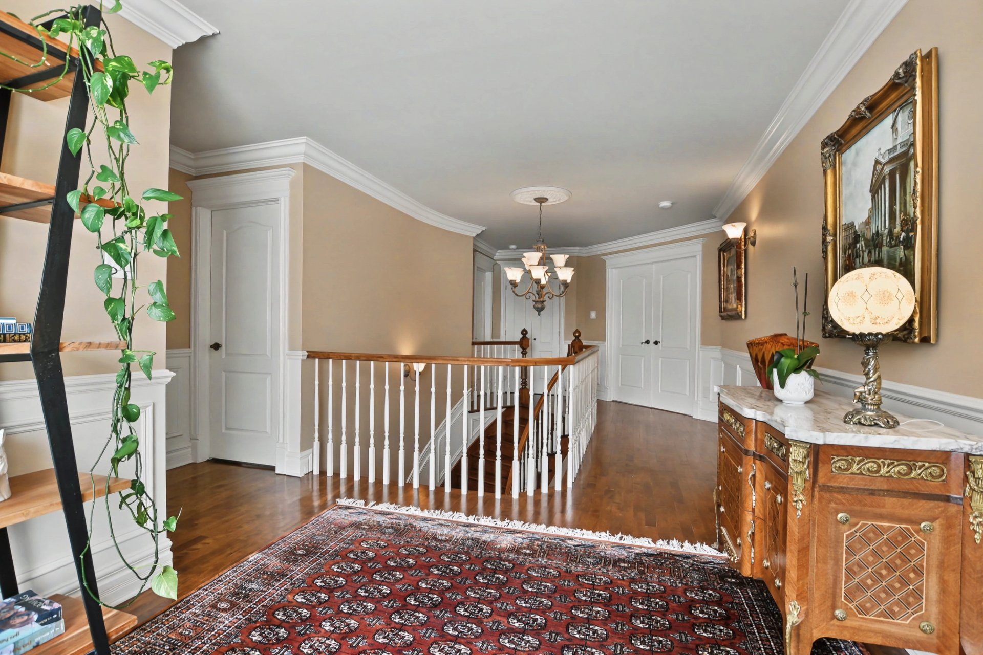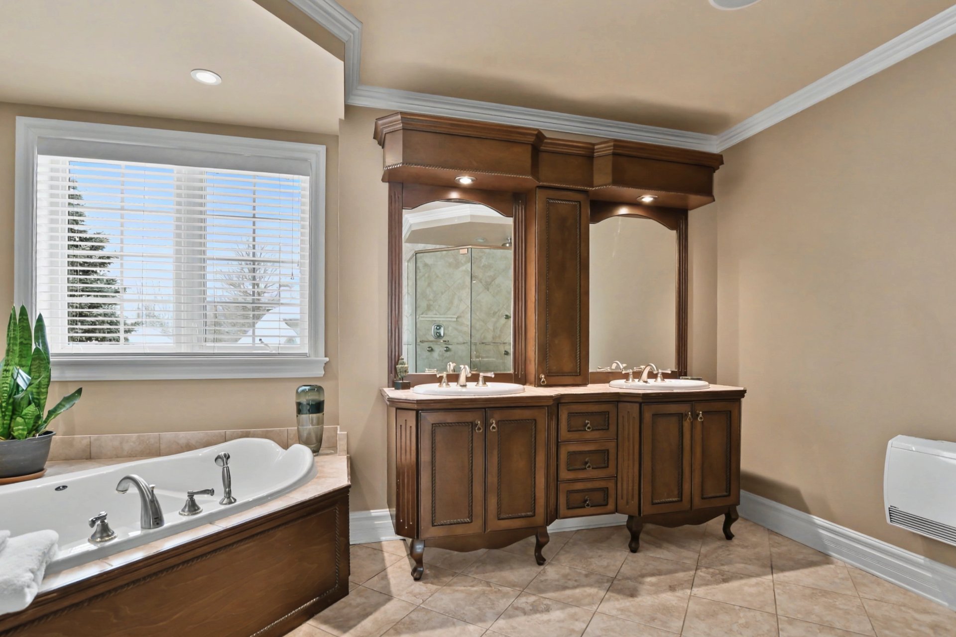 Upstairs, you will find three large bedrooms, along with a boudoir that can easily be converted into a home office or reading nook. The primary suite stands out with its two walk-in closets and private ensuite bathroom offering a large glass and ceramic shower with multi-jet system. A second full bathroom serves the other two bedrooms.