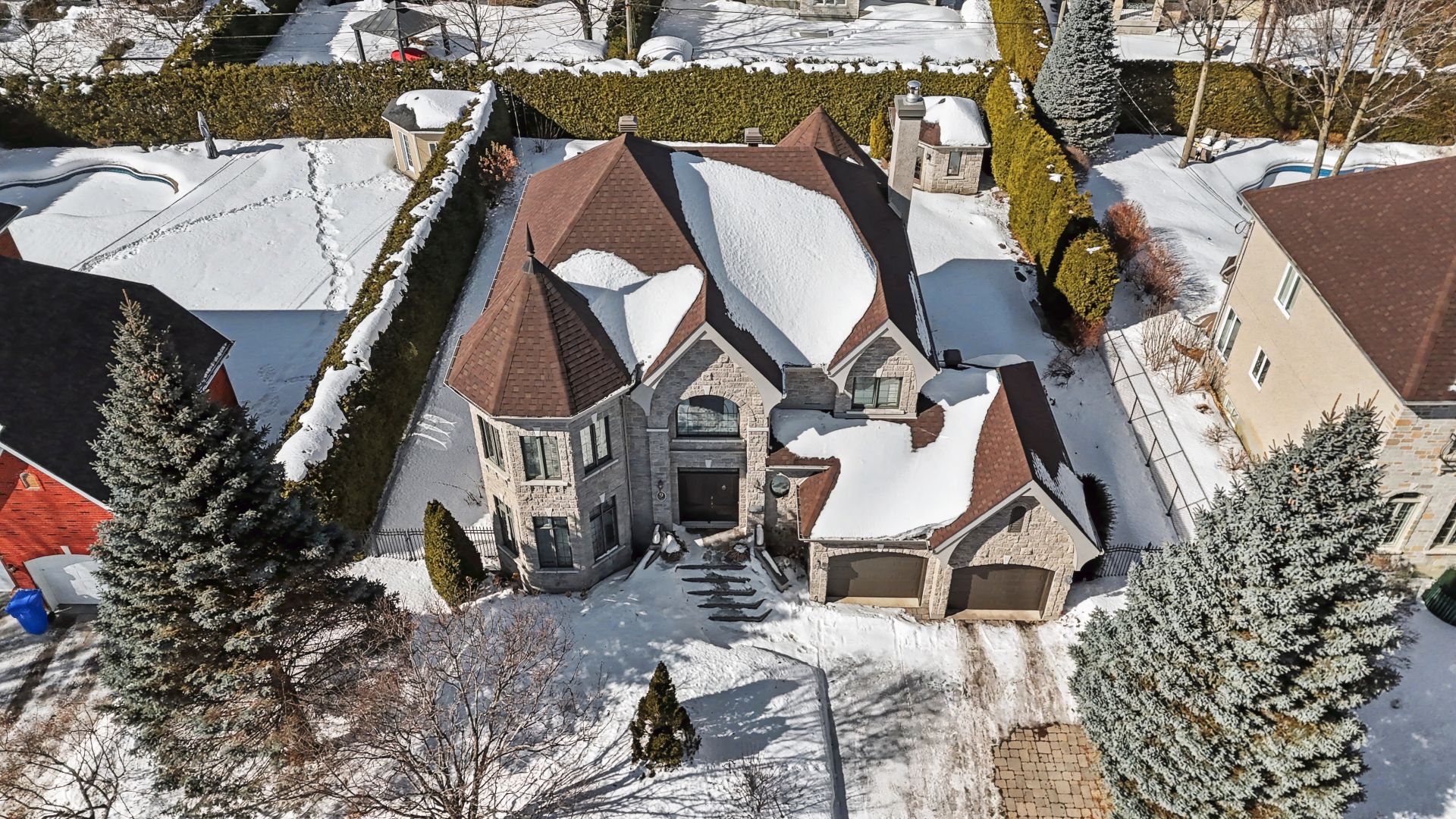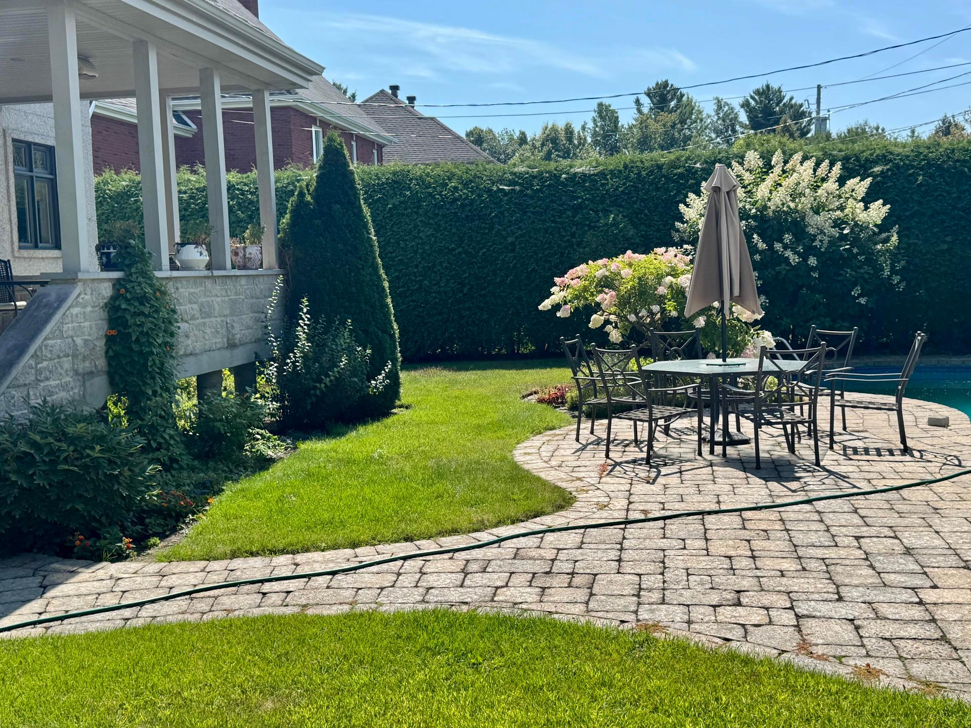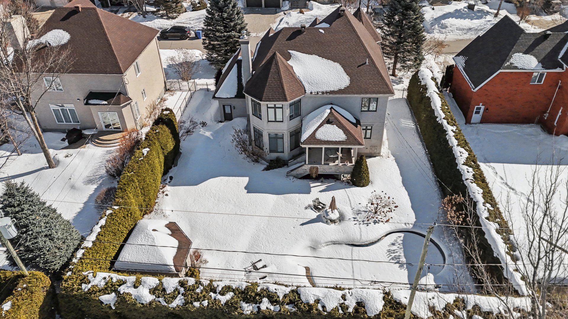 Outside, the professionally landscaped backyard creates a truly exceptional setting: a covered terrace with half stone wall, a natural gas heated in-ground saltwater pool, and mature cedar hedges ensuring remarkable privacy.