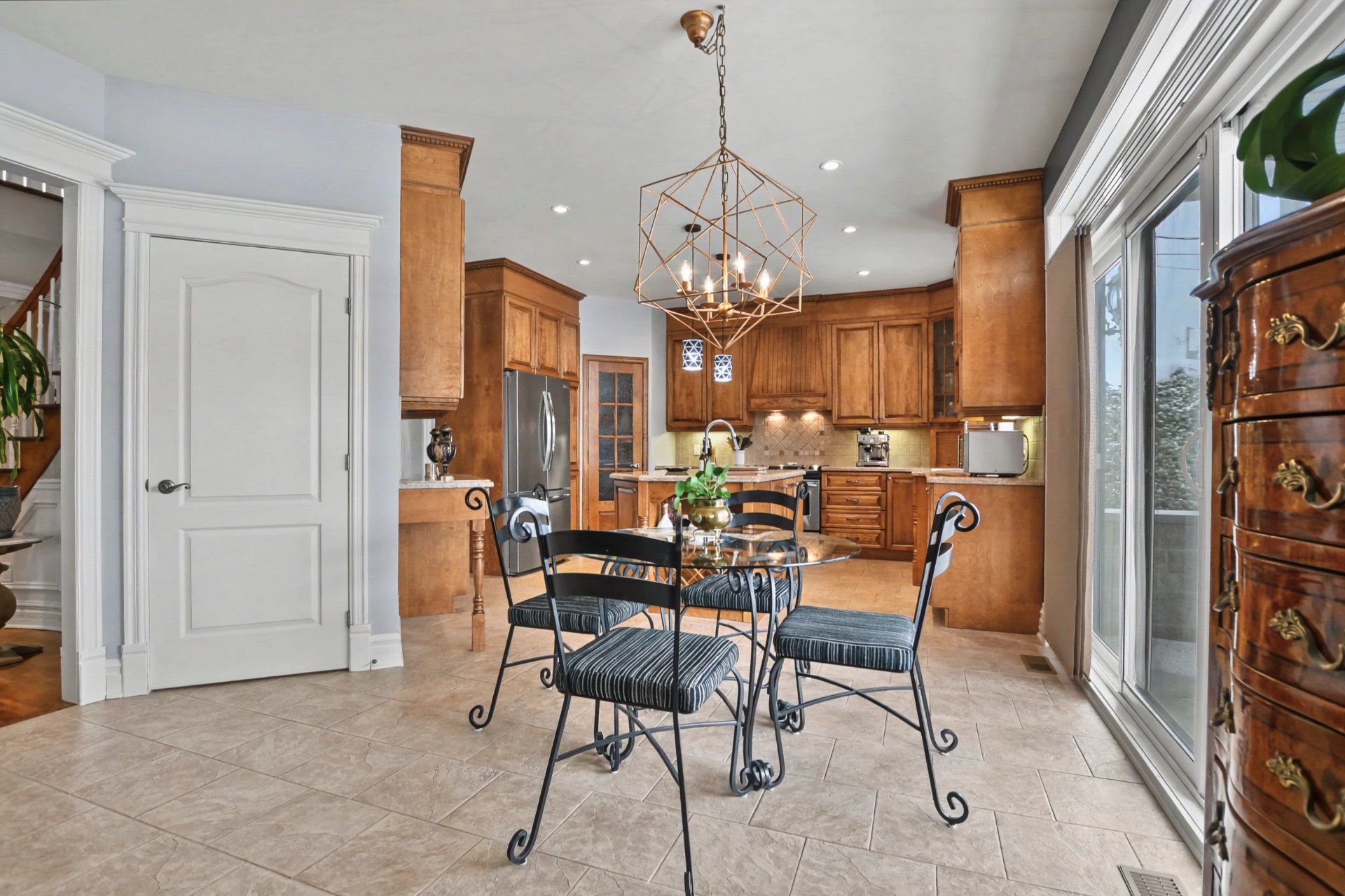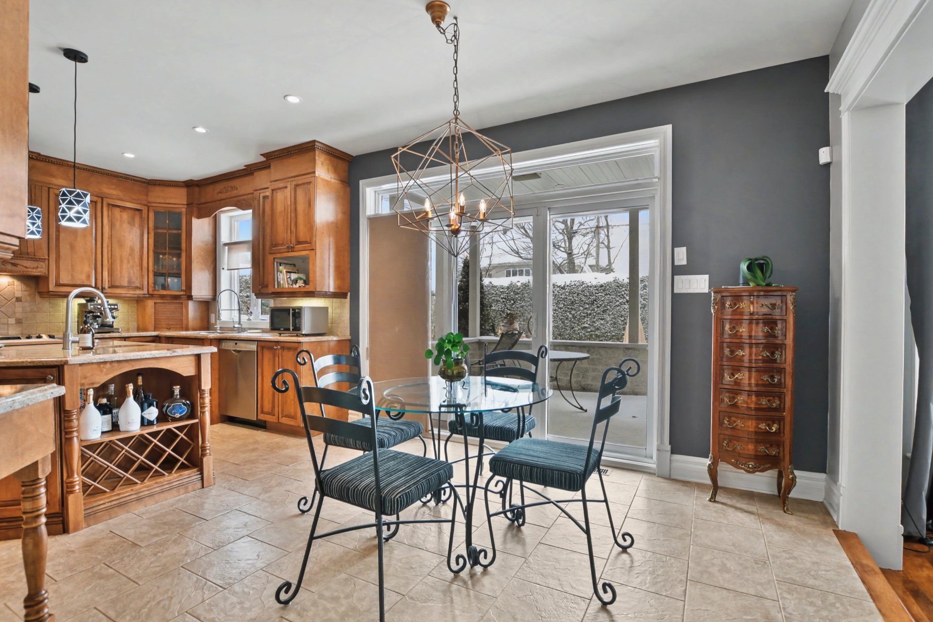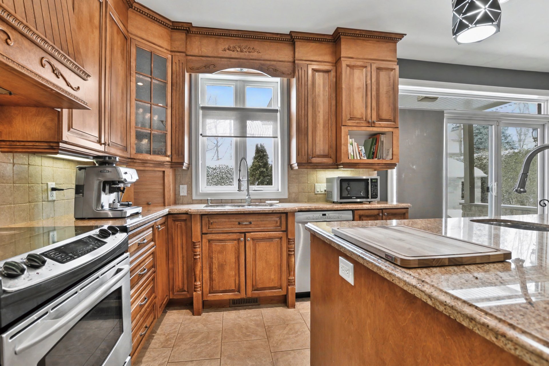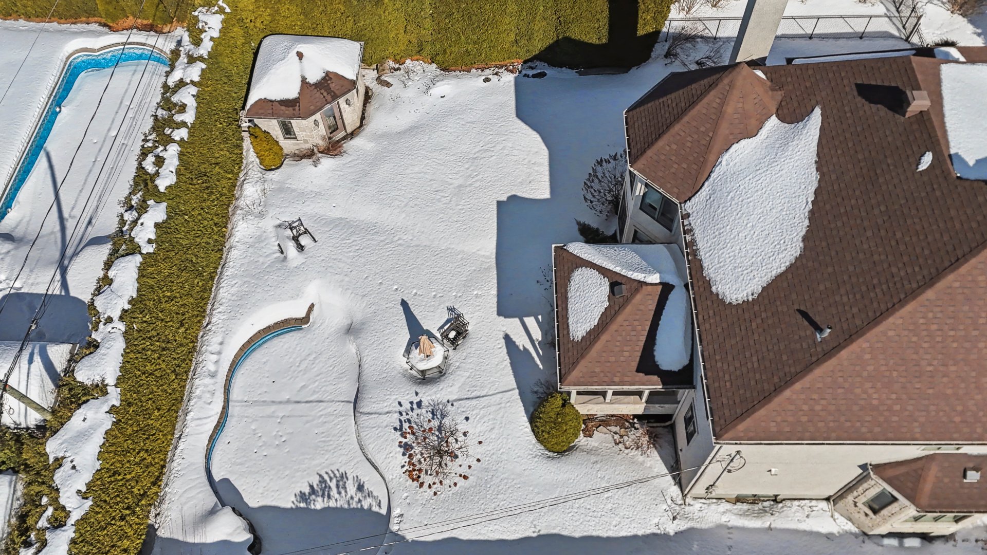 Outside, the professionally landscaped backyard creates a truly exceptional setting: a covered terrace with half stone wall, a natural gas heated in-ground saltwater pool, and mature cedar hedges ensuring remarkable privacy.