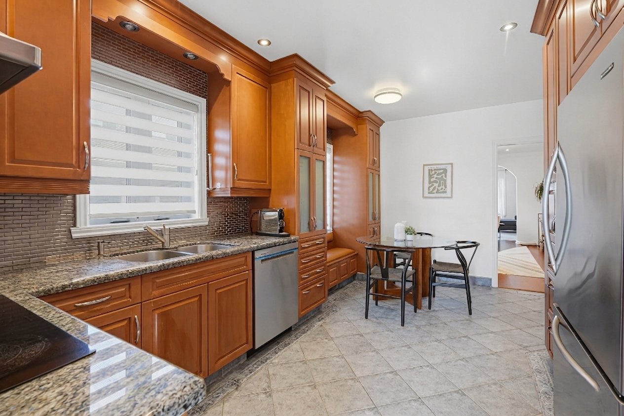 Magnificent top-floor condo in a beautifully converted duplex, offering 1,711 sq. ft. of impeccable living space filled with natural light. This elegant home stands out with its bright, spacious layout, refined finishes, and a warm, inviting atmosphere throughout. The expansive living and dining areas are bathed in sunlight and provide the perfect setting for both relaxed everyday living entertaining. The kitchen is both functional and timeless, featuring abundant cabinetry, counter space, and a charming dinette area ideal for casual meals.