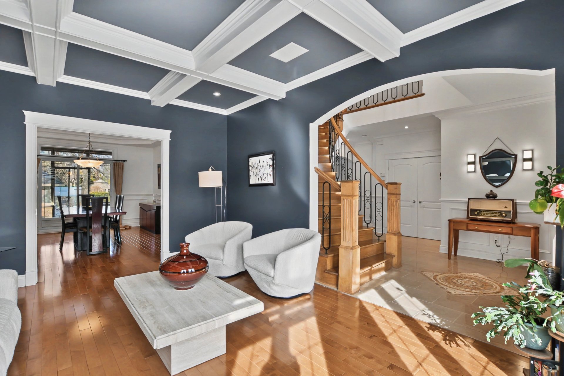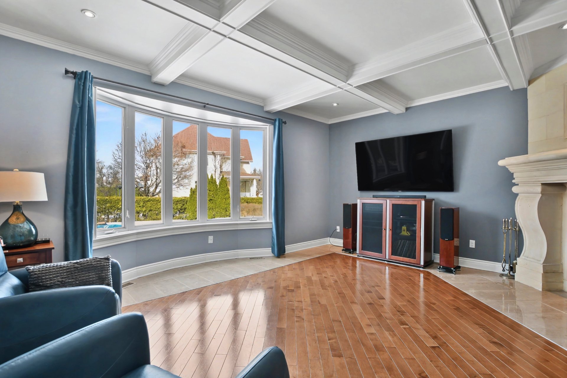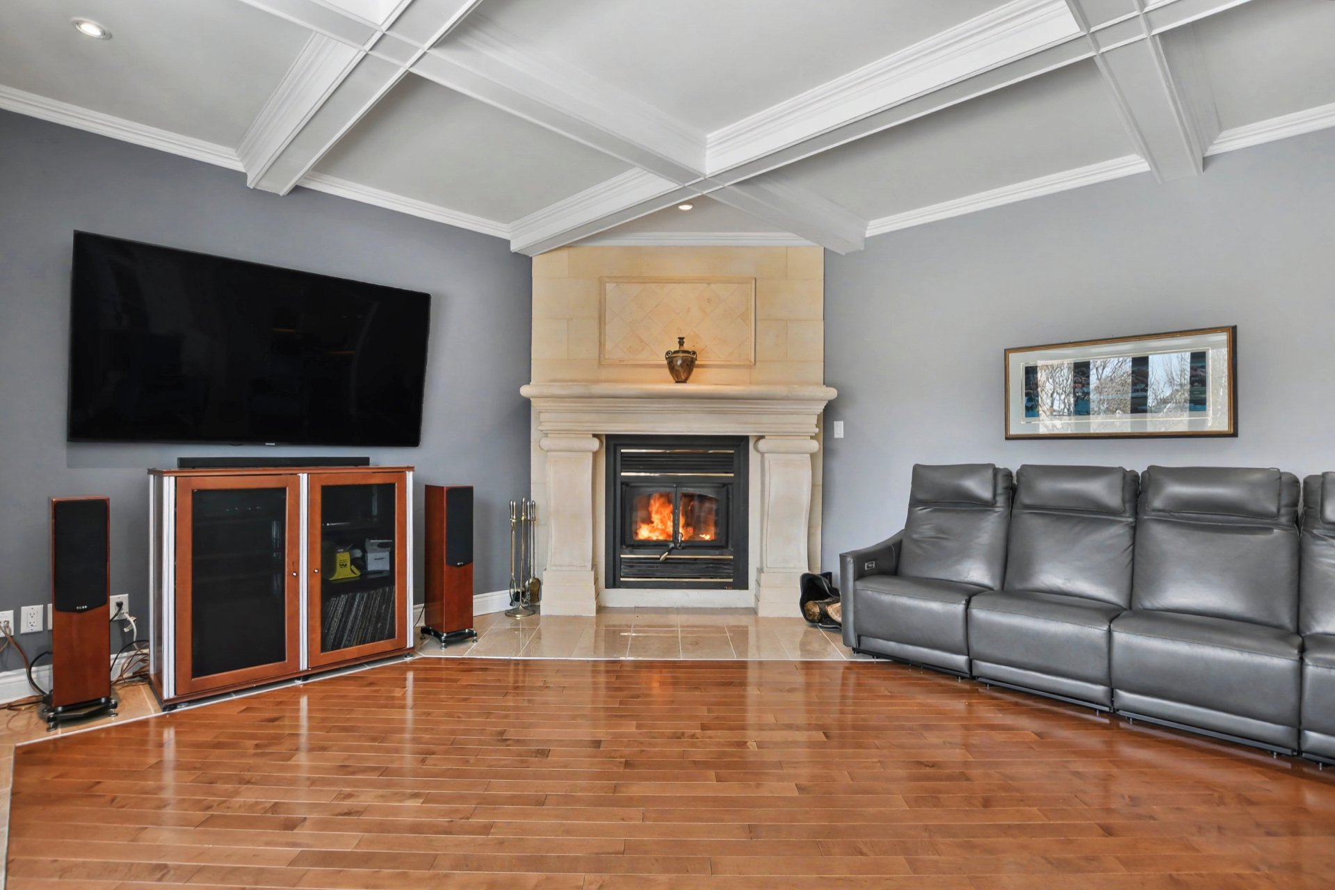 The main floor offers warm and inviting living areas including a living room with coffered ceiling, a family room with wood-burning slow-combustion fireplace and coffered ceiling, a functional kitchen with wood cabinetry, granite countertops and a walk-in pantry, a spacious dining room, a 3-season veranda, as well as a powder room and laundry room.