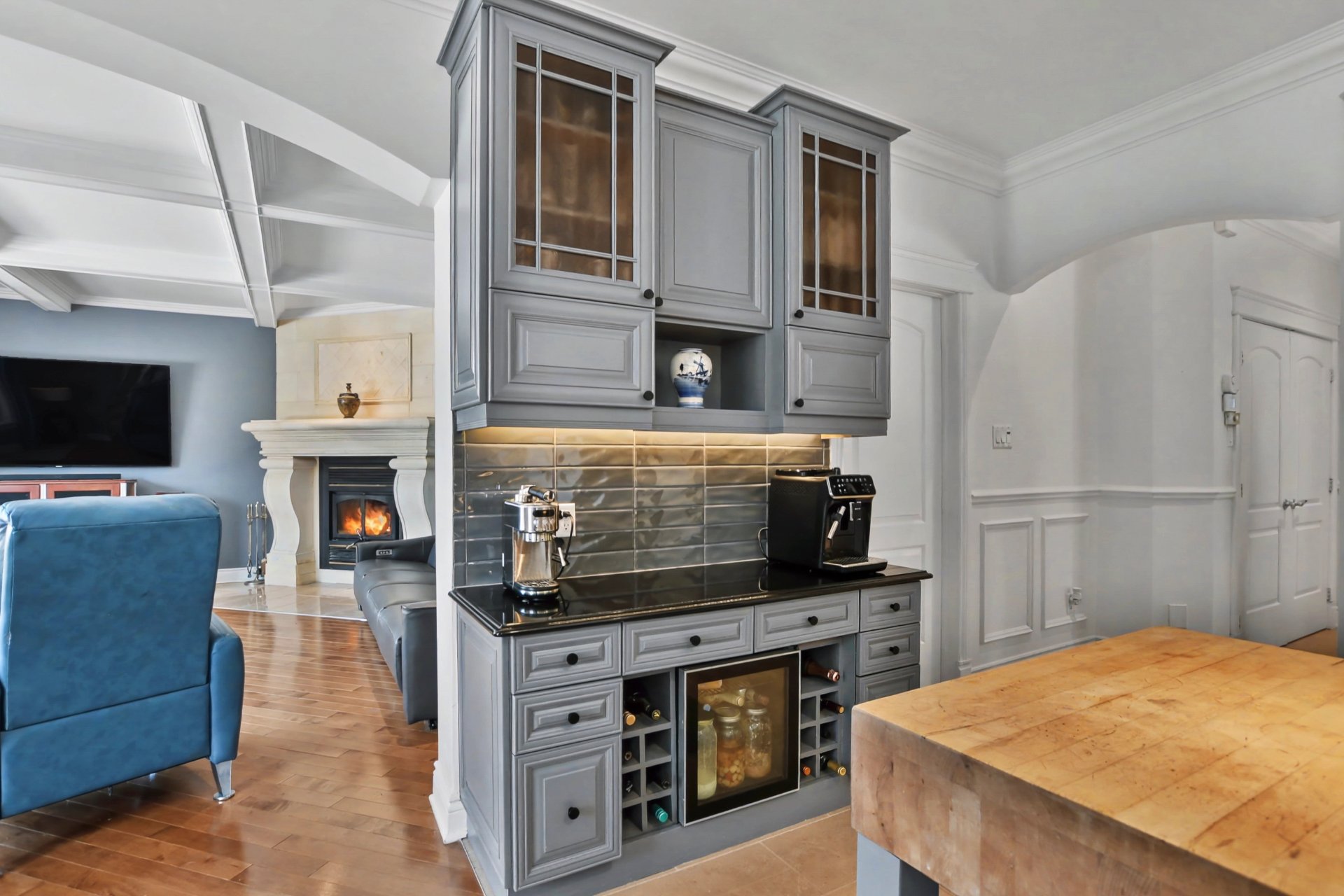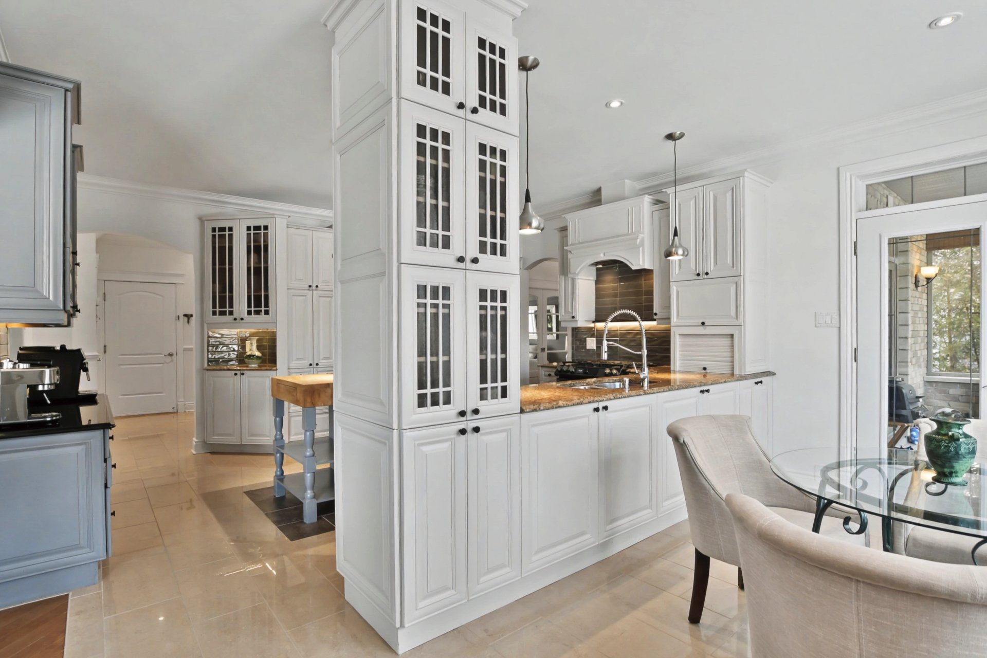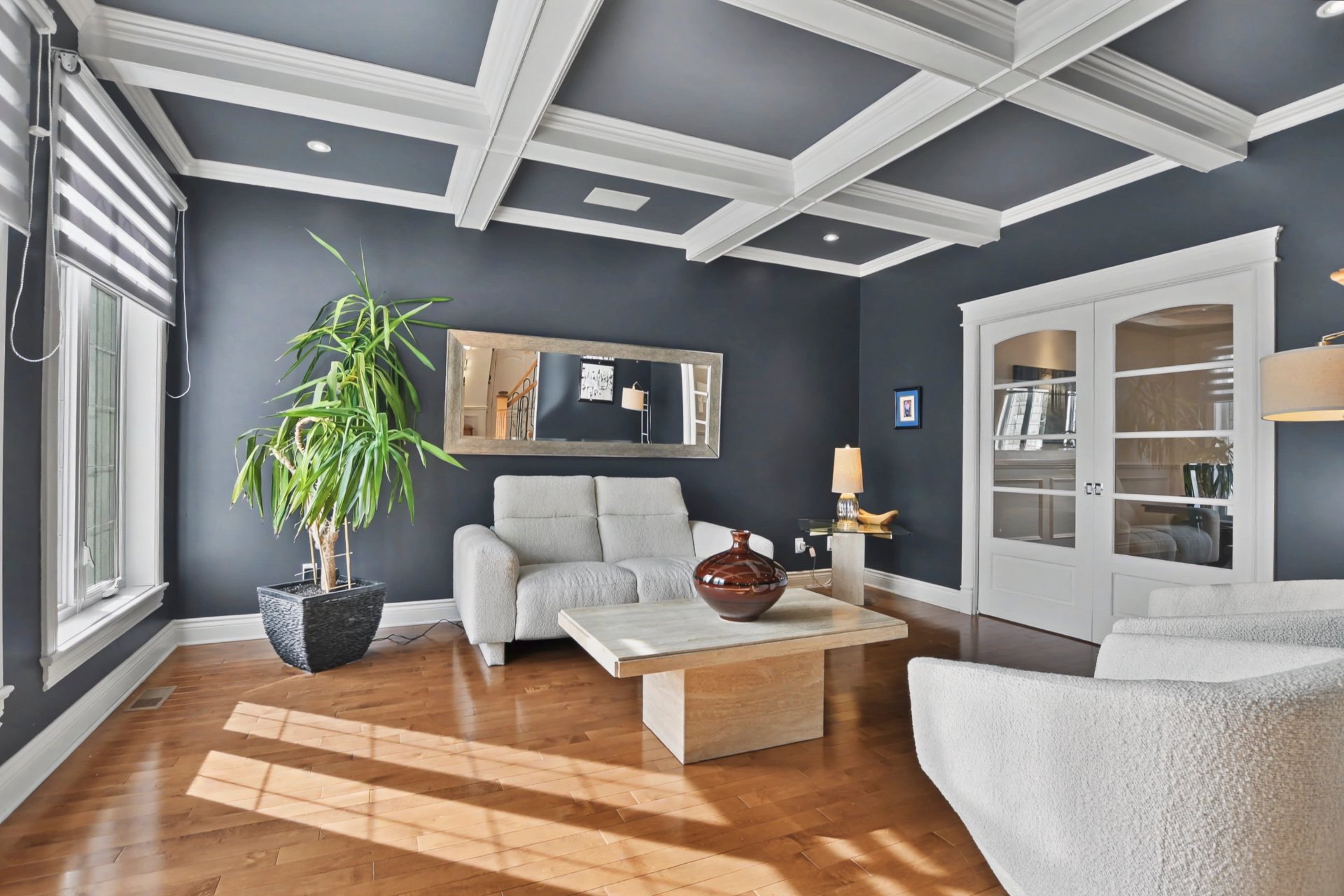 The main floor offers warm and inviting living areas including a living room with coffered ceiling, a family room with wood-burning slow-combustion fireplace and coffered ceiling, a functional kitchen with wood cabinetry, granite countertops and a walk-in pantry, a spacious dining room, a 3-season veranda, as well as a powder room and laundry room.