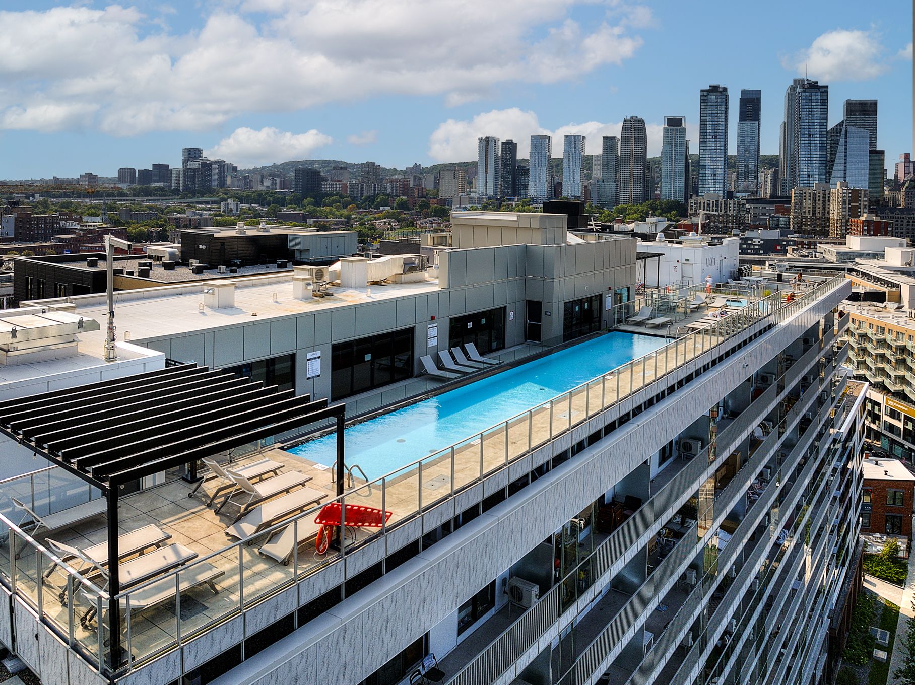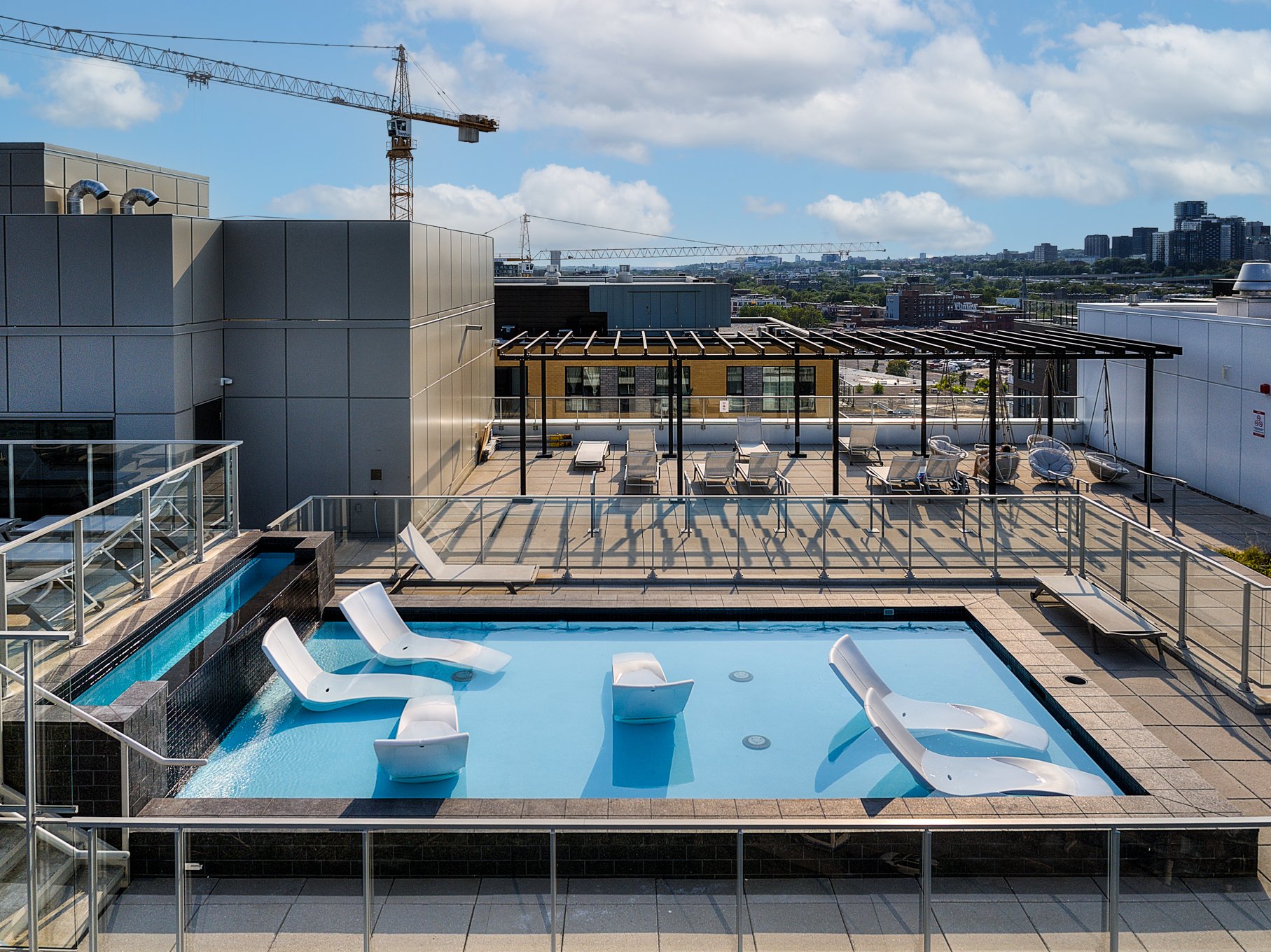 Rooftop Oasis: Heated pool, BBQ stations, and outdoor fireplace with panoramic views.