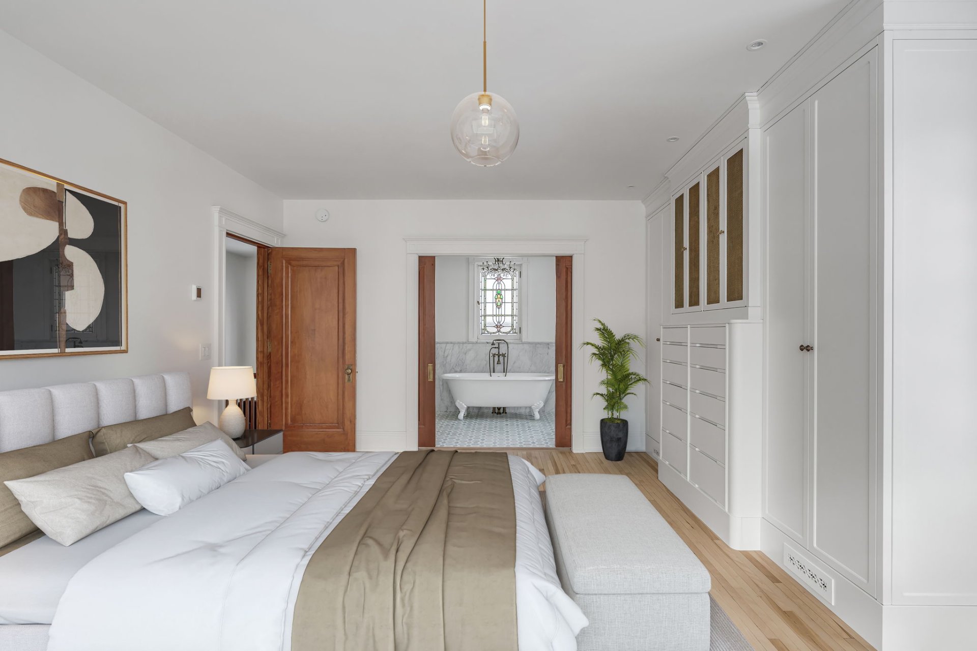 Restoration of a piece of furniture and addition of built-in furniture to create a large storage area in the master bedroom.