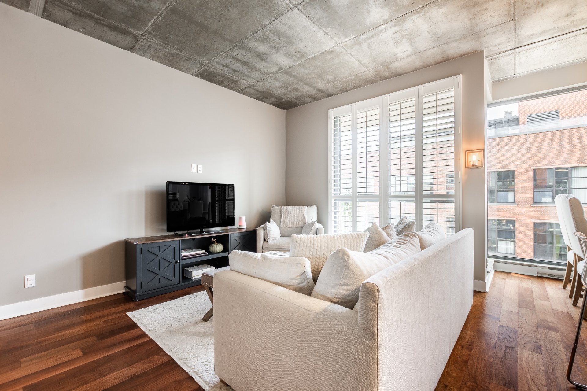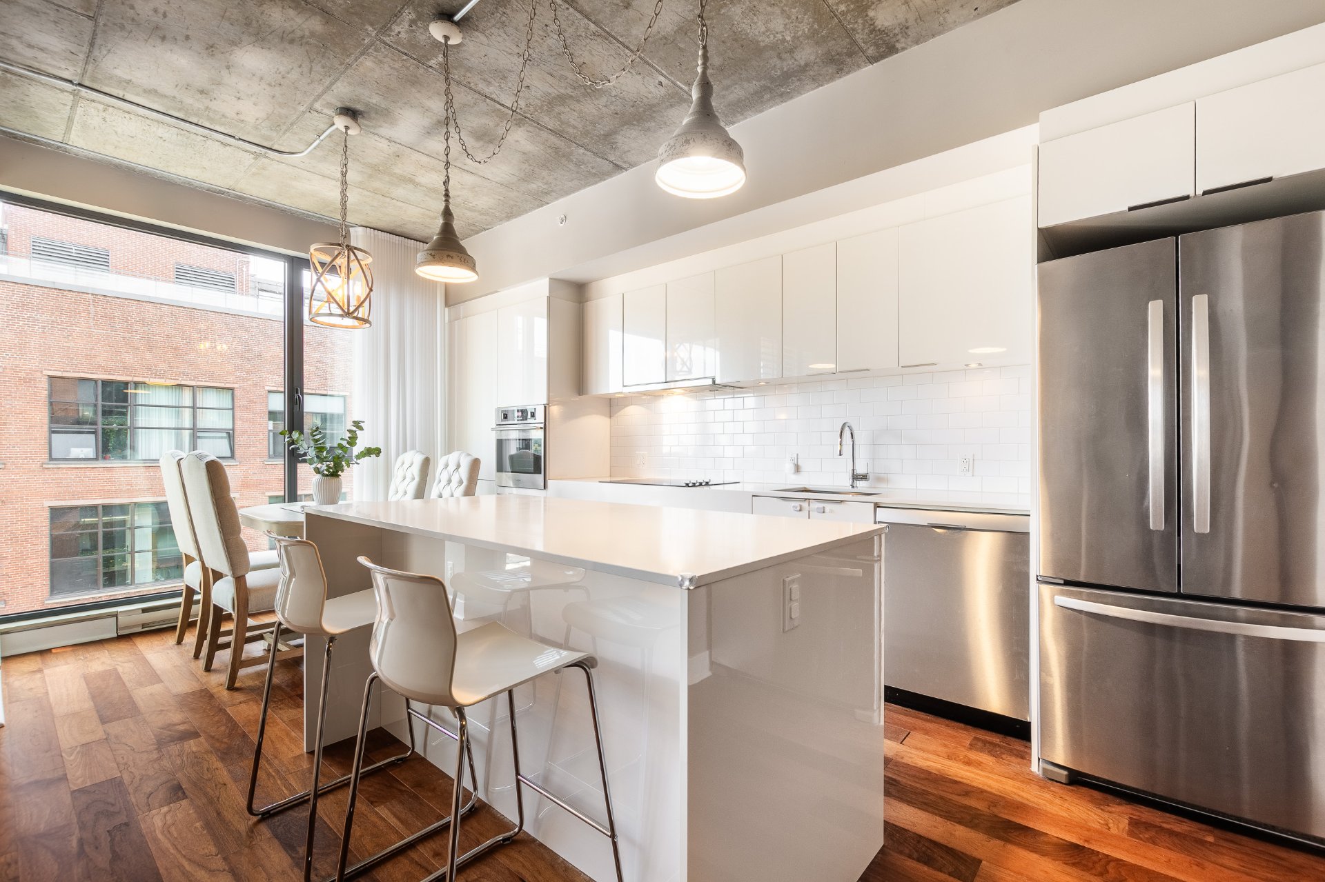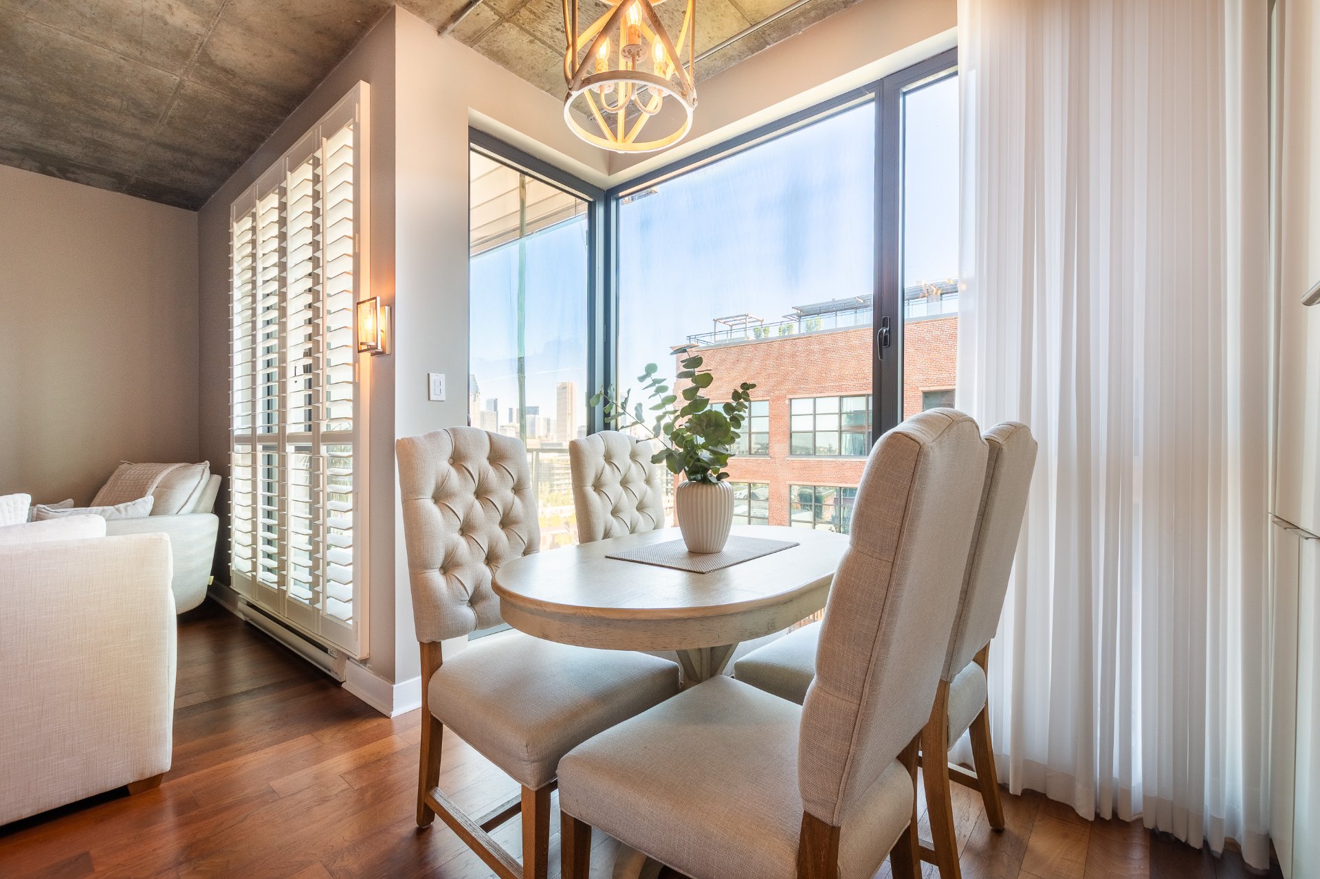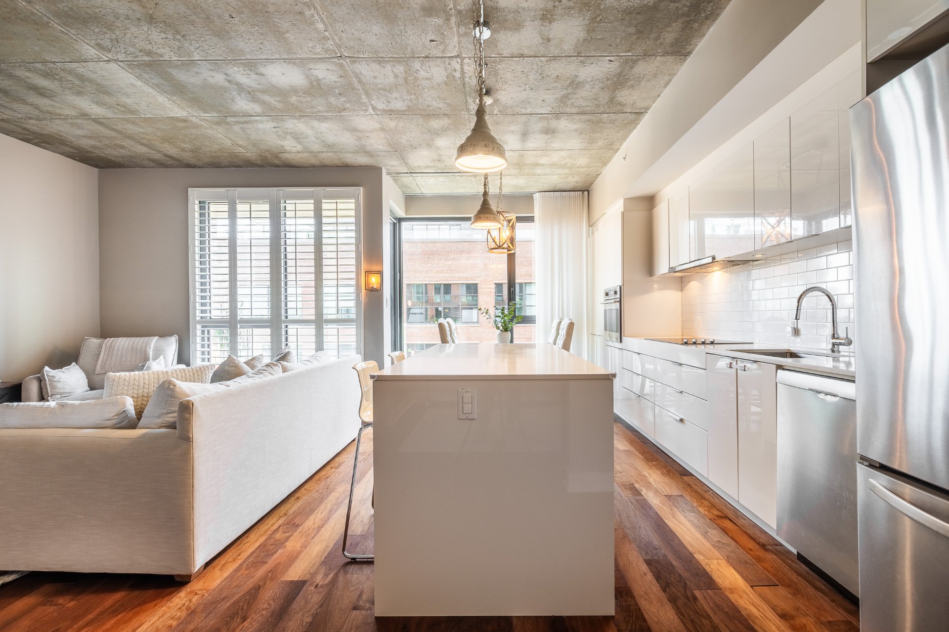 Discover this stunning 2-bedroom condo in the prestigious Nordelec project, combining industrial charm with modern elegance. Exposed concrete ceilings, large windows and abundant natural light create a warm yet sophisticated atmosphere. The open kitchen, featuring an island and high-end appliances, blends seamlessly with the rich wood floors. The inviting living space is perfect for entertaining as well as enjoying everyday comfort.