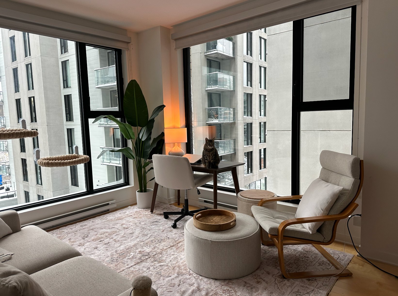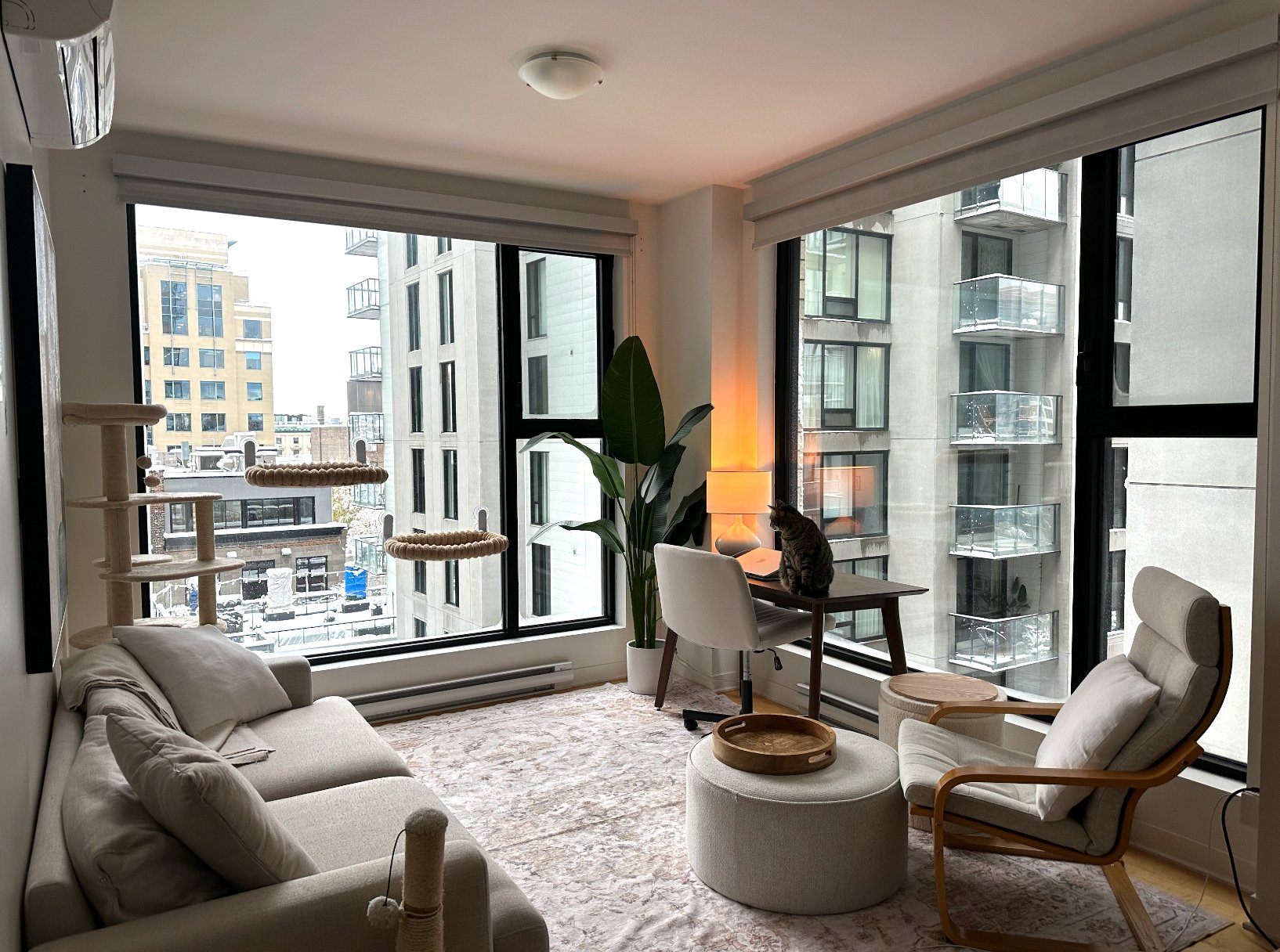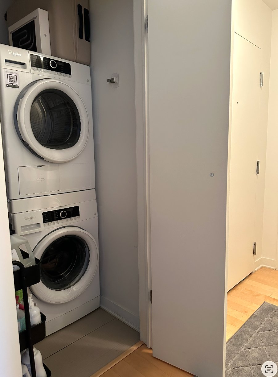 Le Six88, 688 Notre-Dame W (8th floor): bright, quiet 2-bed/1-bath with generous, functional living space. In-unit laundry, A/C, hardwood floors, condo-style finishes, and stainless appliances (fridge, stove, dishwasher, microwave). Building amenities: rooftop terrace w/ BBQ, fitness room, keyless entry, modern security, secure parcel receiving, full-time concierge. Walk to Square-Victoria & Place-d'Armes metros, downtown/business district, local shops, restaurants/bars, and St-Lawrence river bike paths. Heated indoor parking available $250/mo; storage locker $100/mo. Pets allowed up to 30 lb.