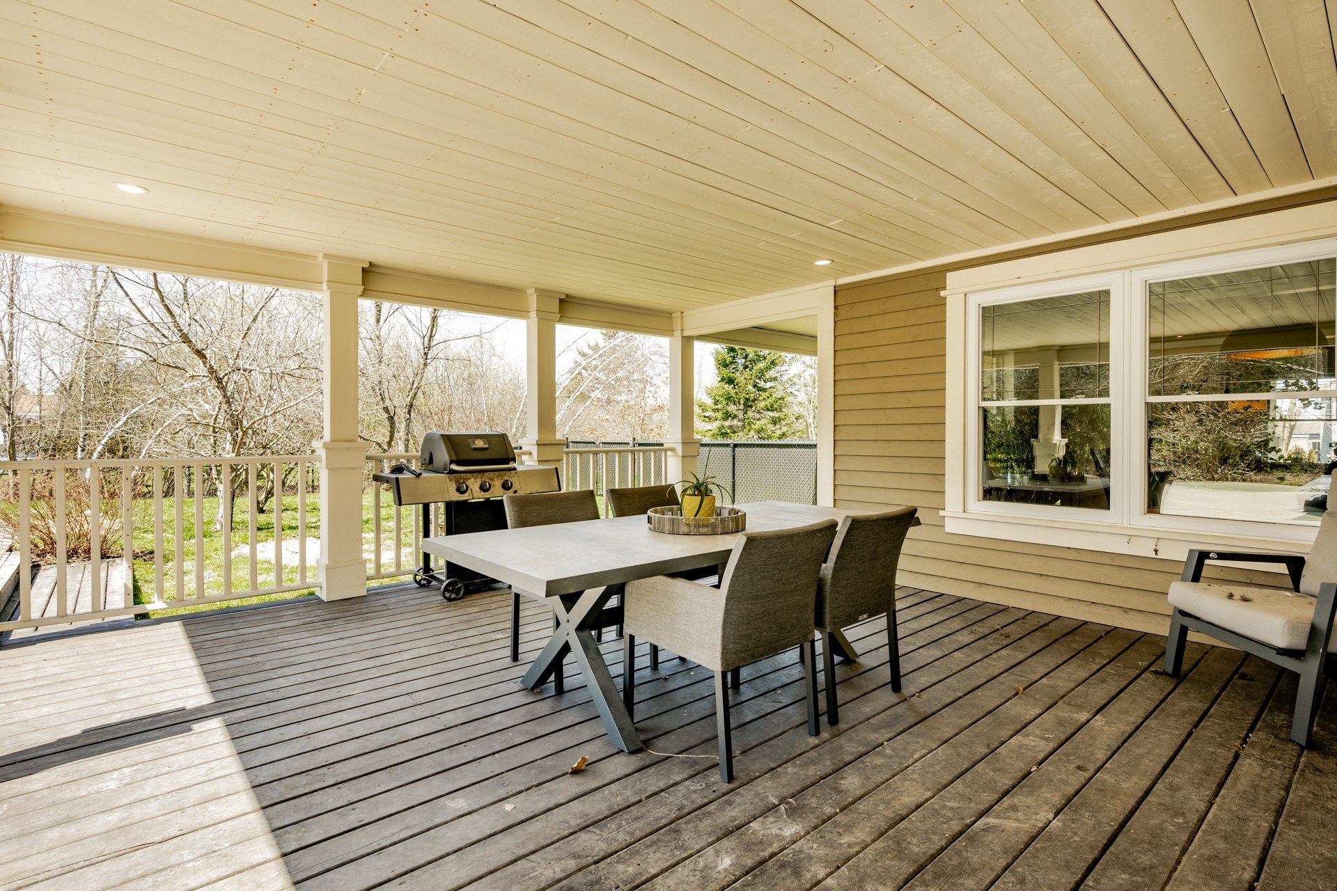 Inside, the main floor features a seamless flow between living areas, with heated slate floors, a spacious and cozy living room with a wood-burning fireplace, and a dining area adjacent to the kitchen. The kitchen includes a large central island, solid wood cabinetry, and a walk-in pantry.