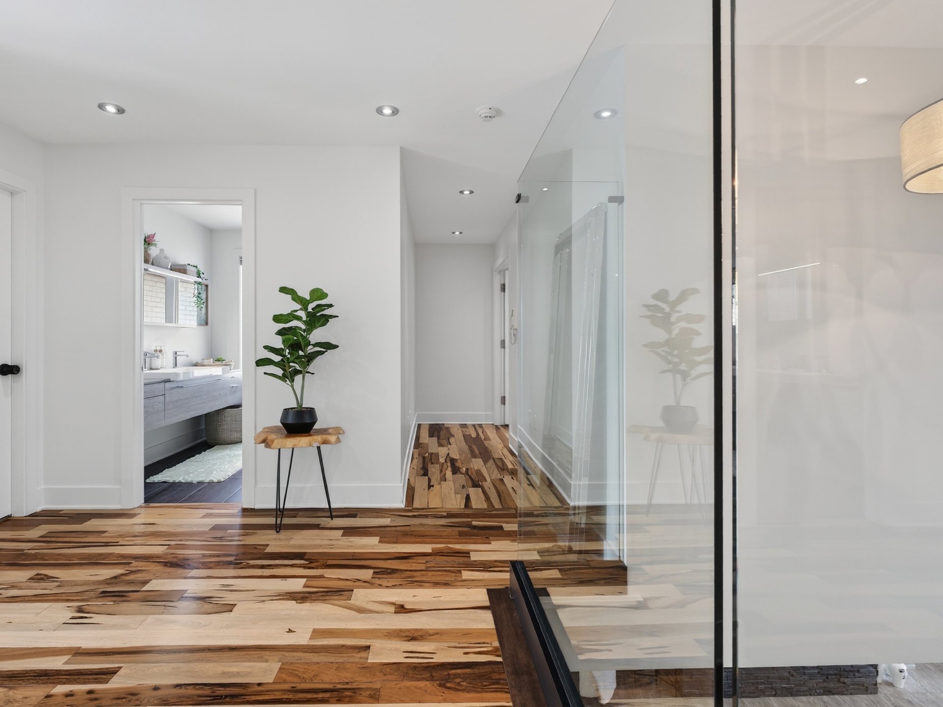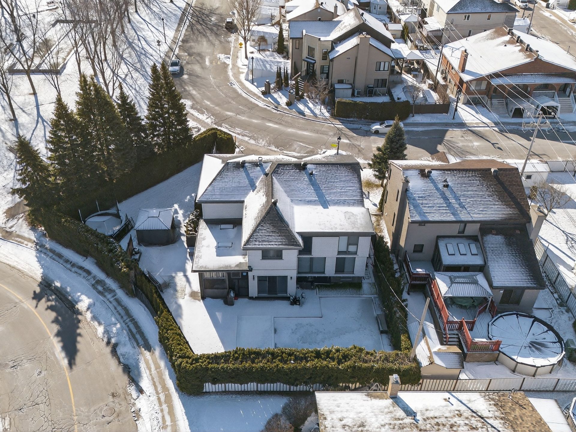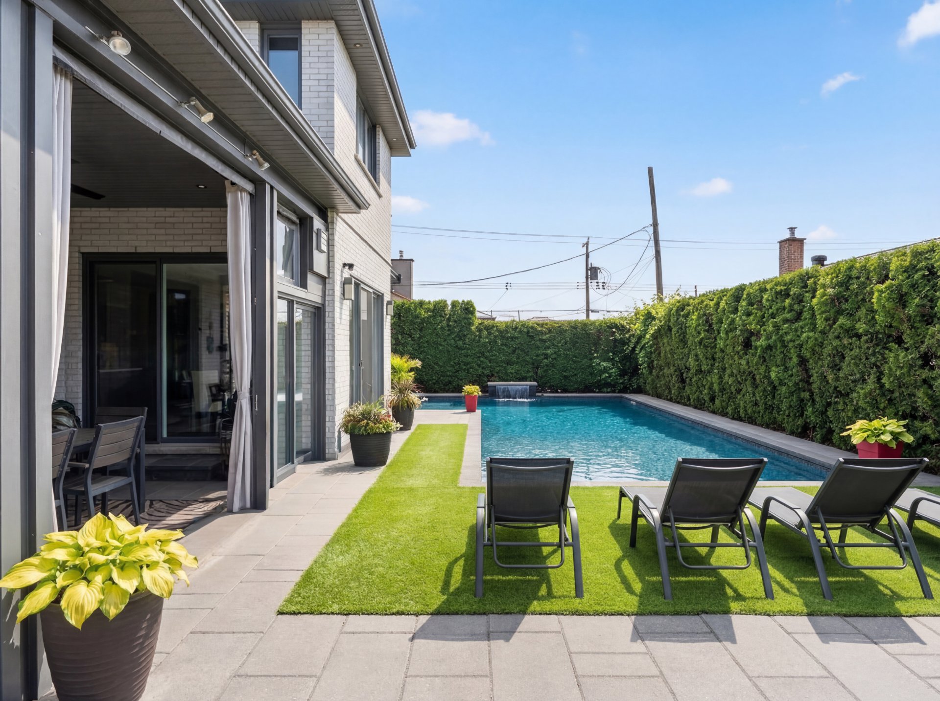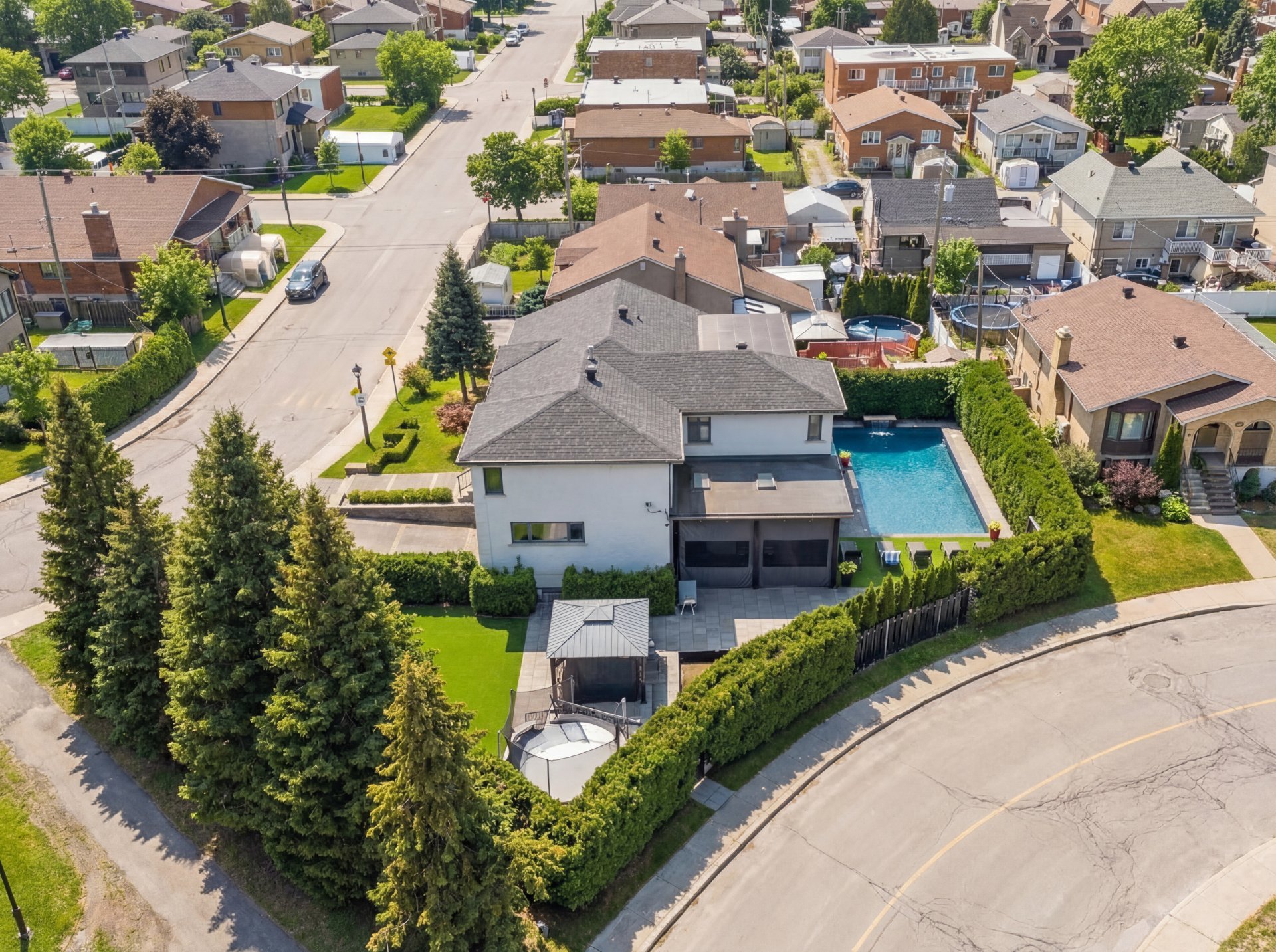 On a quiet corner in a well-established family area of Rivière-des-Prairies, set behind mature hedges on a 7,469 sq.ft. lot, this residence offers space, light, and privacy. The main floor is open and fluid, with a kitchen designed to gather and living areas that extend naturally outdoors. The upper level is dedicated to rest, with a generous primary suite and well-proportioned bedrooms. Outside, the pool and terrace create a simple, resort-style setting. A property that feels composed, private, and easy to live in.