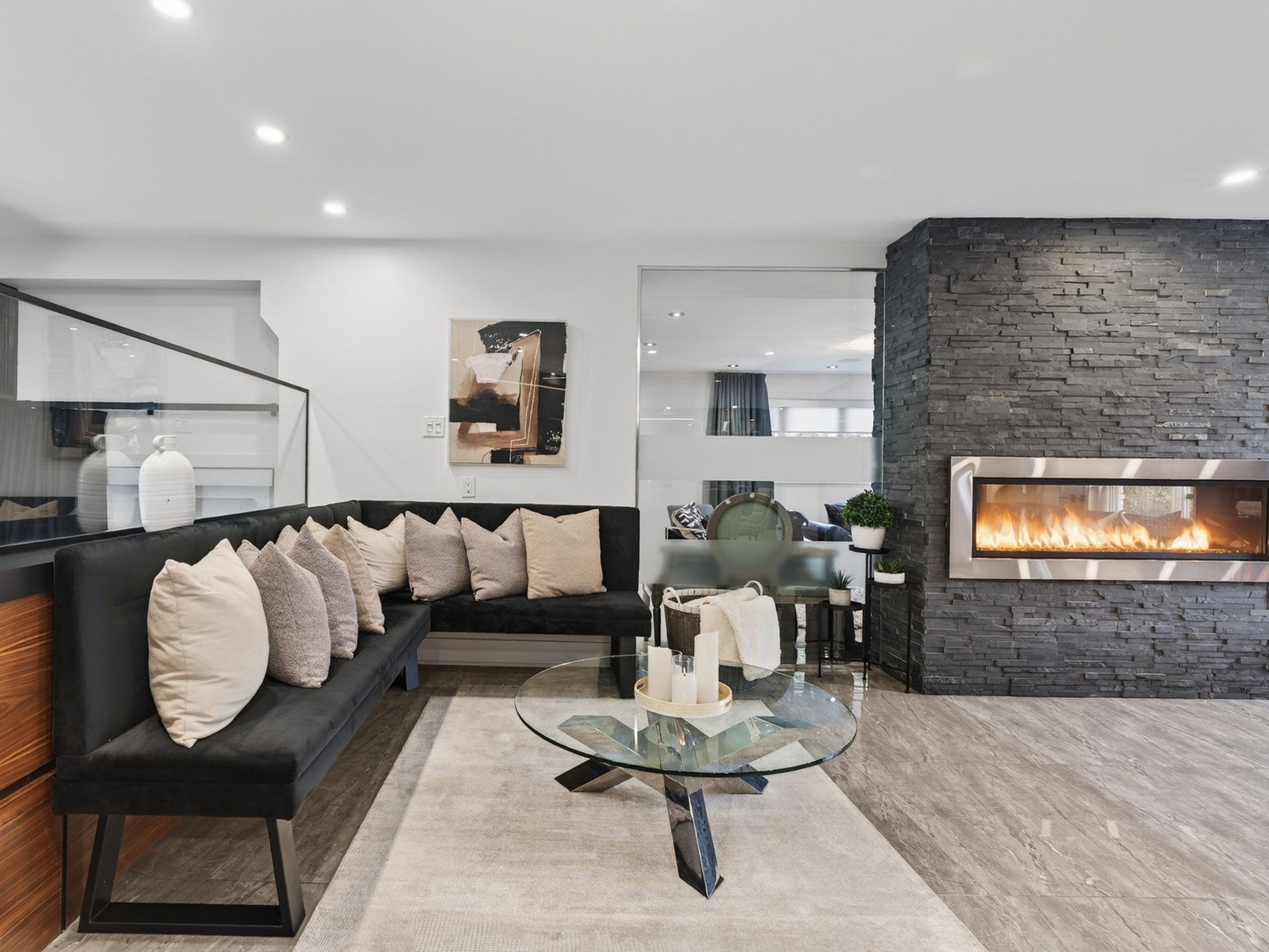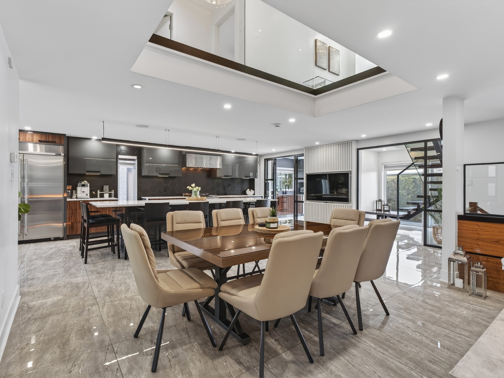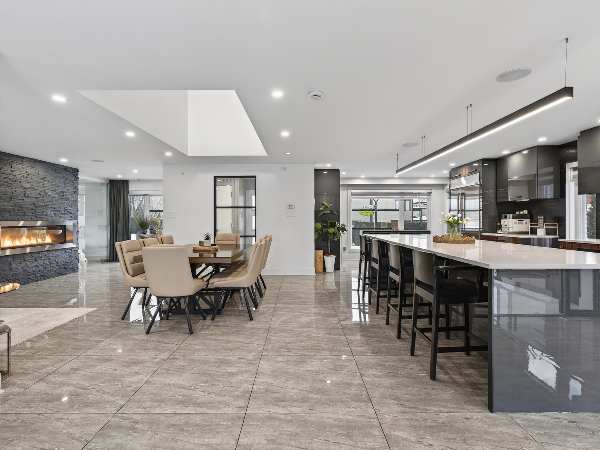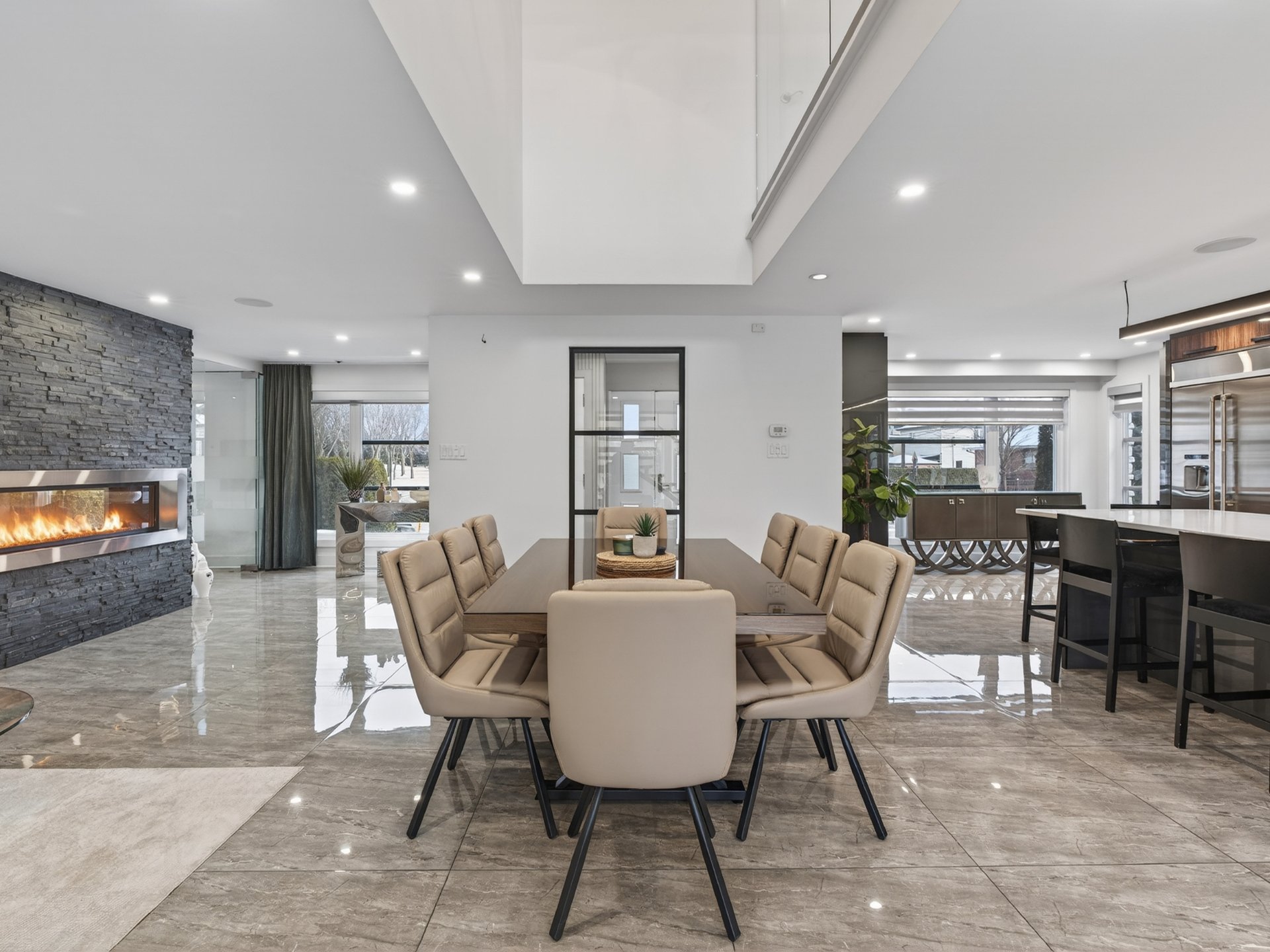 The main level is organized around open, fluid living spaces. A central kitchen with oversized island connects seamlessly to the dining area and living room, anchored by a double-sided fireplace. Large openings provide natural light and direct access to the backyard, creating continuity between interior and exterior spaces.