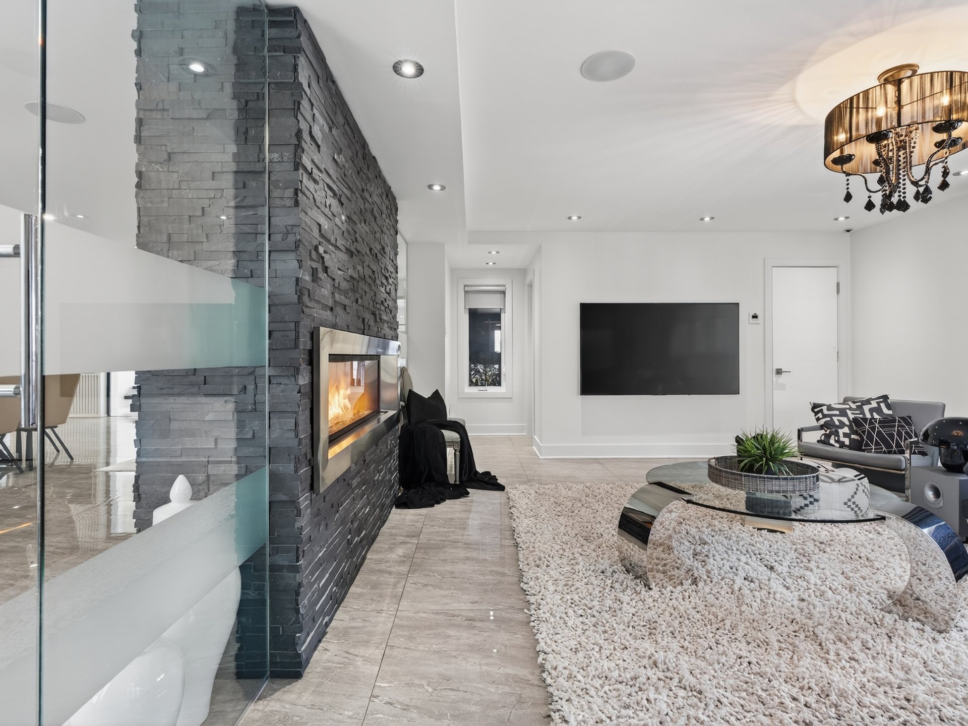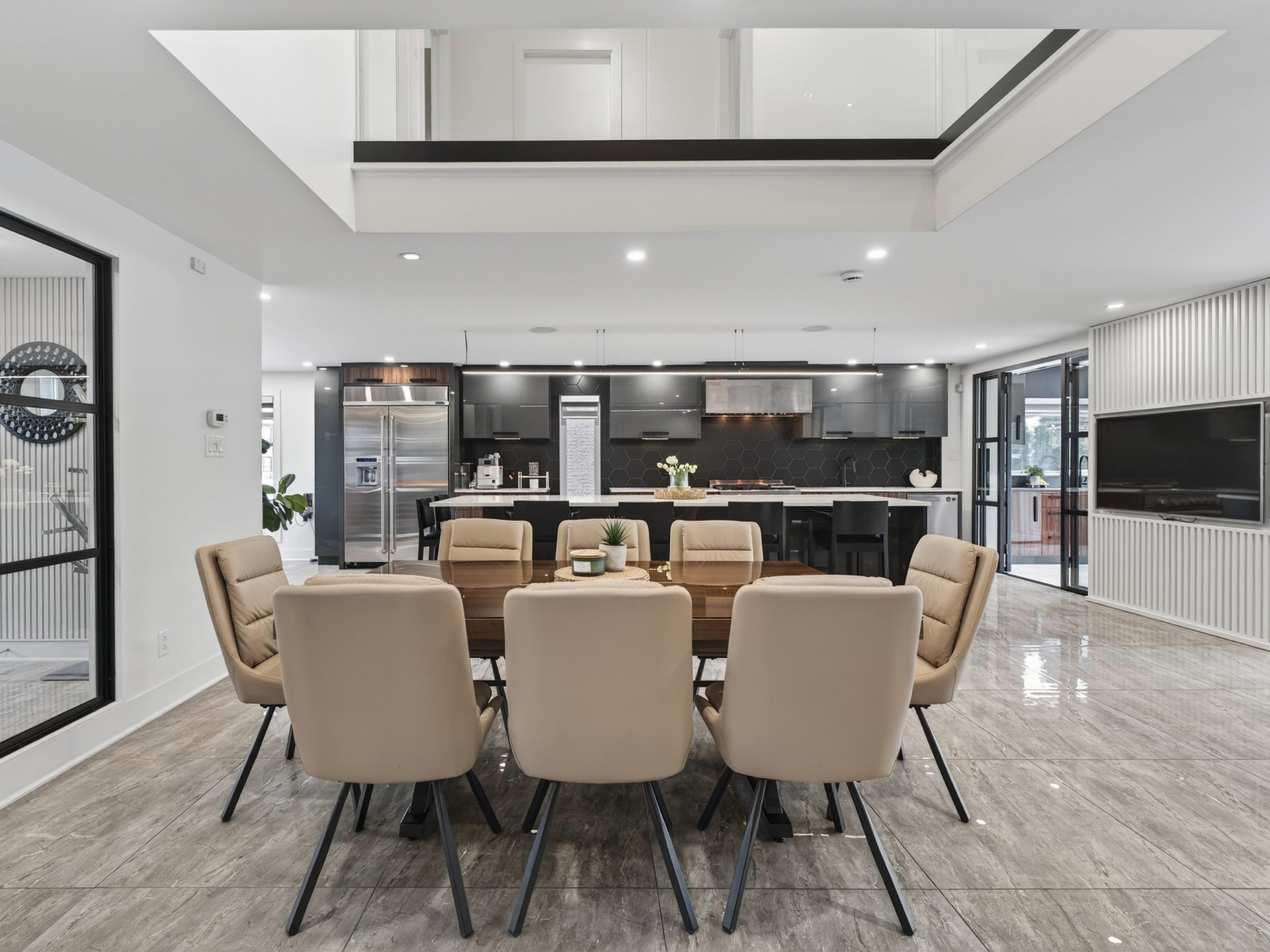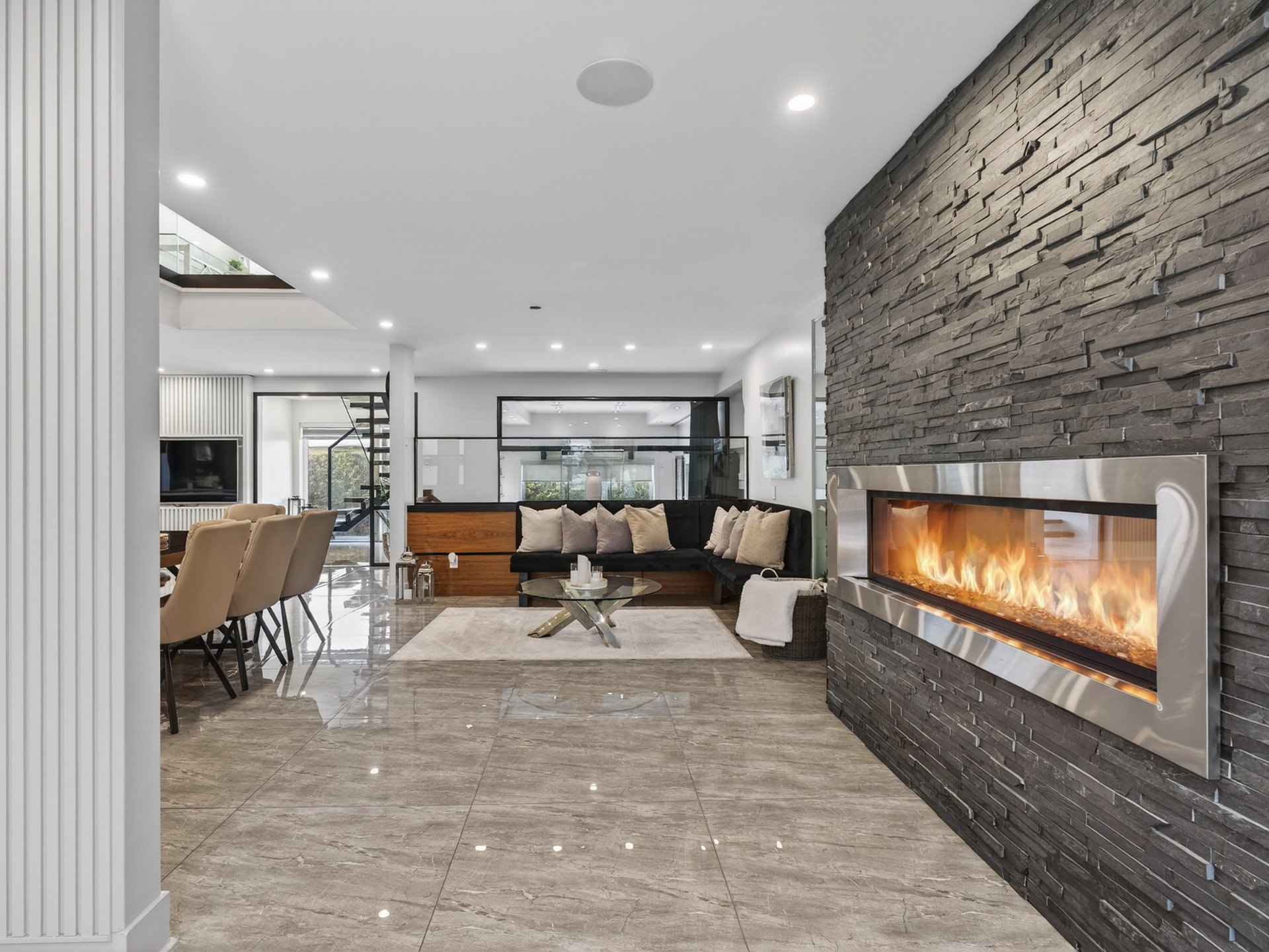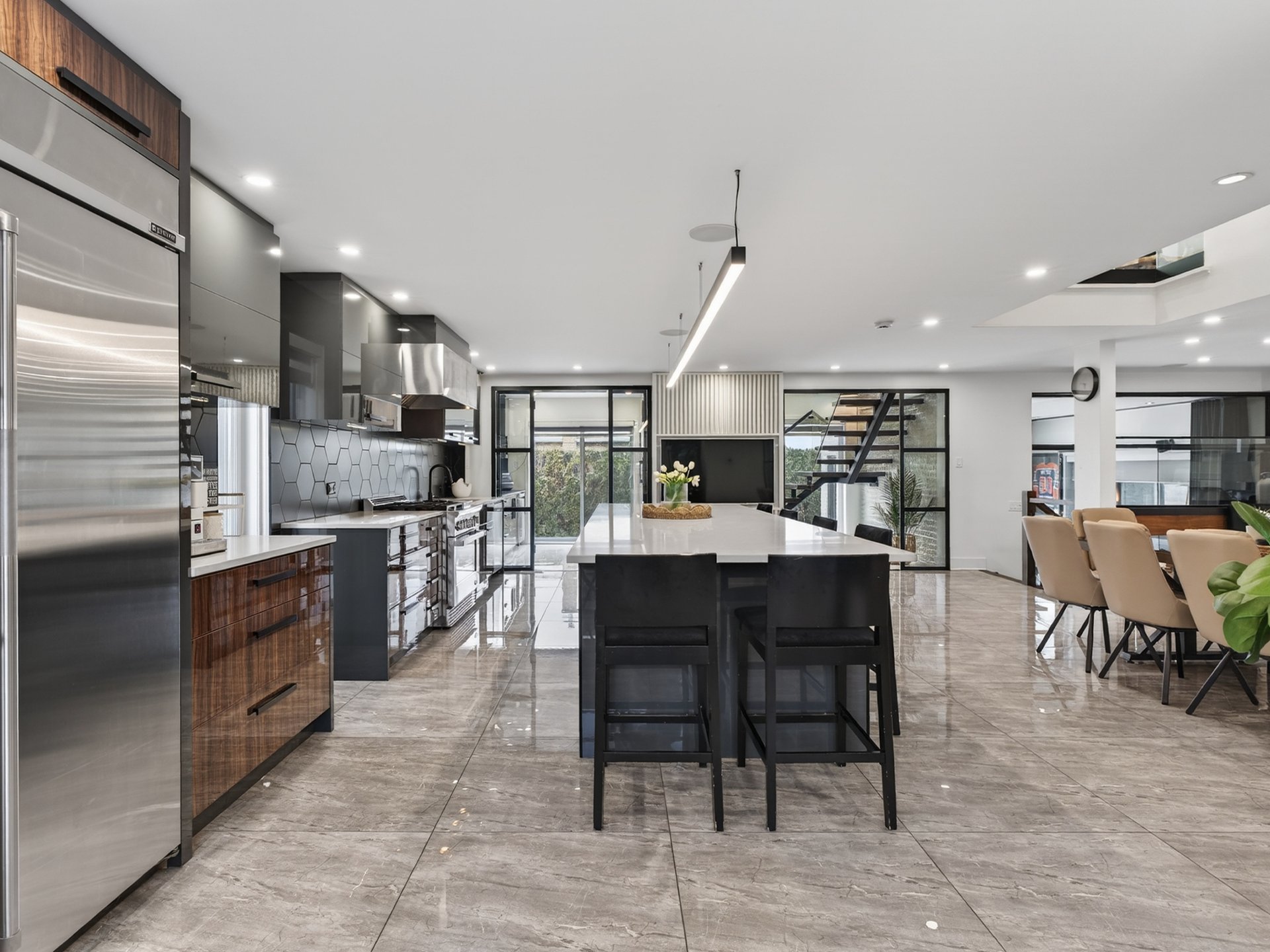The main level is organized around open, fluid living spaces. A central kitchen with oversized island connects seamlessly to the dining area and living room, anchored by a double-sided fireplace. Large openings provide natural light and direct access to the backyard, creating continuity between interior and exterior spaces.