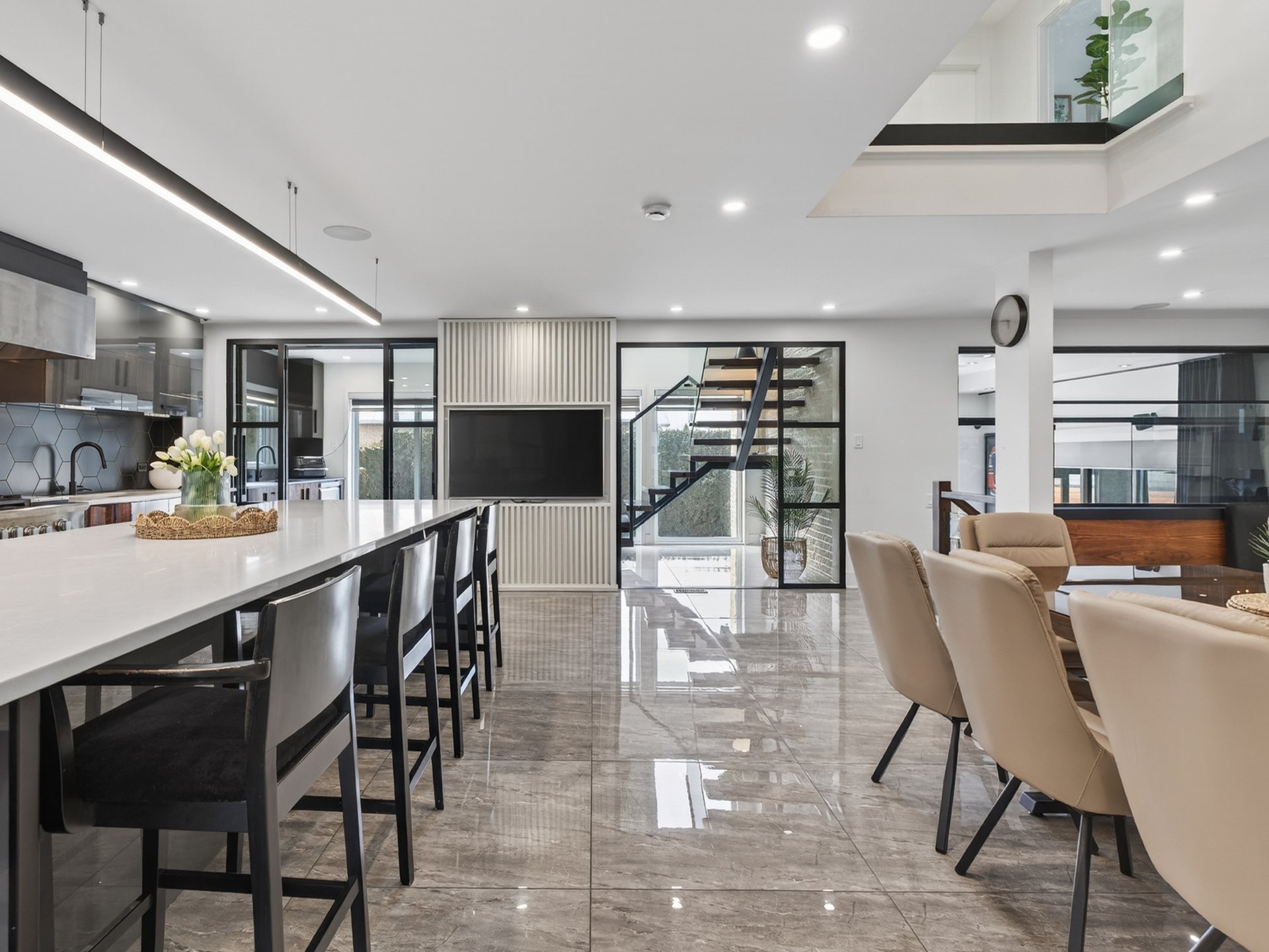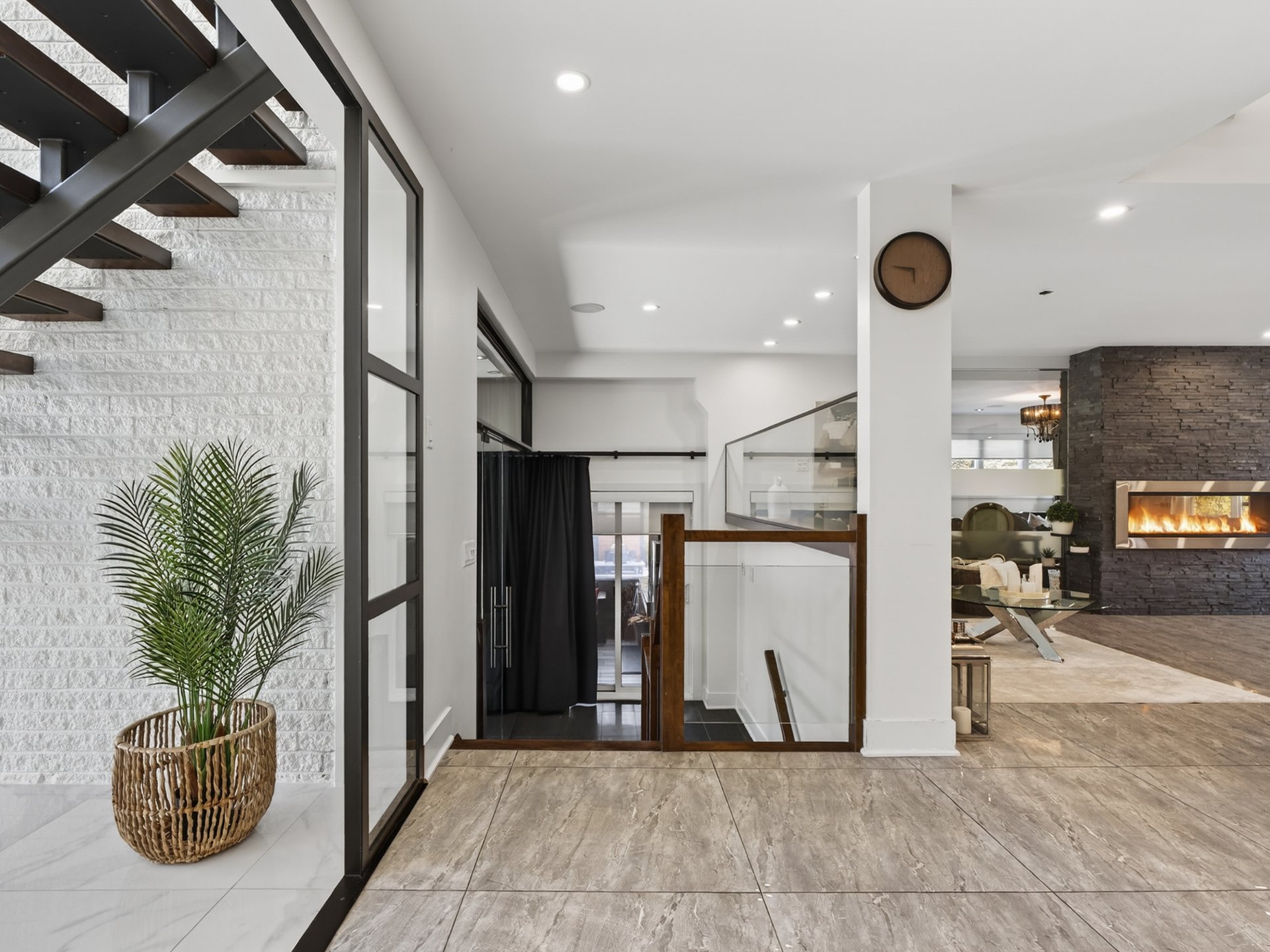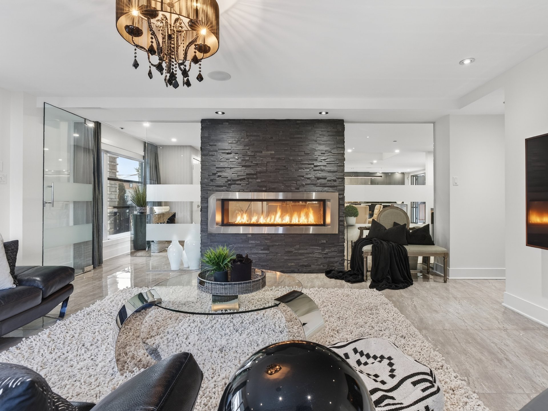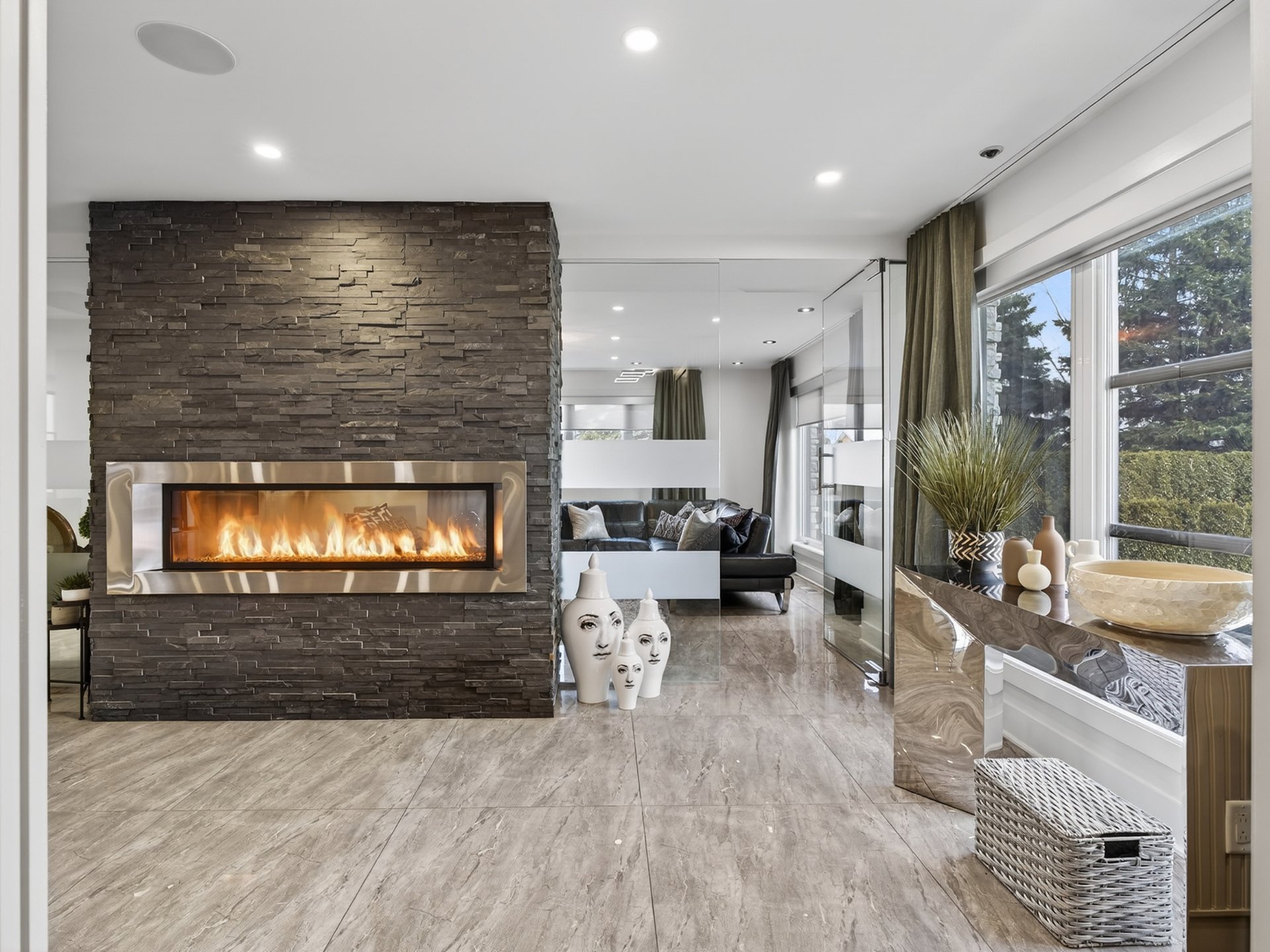 The main level is organized around open, fluid living spaces. A central kitchen with oversized island connects seamlessly to the dining area and living room, anchored by a double-sided fireplace. Large openings provide natural light and direct access to the backyard, creating continuity between interior and exterior spaces.