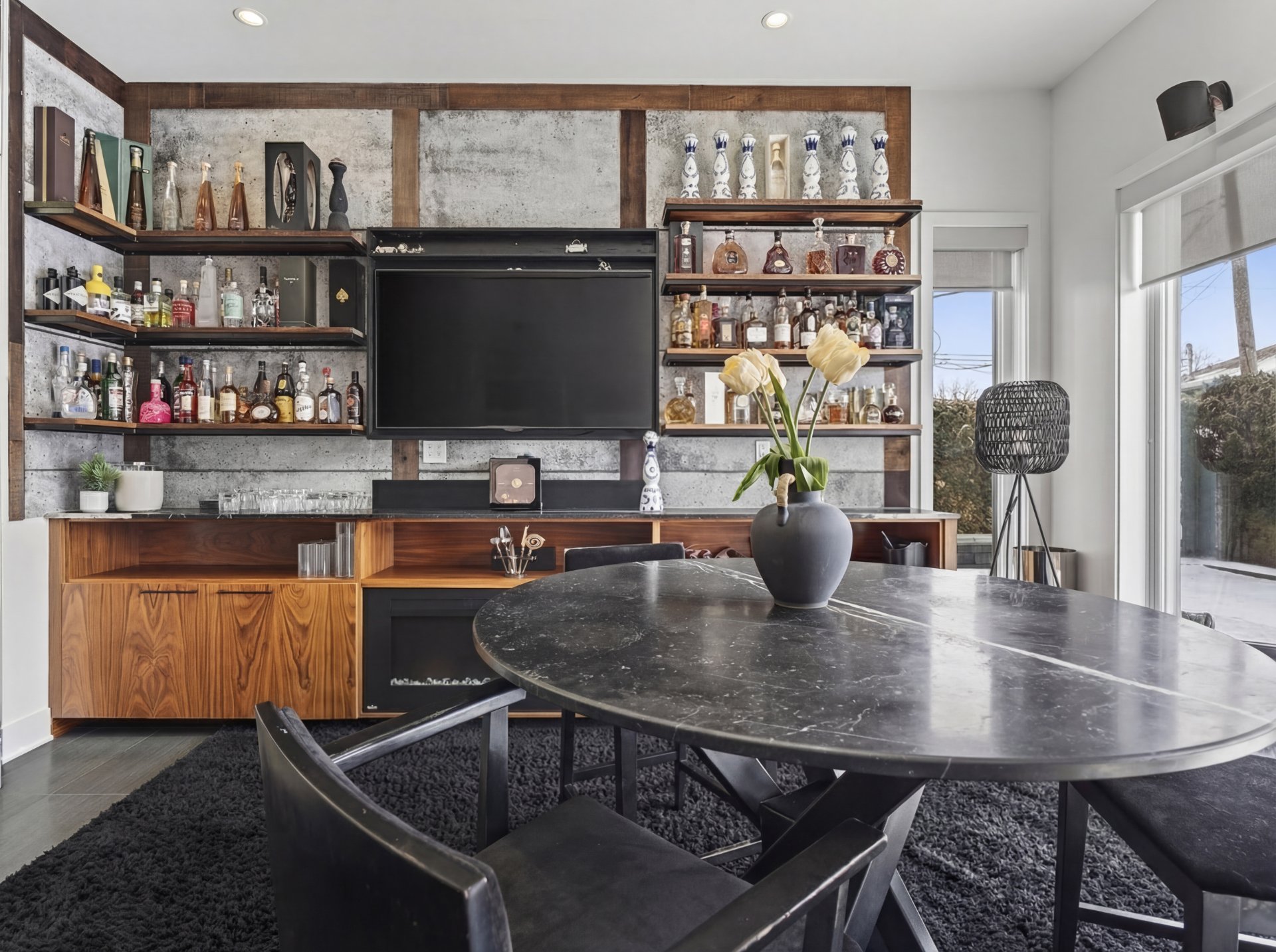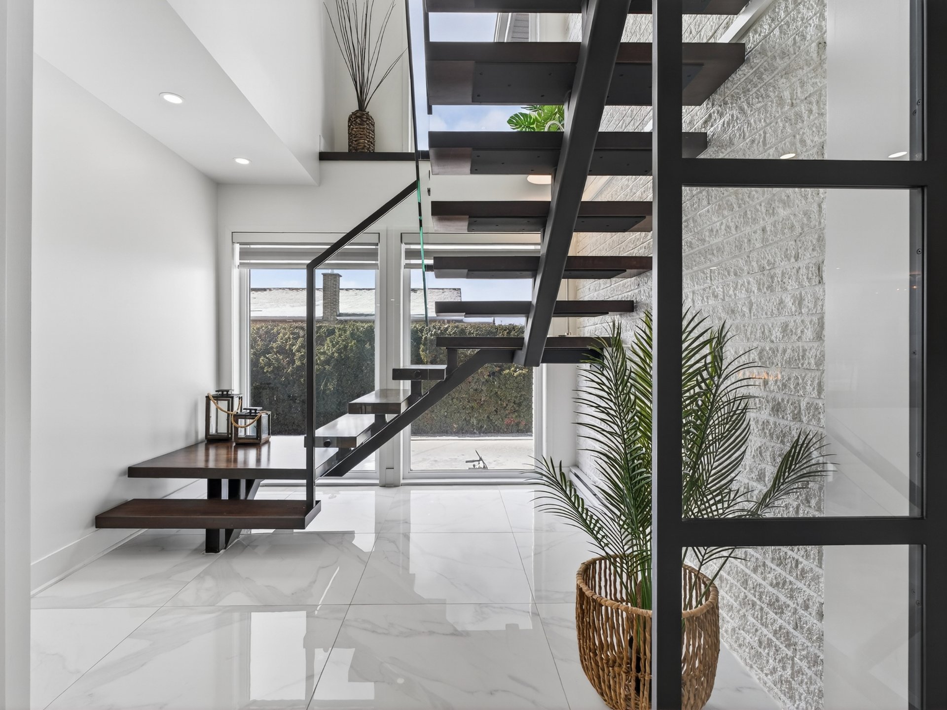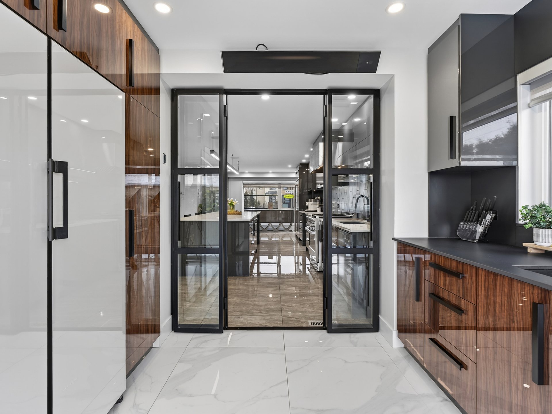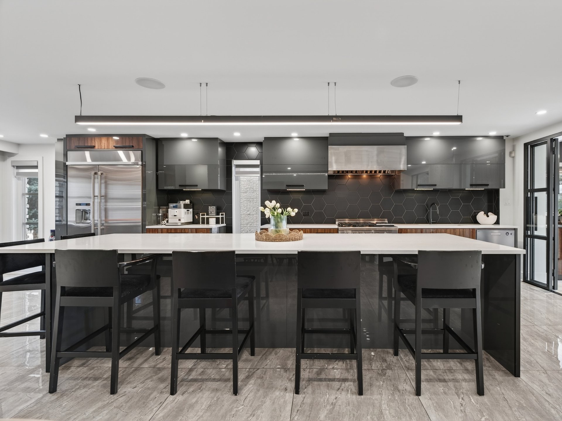 The main level is organized around open, fluid living spaces. A central kitchen with oversized island connects seamlessly to the dining area and living room, anchored by a double-sided fireplace. Large openings provide natural light and direct access to the backyard, creating continuity between interior and exterior spaces.