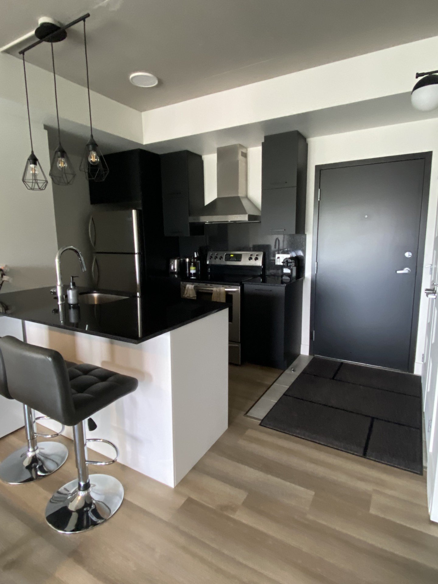 Bright 1-bedroom condo -- All inclusive & well located! Spacious and sunny unit featuring A/C, hot water, Wi-Fi, washer/dryer hookups, dishwasher space, storage, and large balcony where electric BBQs are permitted. Building includes a rooftop terrace and high security. Indoor parking available. Pets allowed. Ideally located near shopping centers, hospitals, university, CEGEPs, grocery stores, and restaurants. Perfect for a comfortable and connected urban lifestyle! $1,380/month until June 31, 2026, then $1,610/month starting July 1, 2026 if the lease is renewed.