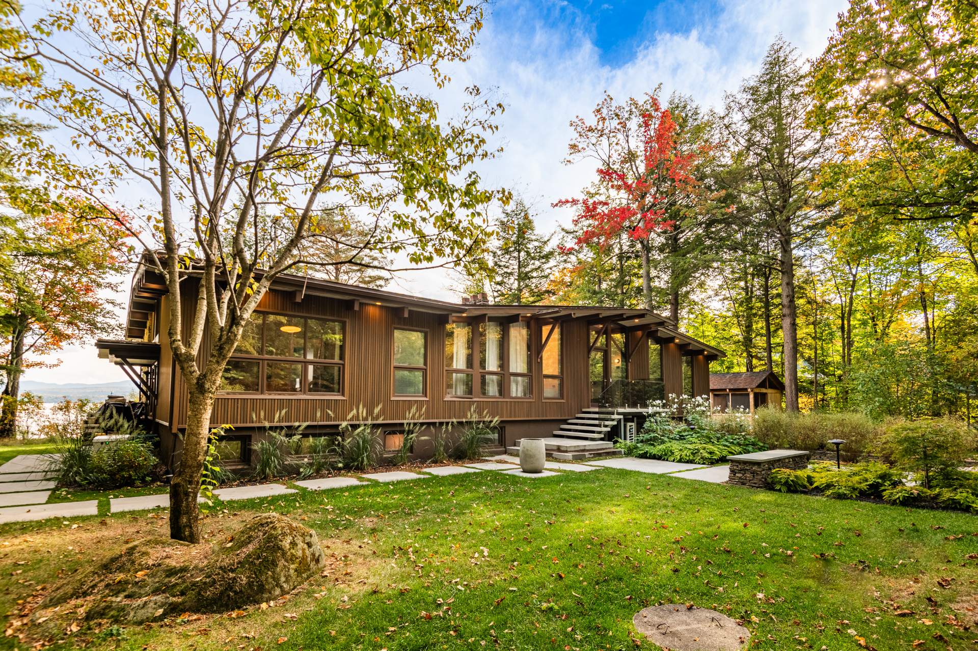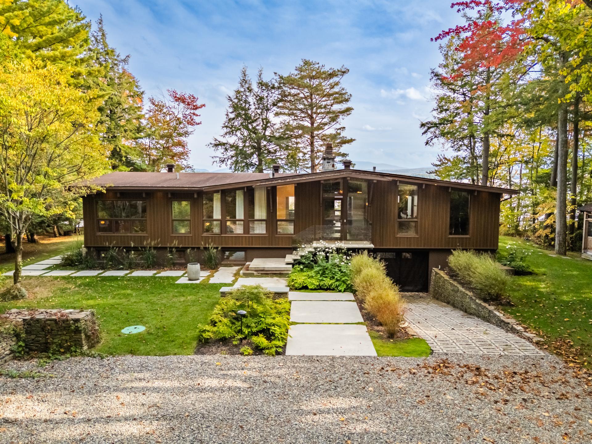 Set on an intimate lot of nearly 40,000 sq. ft. with 160 feet of frontage on the lake, the property enjoys an exceptional setting where water, light, and nature become central elements of the residential experience. The Mid-Century modern architecture is expressed with precision through clean lines, a strong horizontal emphasis, and full-height windows that create a seamless connection between the main living areas and the lake.