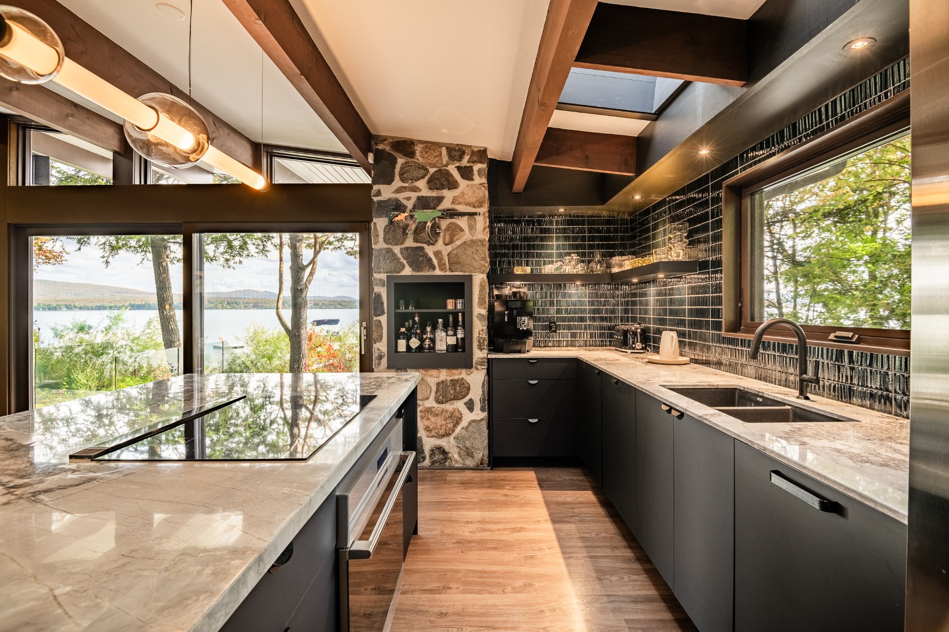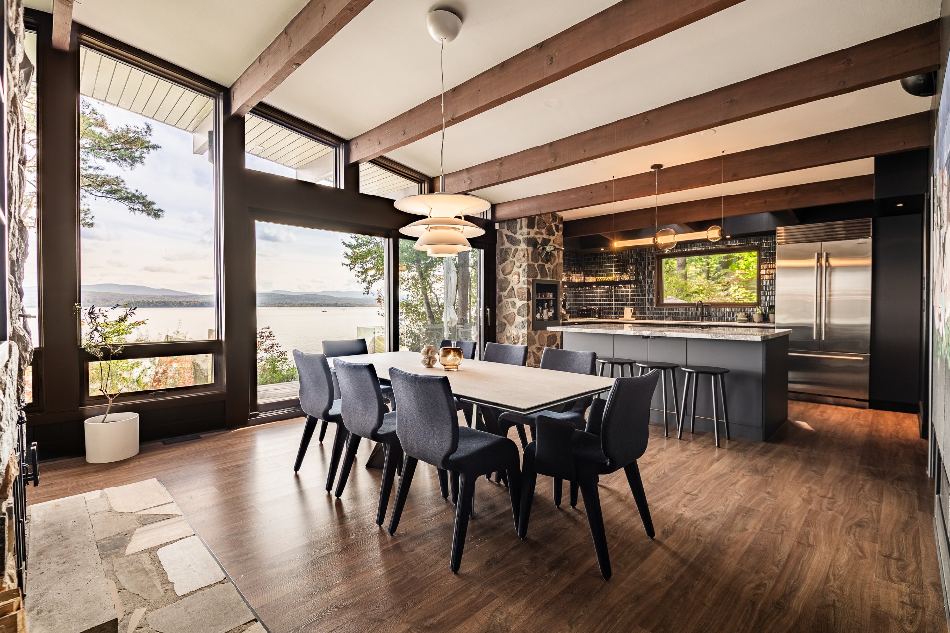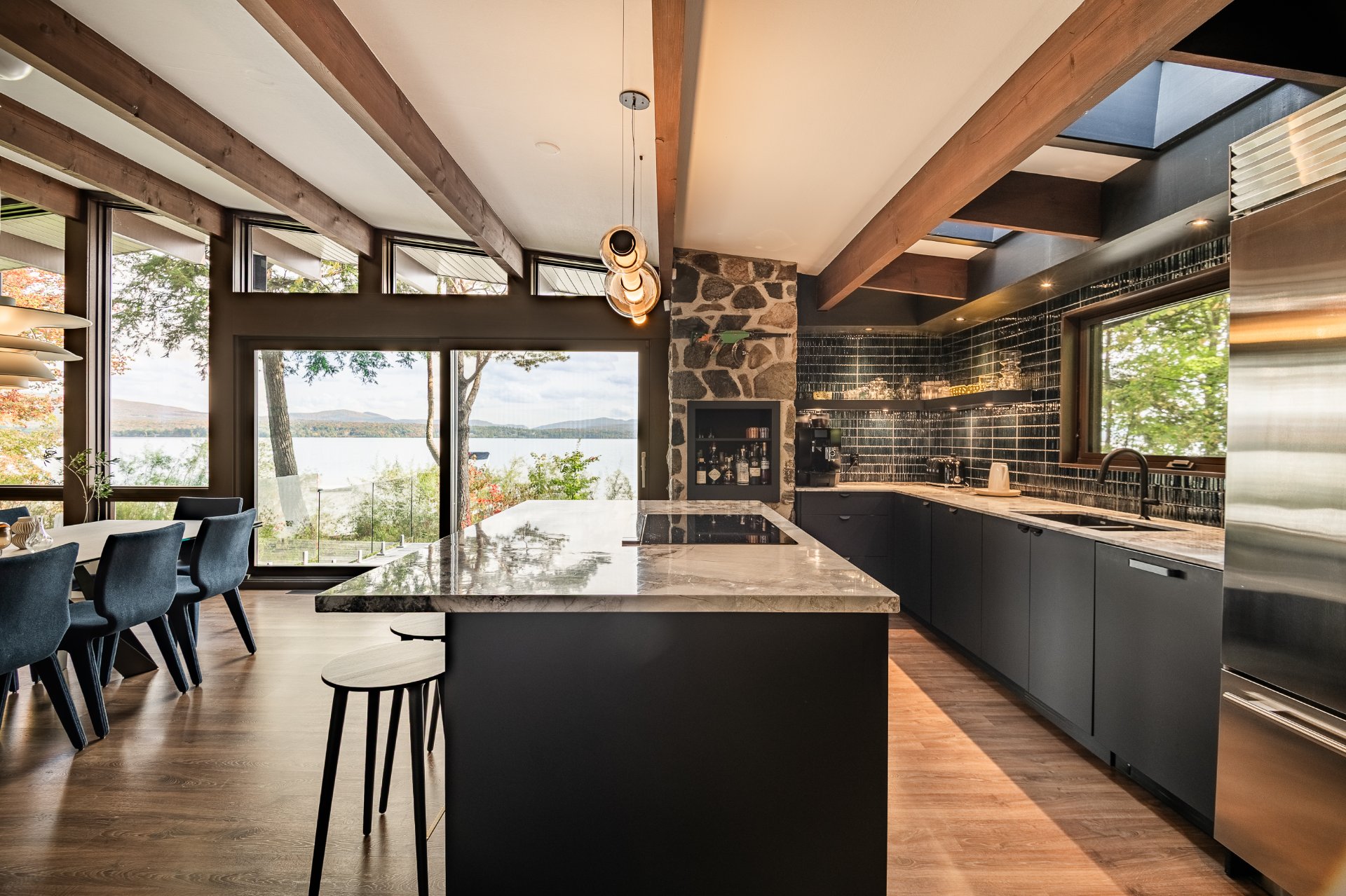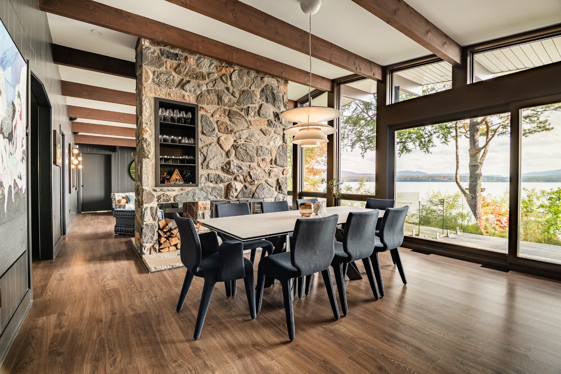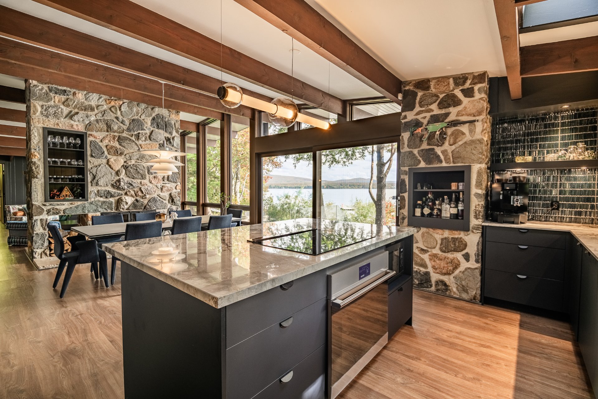The heart of the home is organized around a generous open-concept space where the living room, dining area, and kitchen flow effortlessly together. The double-sided stone fireplace, a true focal point, anchors the space while preserving sightlines and views, creating a warm and refined atmosphere well suited to both everyday living and entertaining. Natural light and reflections from the lake accompany the interiors throughout the day, reinforcing the sense of continuity between indoors and out.