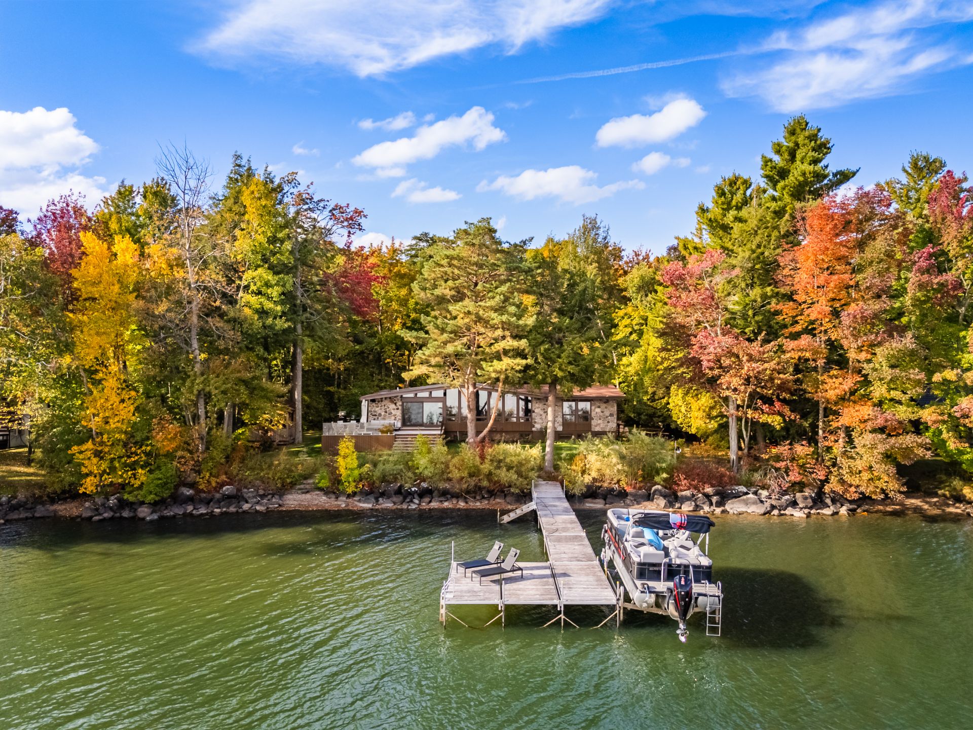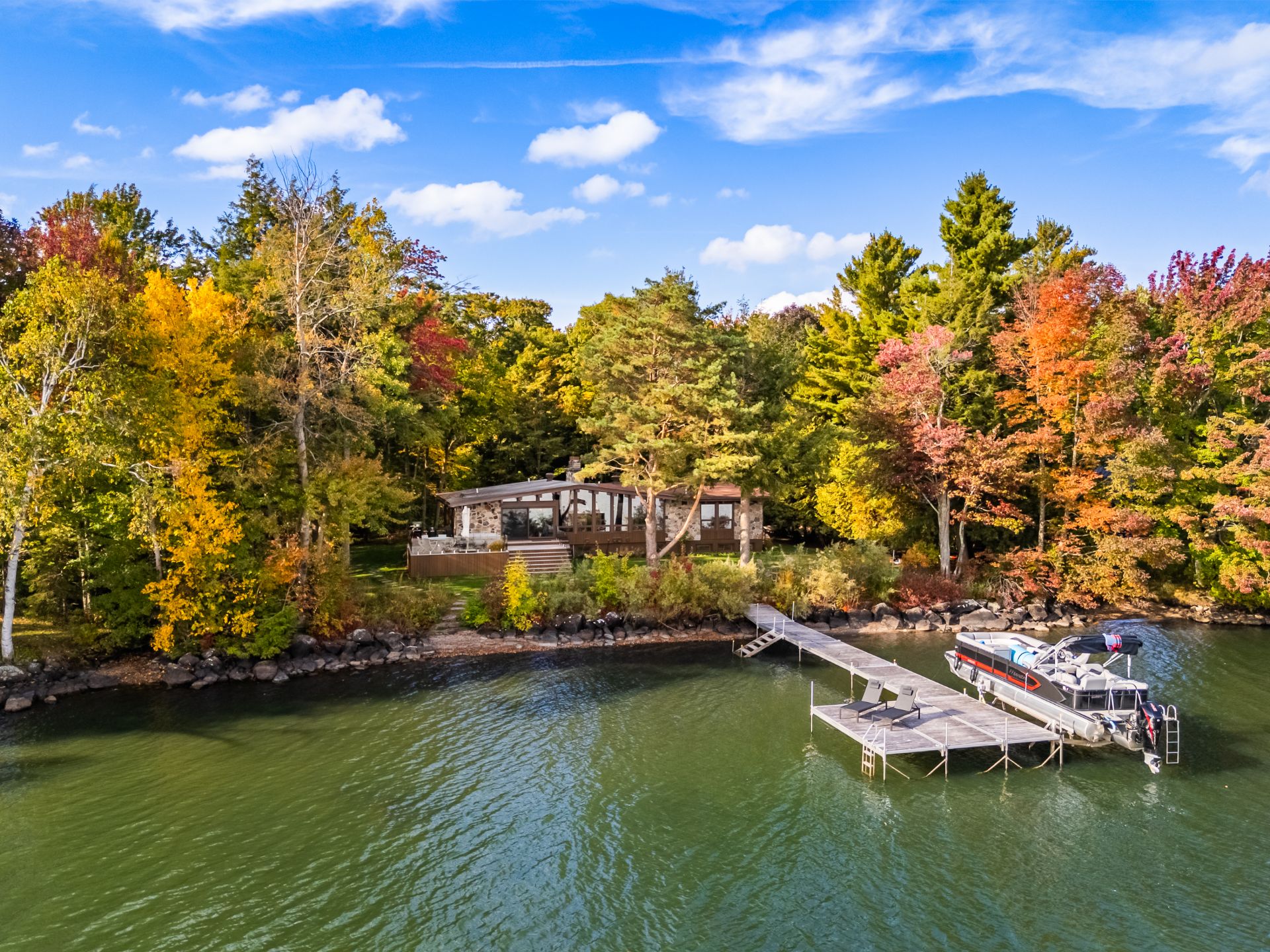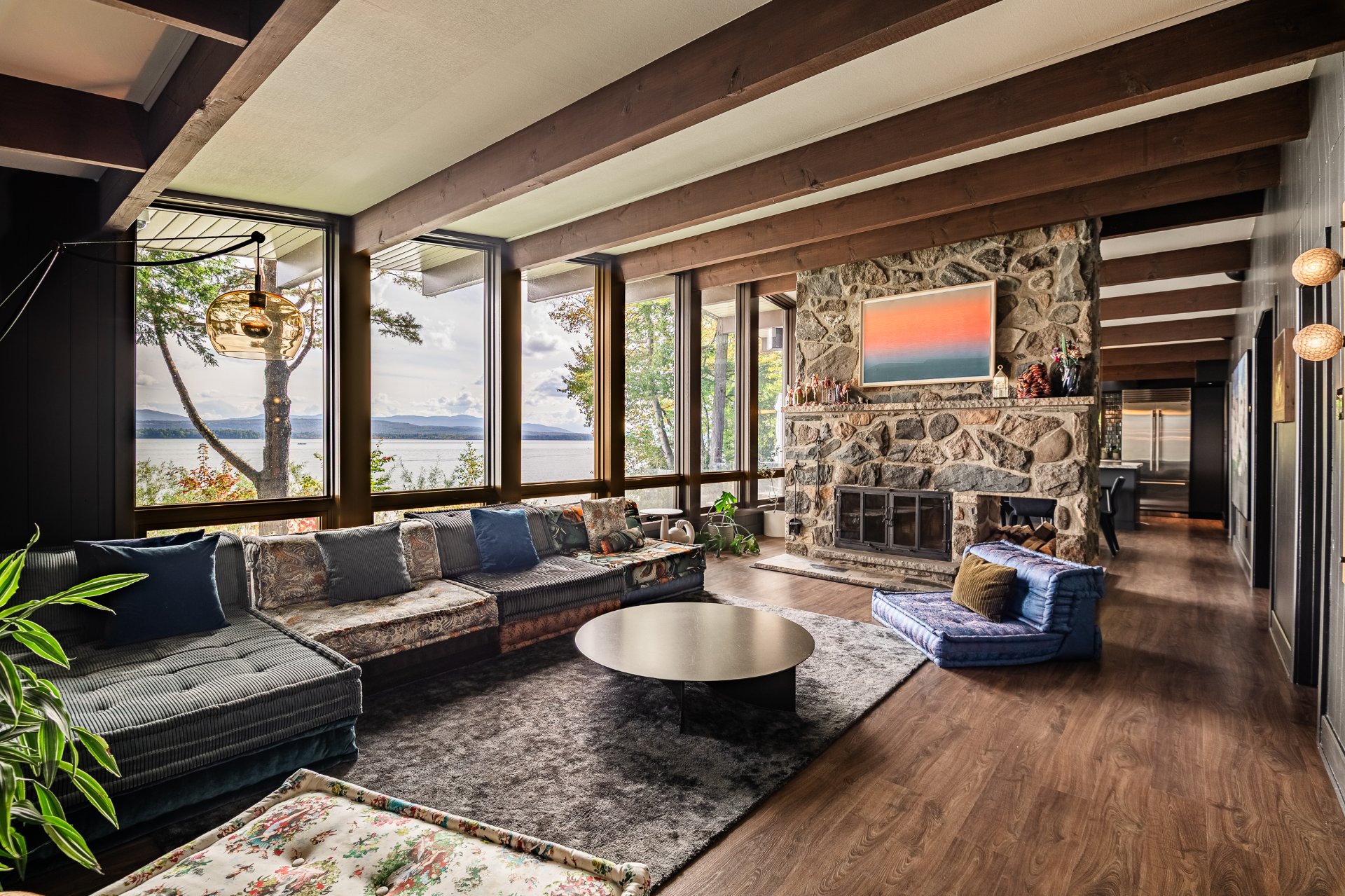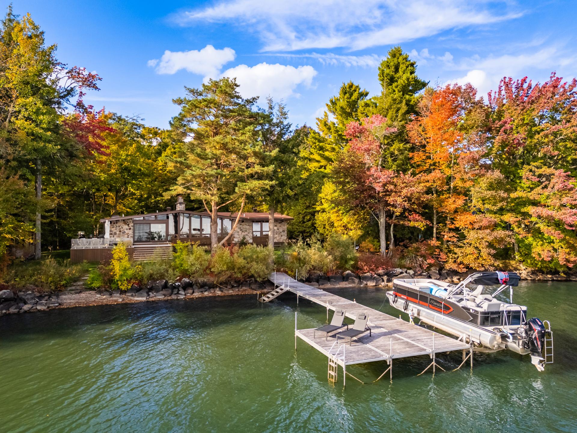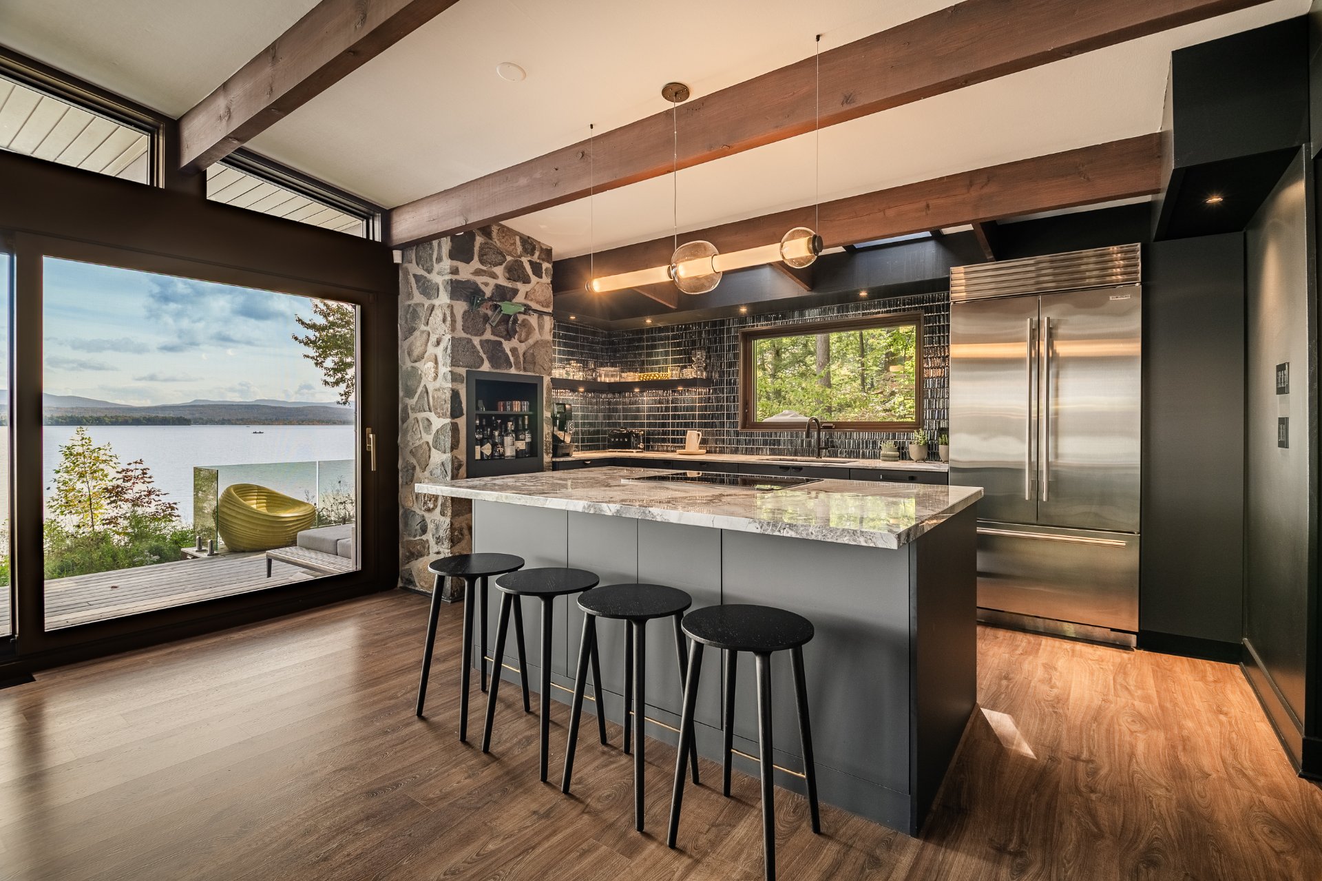 The heart of the home is organized around a generous open-concept space where the living room, dining area, and kitchen flow effortlessly together. The double-sided stone fireplace, a true focal point, anchors the space while preserving sightlines and views, creating a warm and refined atmosphere well suited to both everyday living and entertaining. Natural light and reflections from the lake accompany the interiors throughout the day, reinforcing the sense of continuity between indoors and out.