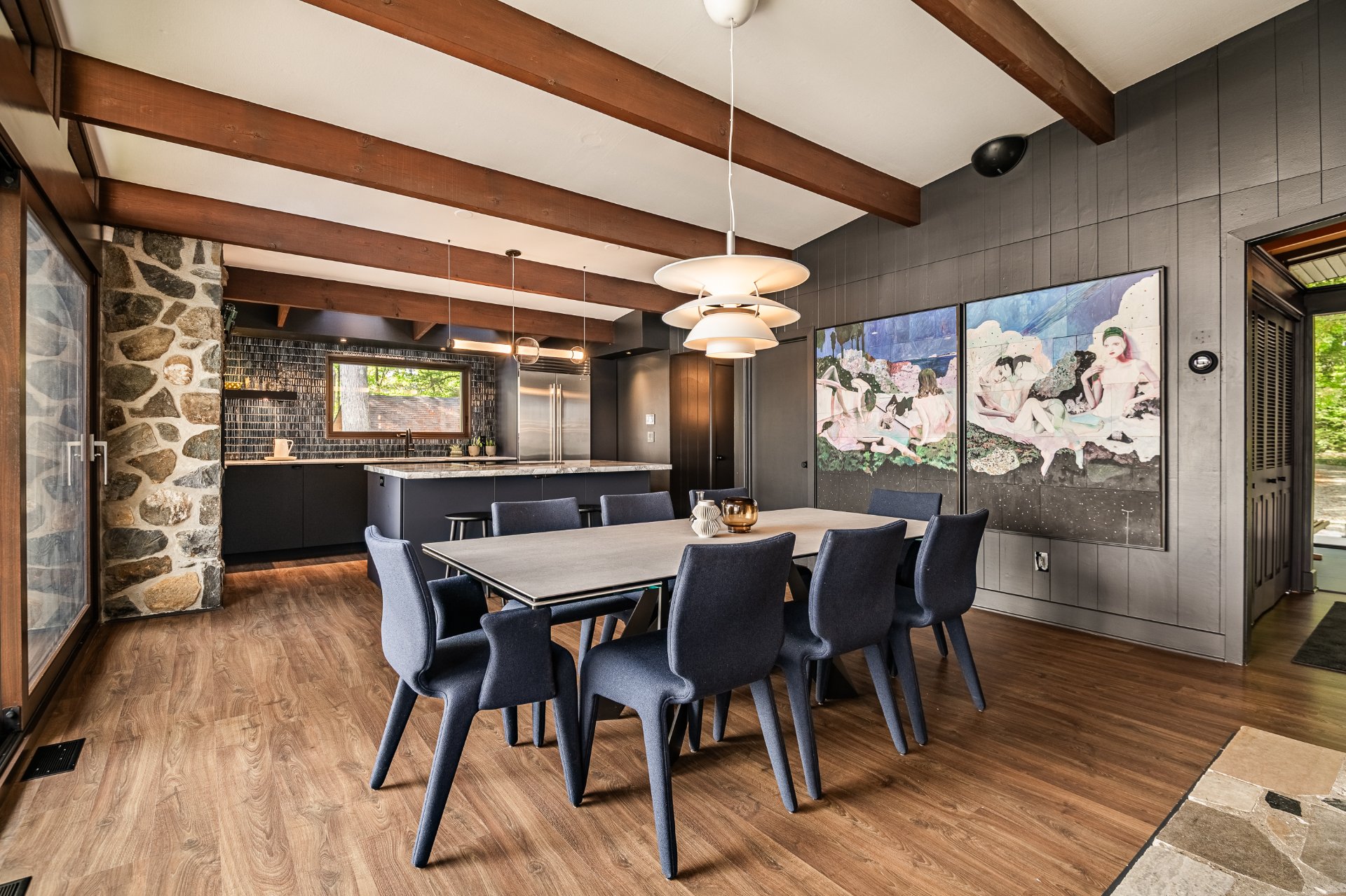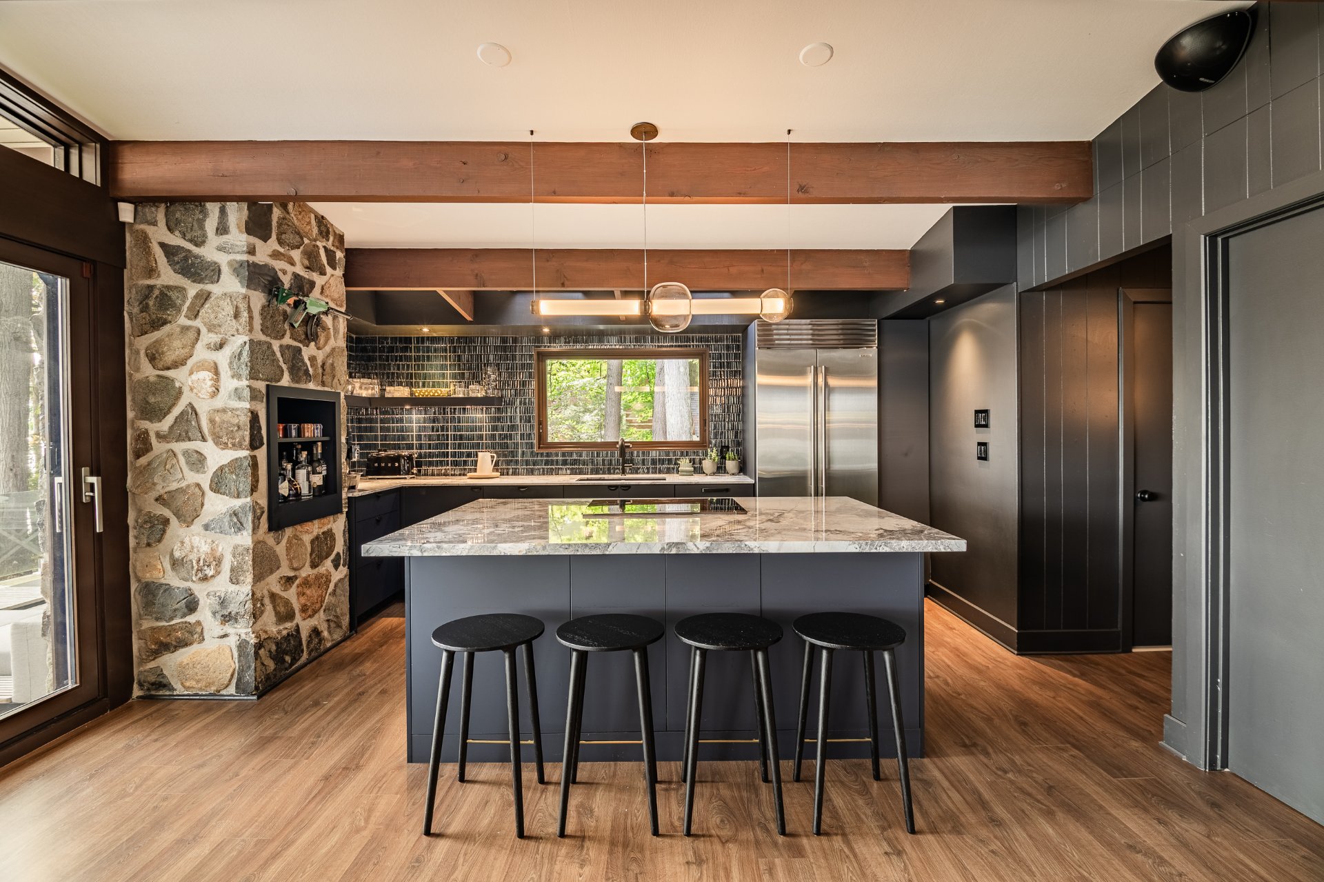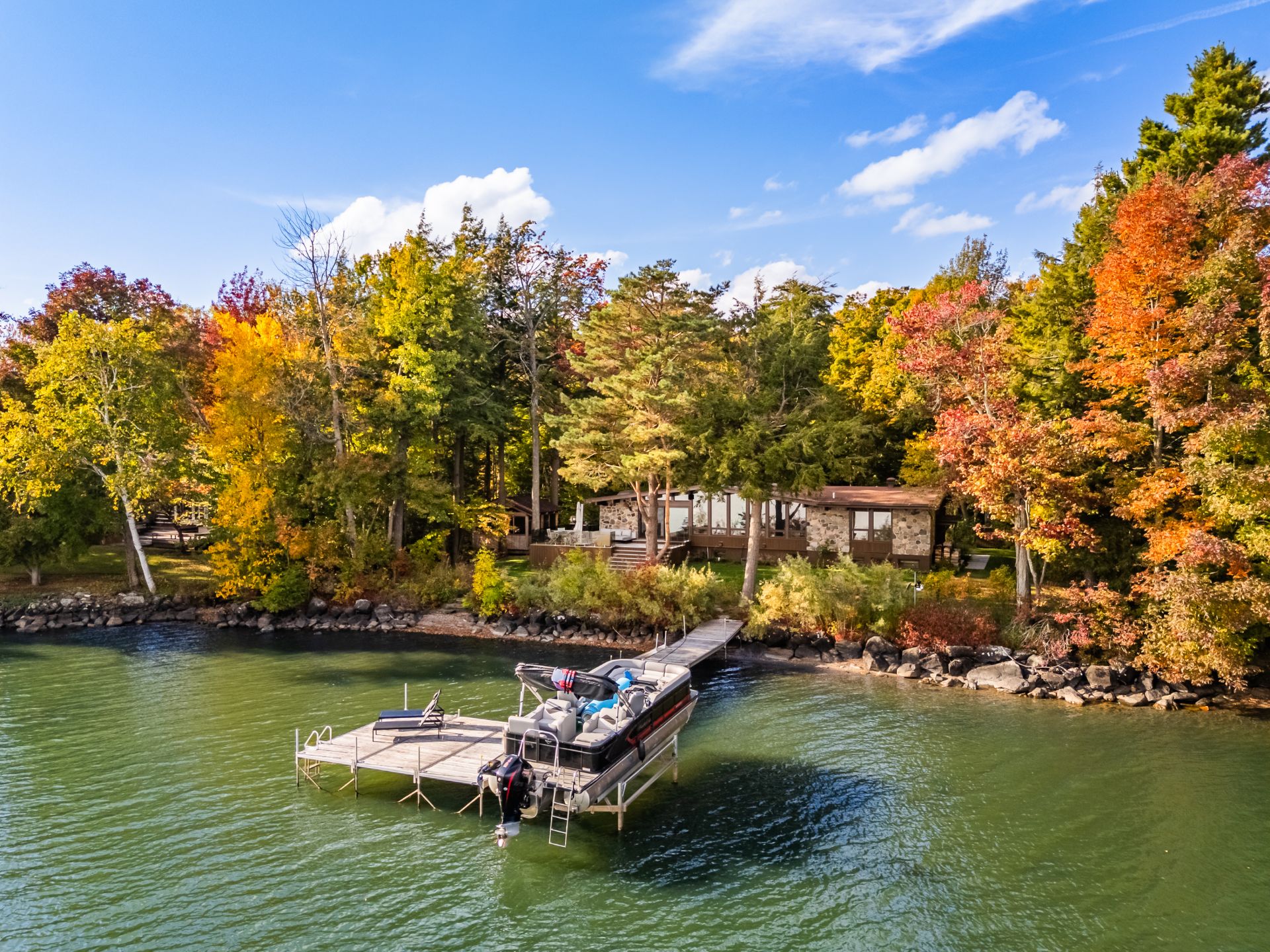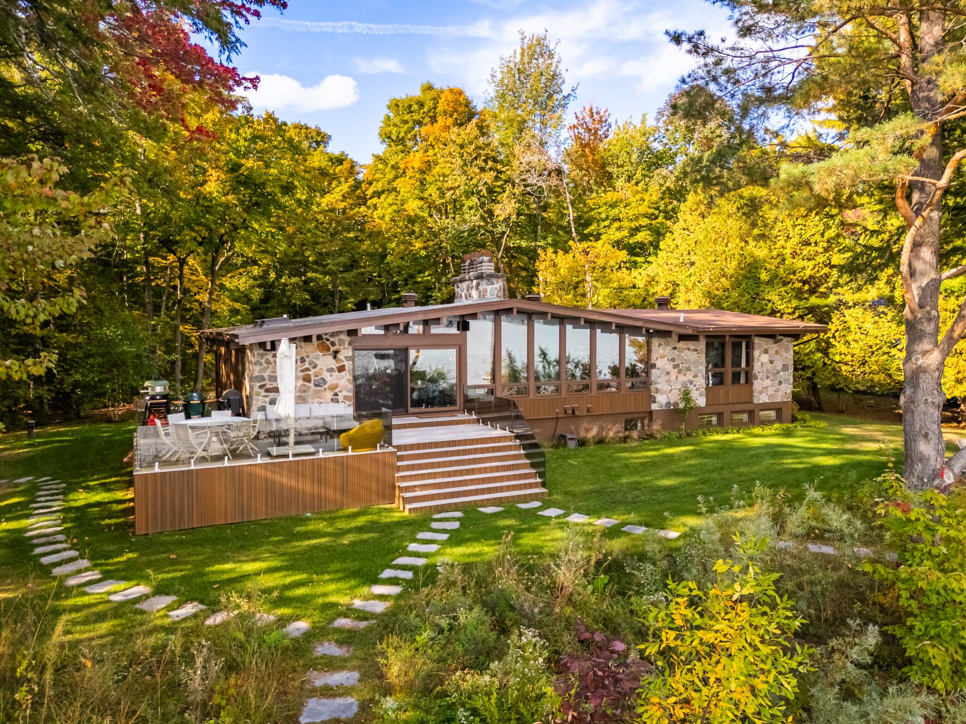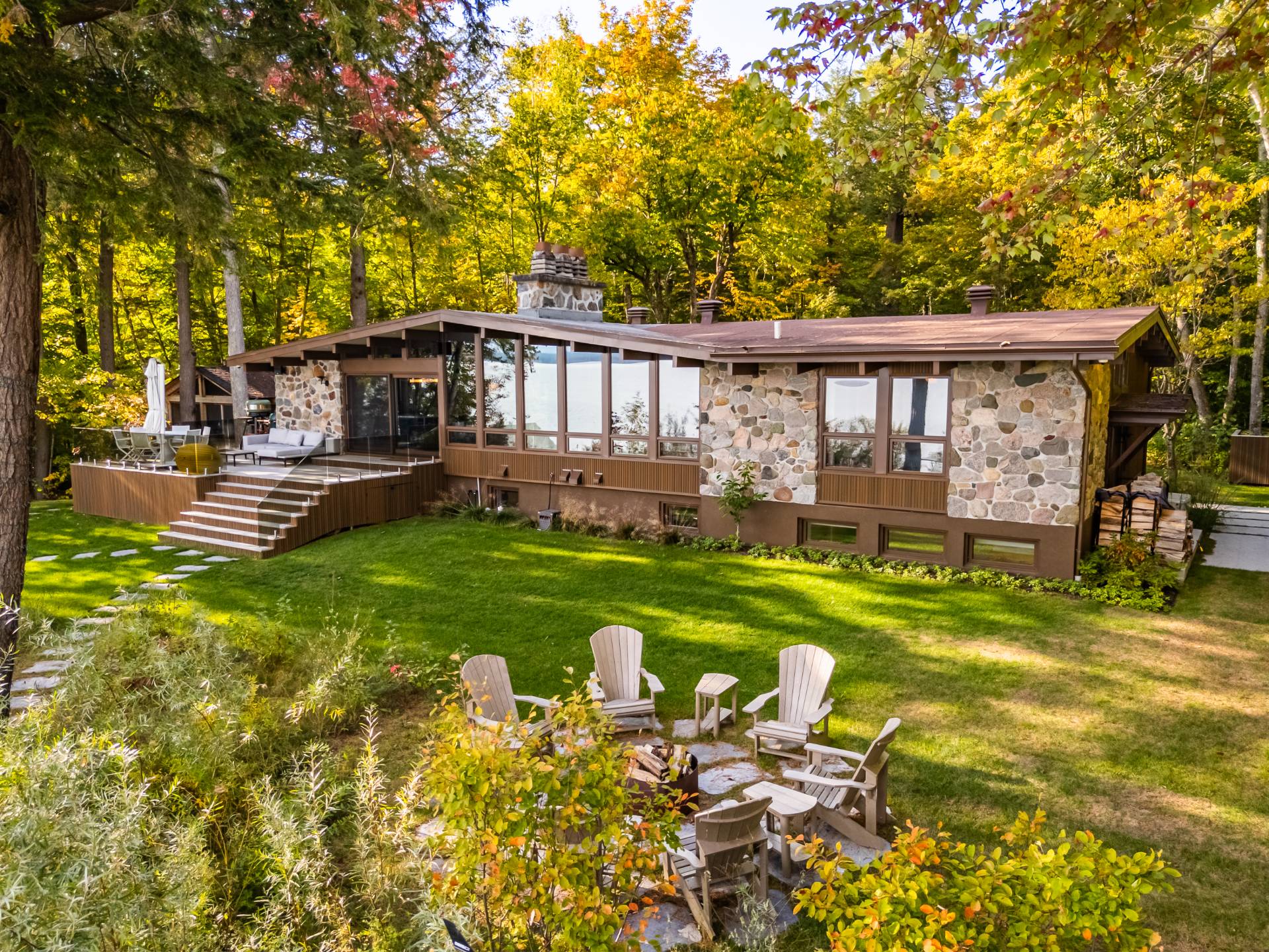 The heart of the home is organized around a generous open-concept space where the living room, dining area, and kitchen flow effortlessly together. The double-sided stone fireplace, a true focal point, anchors the space while preserving sightlines and views, creating a warm and refined atmosphere well suited to both everyday living and entertaining. Natural light and reflections from the lake accompany the interiors throughout the day, reinforcing the sense of continuity between indoors and out.