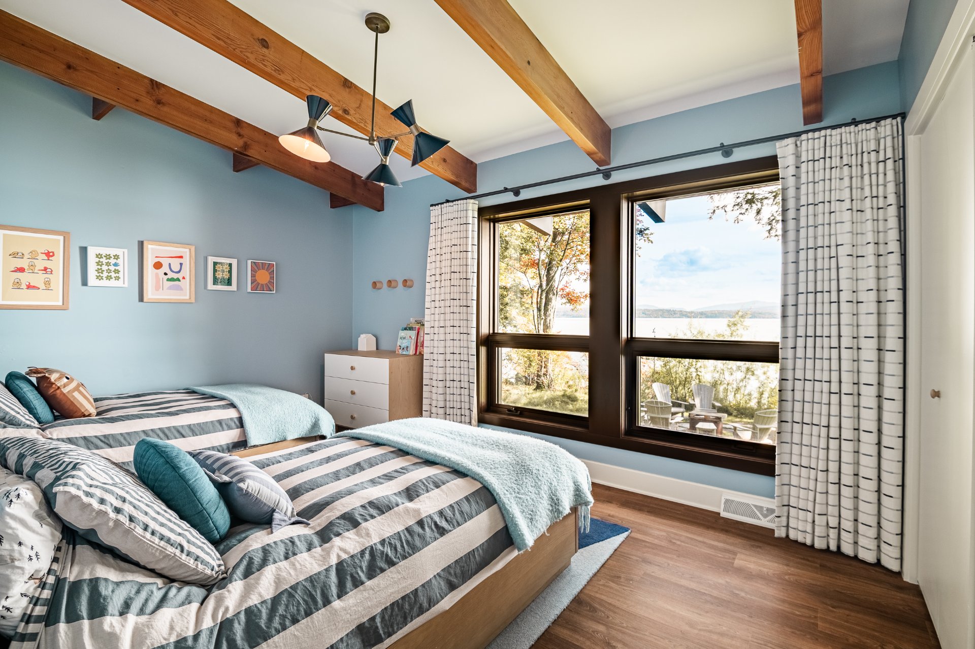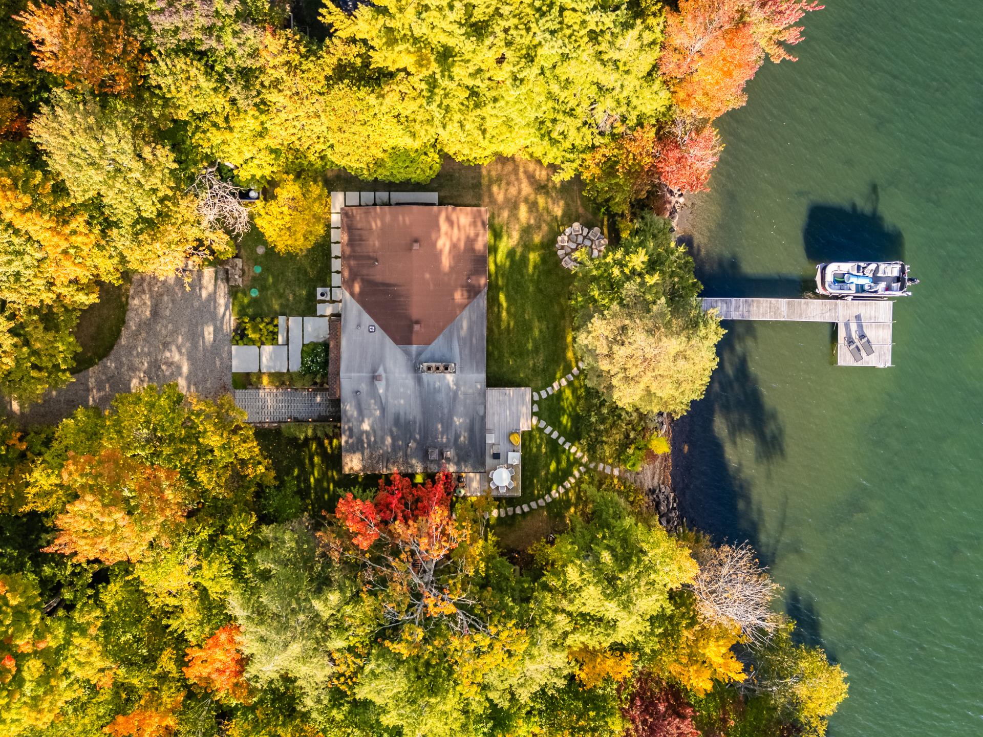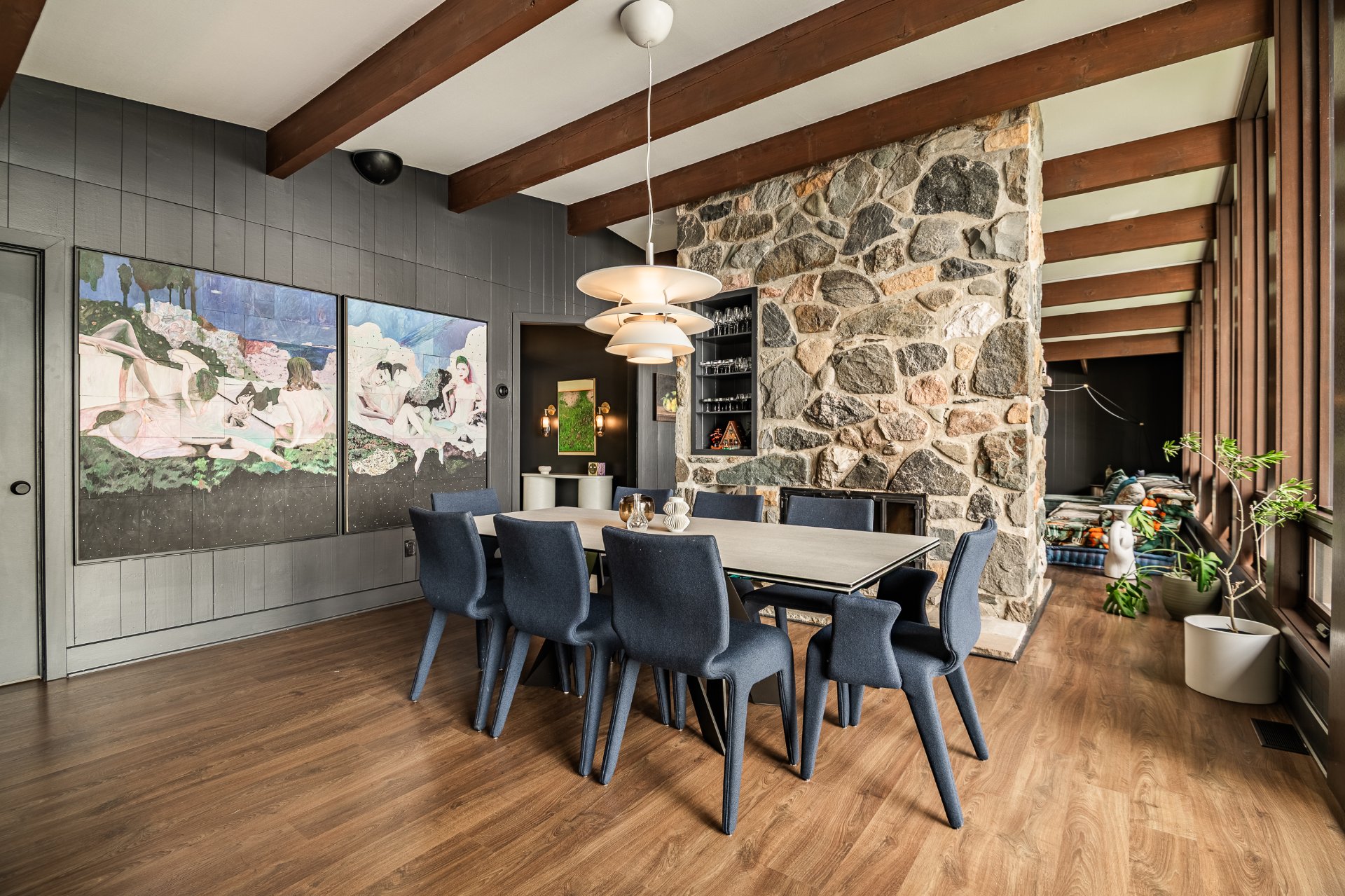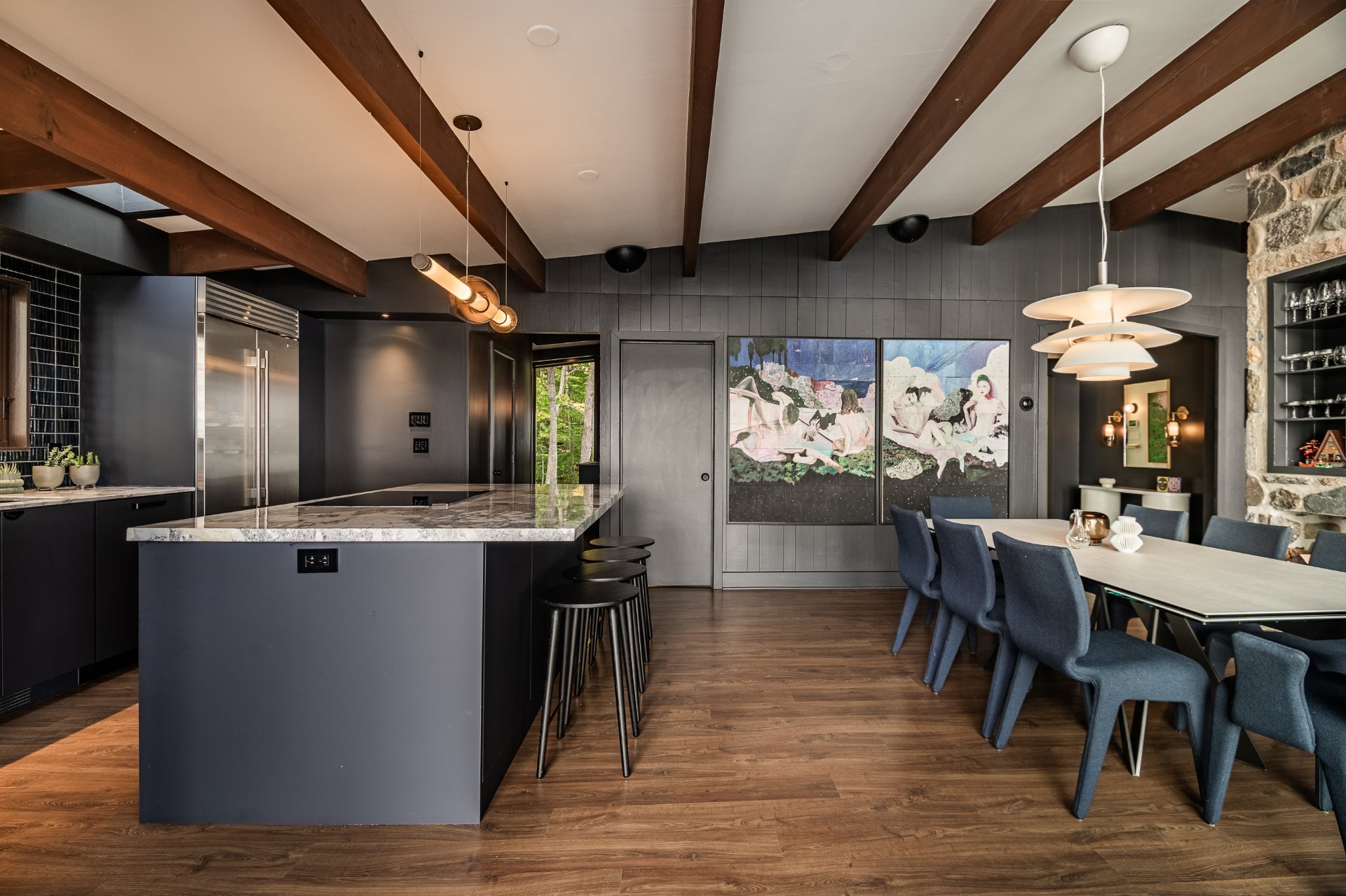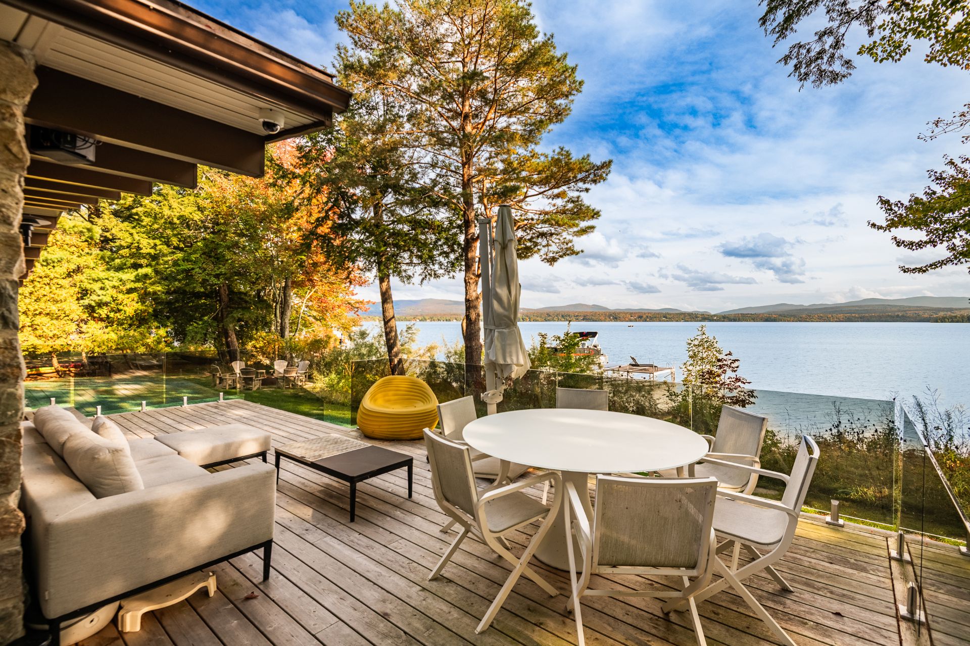The heart of the home is organized around a generous open-concept space where the living room, dining area, and kitchen flow effortlessly together. The double-sided stone fireplace, a true focal point, anchors the space while preserving sightlines and views, creating a warm and refined atmosphere well suited to both everyday living and entertaining. Natural light and reflections from the lake accompany the interiors throughout the day, reinforcing the sense of continuity between indoors and out.