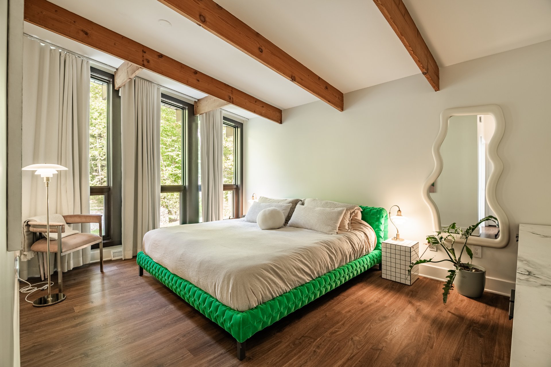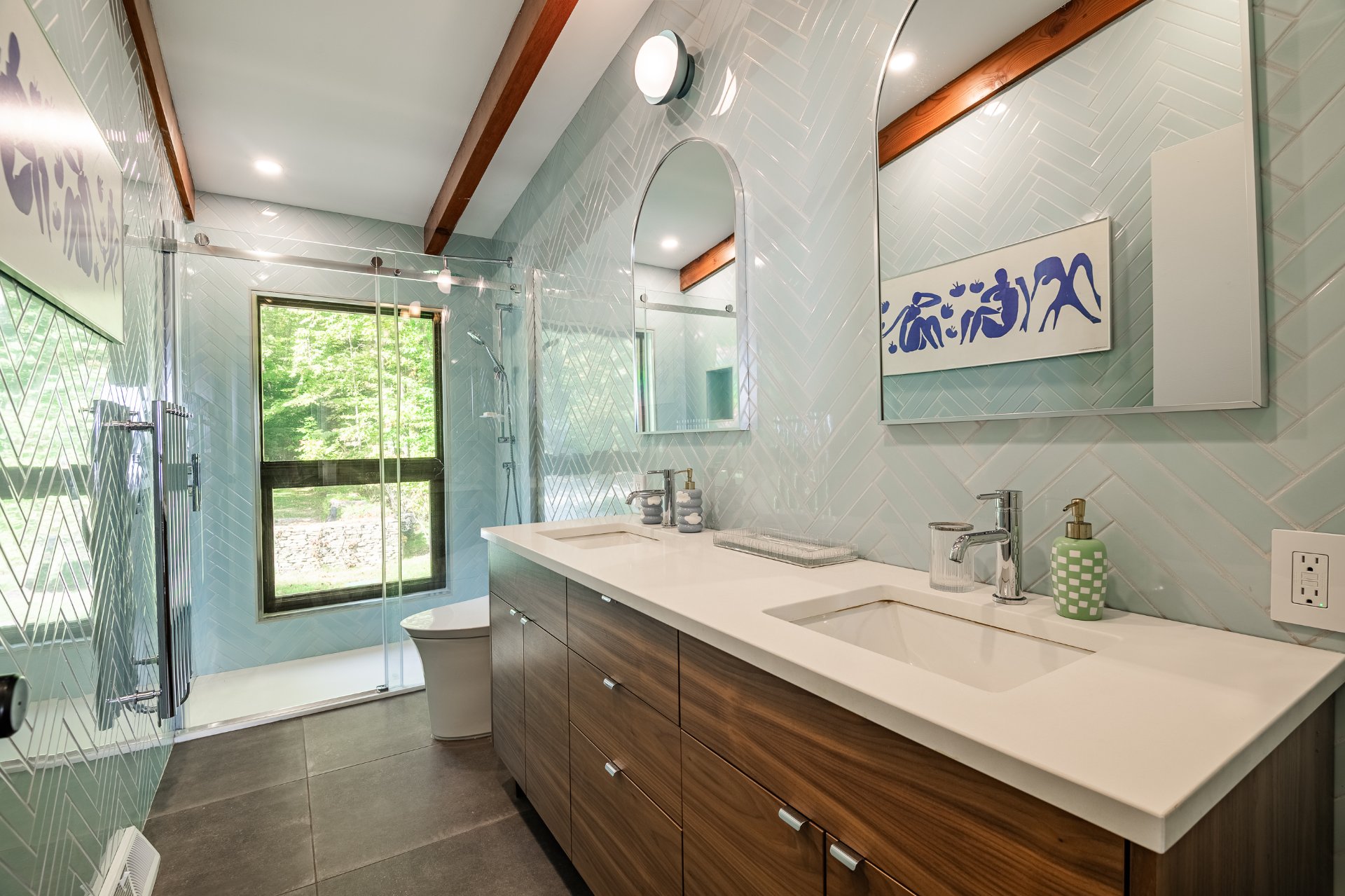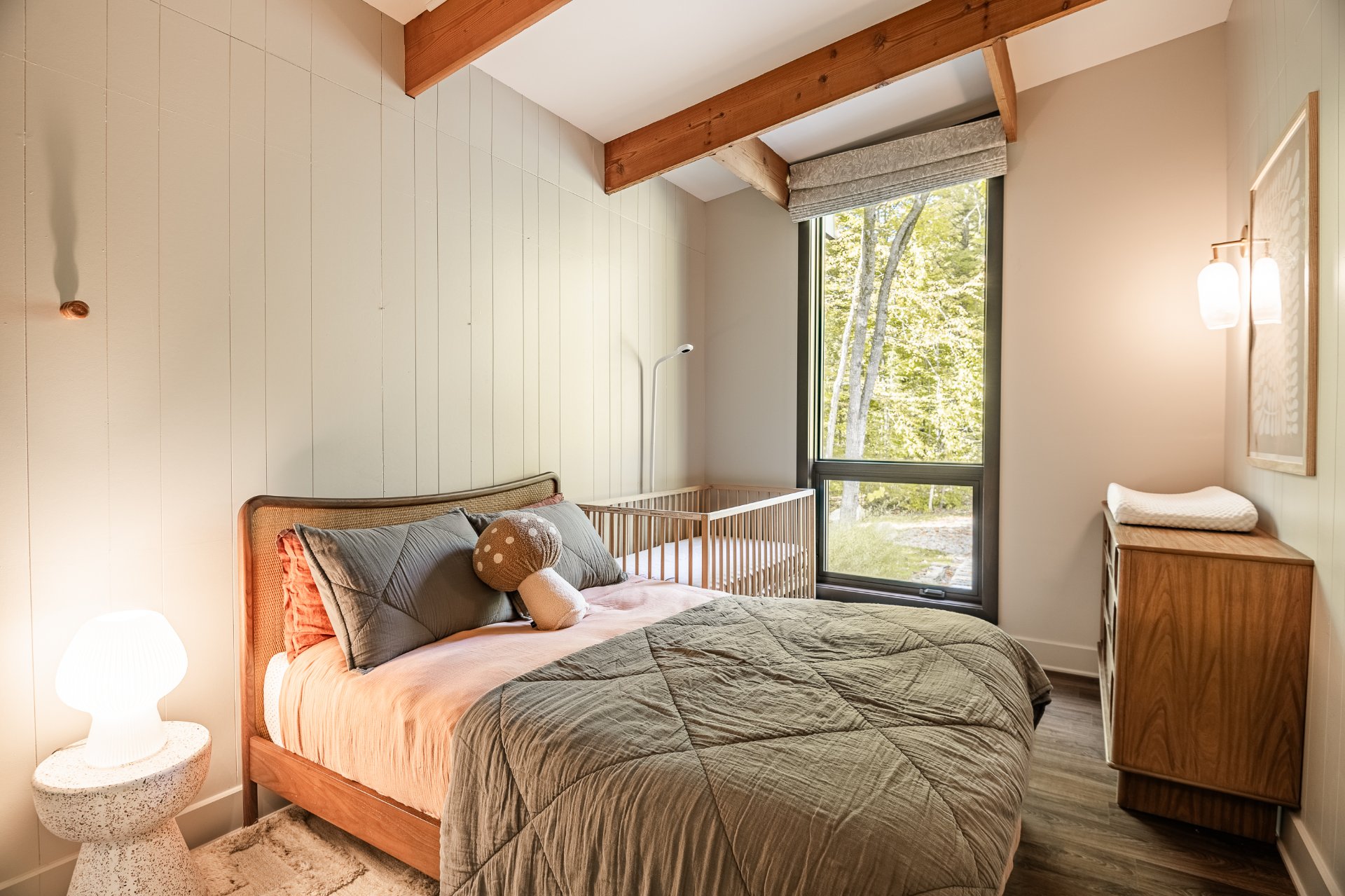 The property offers four bedrooms, three full bathrooms, and one powder room, all designed with a sense of coherence and timelessness. The primary suite, oriented toward the wooded landscape, stands out for its intimate and tranquil character, a true retreat conducive to rest and reflection.