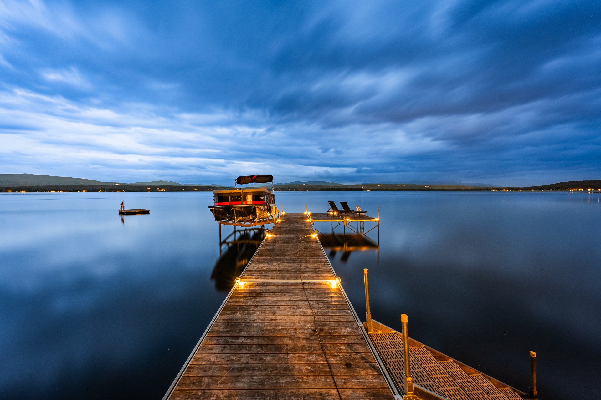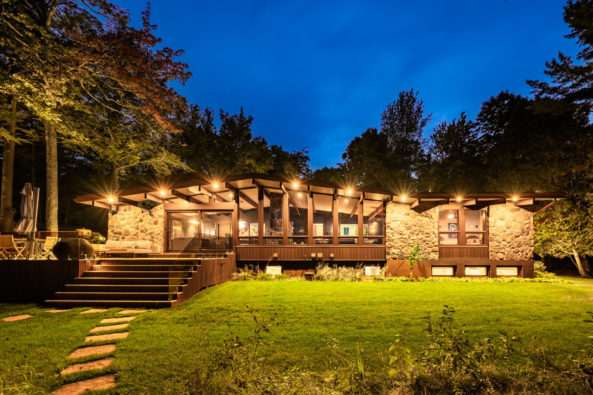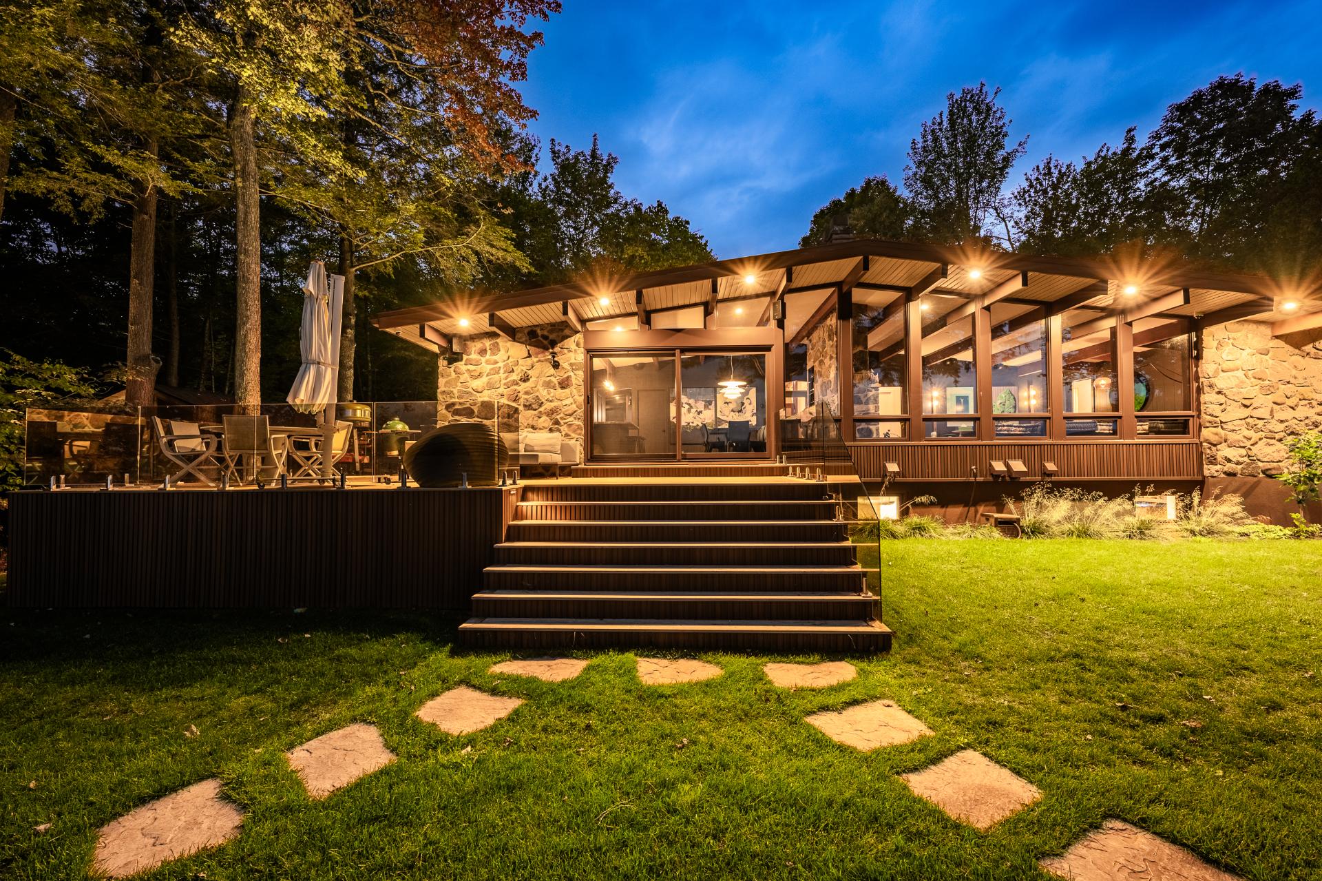 Outdoors, the private dock, terrace, contemplation area with outdoor fireplace, and three-season pavilion extend the interior experience and invite residents to fully embrace lake living throughout the seasons. The landscaped grounds, paired with a thoughtfully orchestrated exterior lighting plan, highlight the architecture, the landscape, and circulation paths, creating an intimate, fluid, and striking ambiance at dusk.