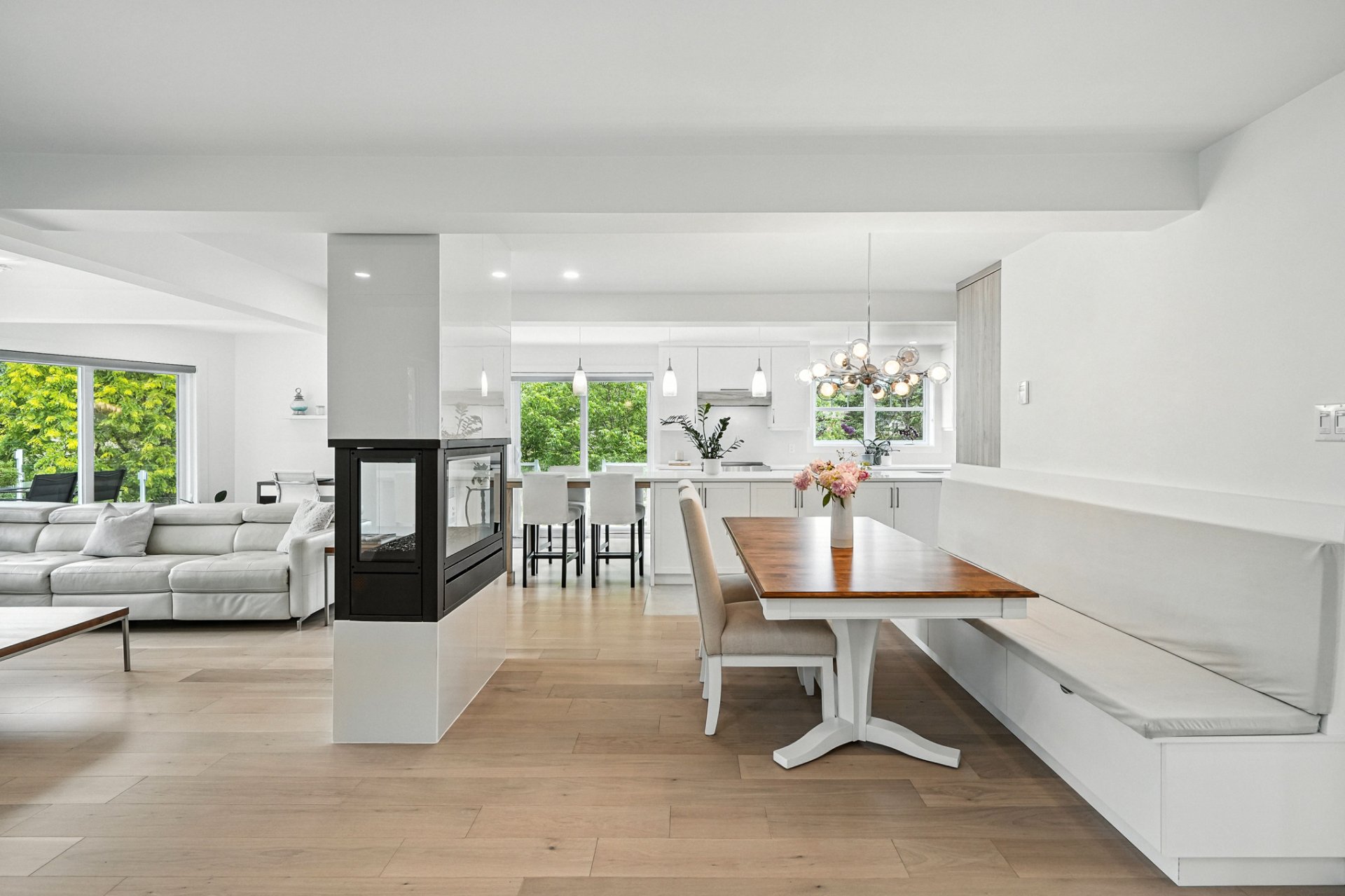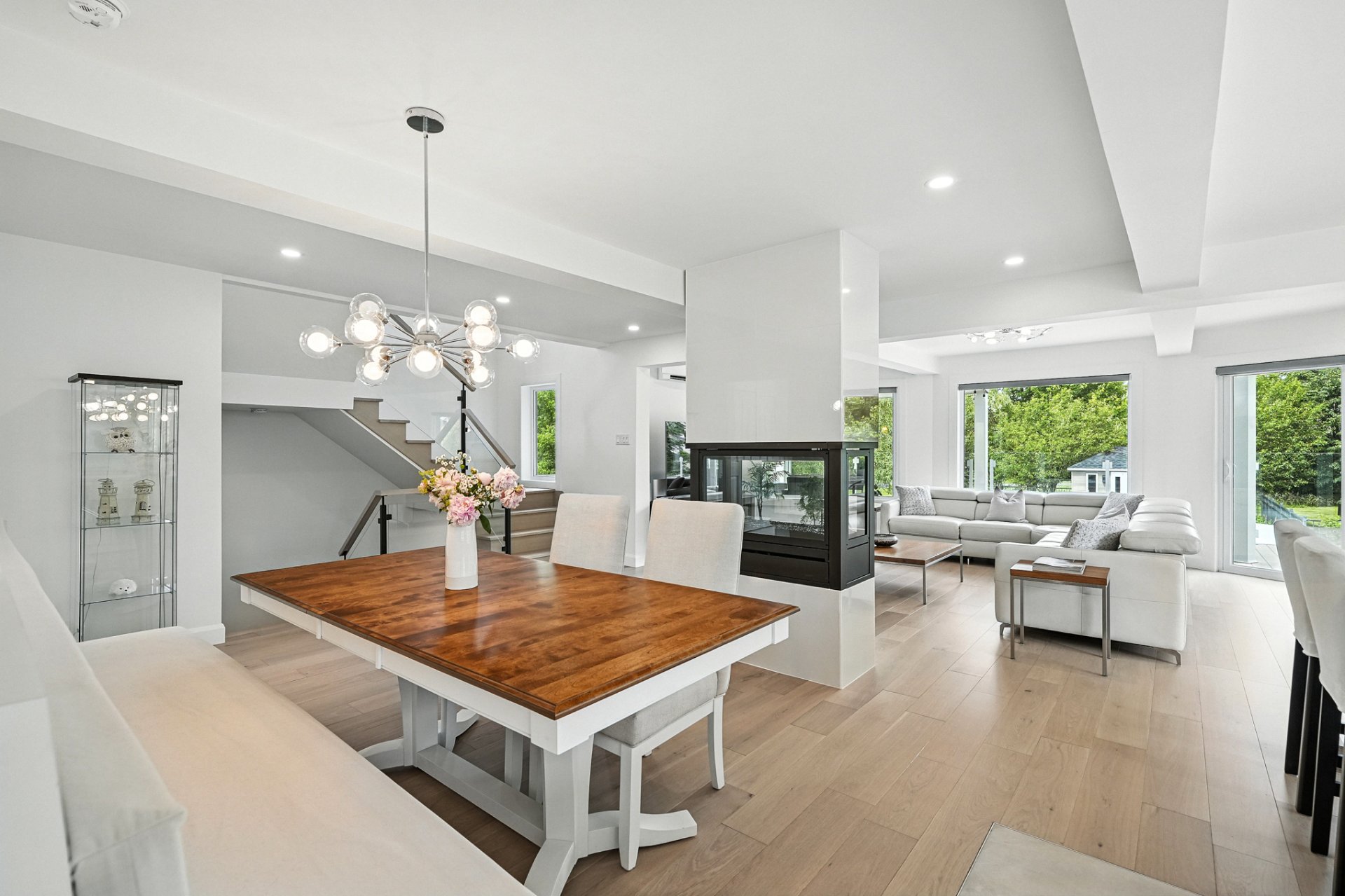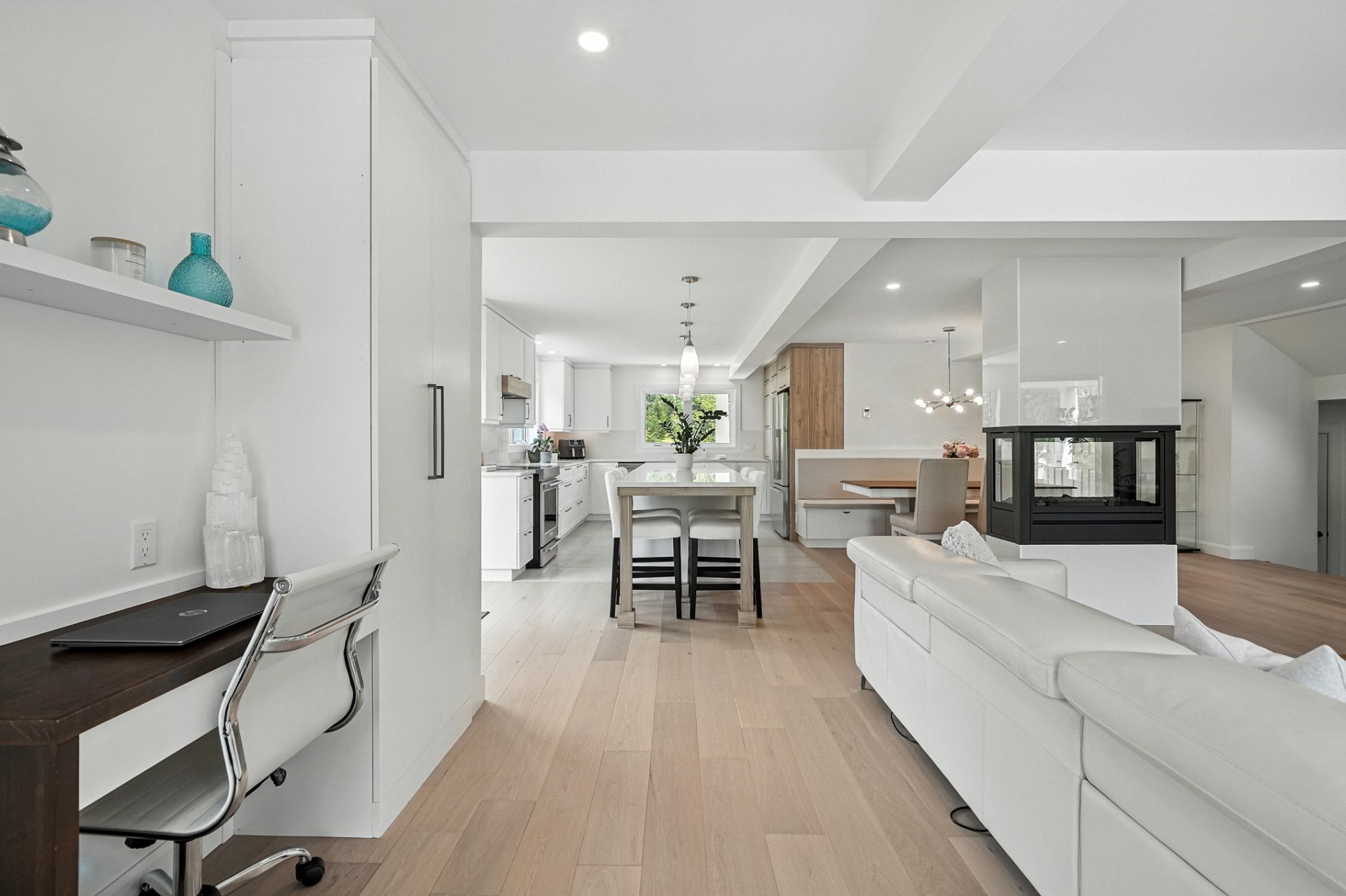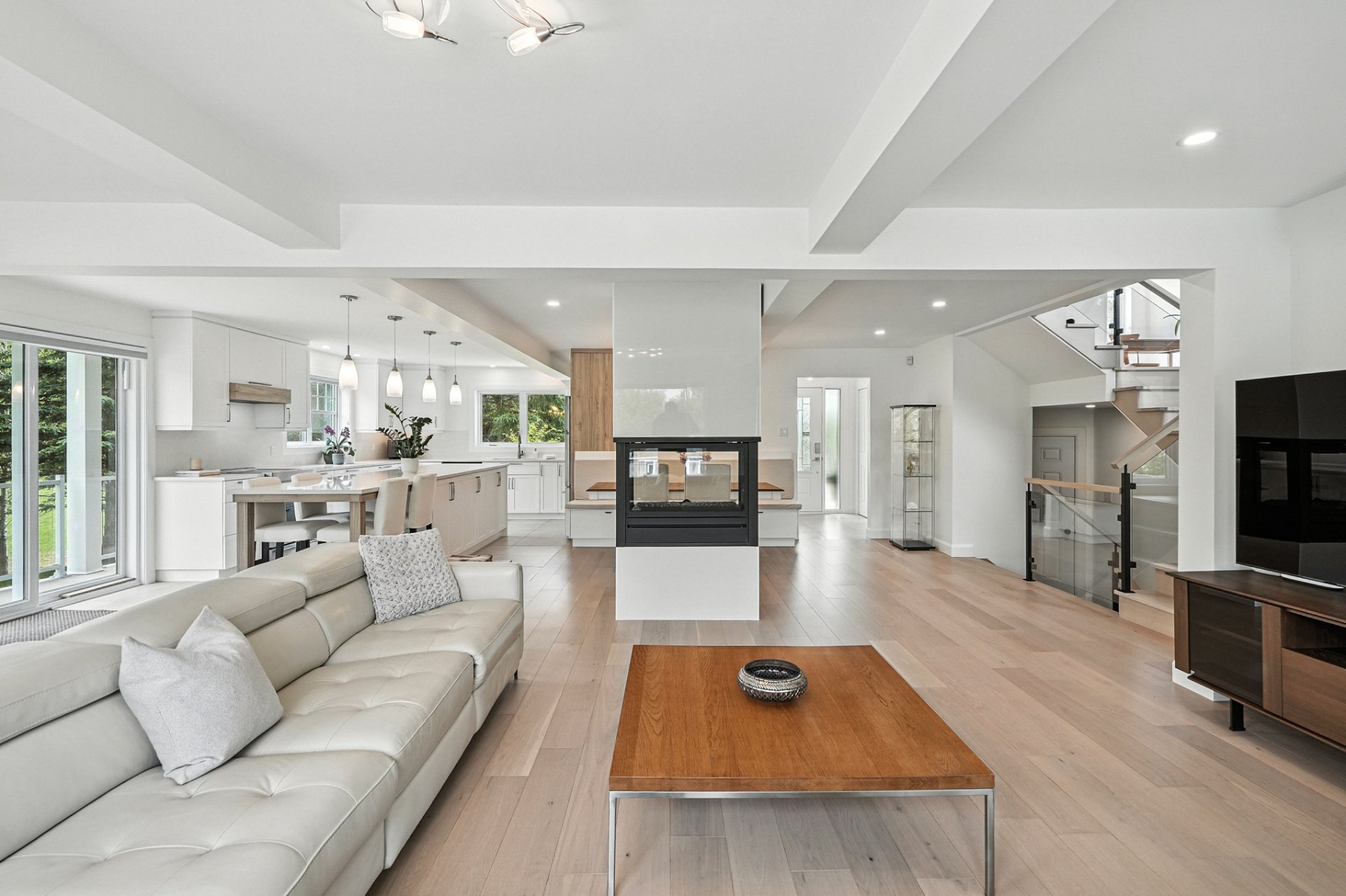 The interior design creates a calming atmosphere where light wood and clean lines combine with glass and natural light. The open-concept main floor exudes flow and warmth: a living room with a view of the pool, a four-sided gas fireplace, white oak engineered wood floors, and a thoughtfully designed kitchen featuring quartz countertops, a generous island, and ample Shaker-style cabinetry.