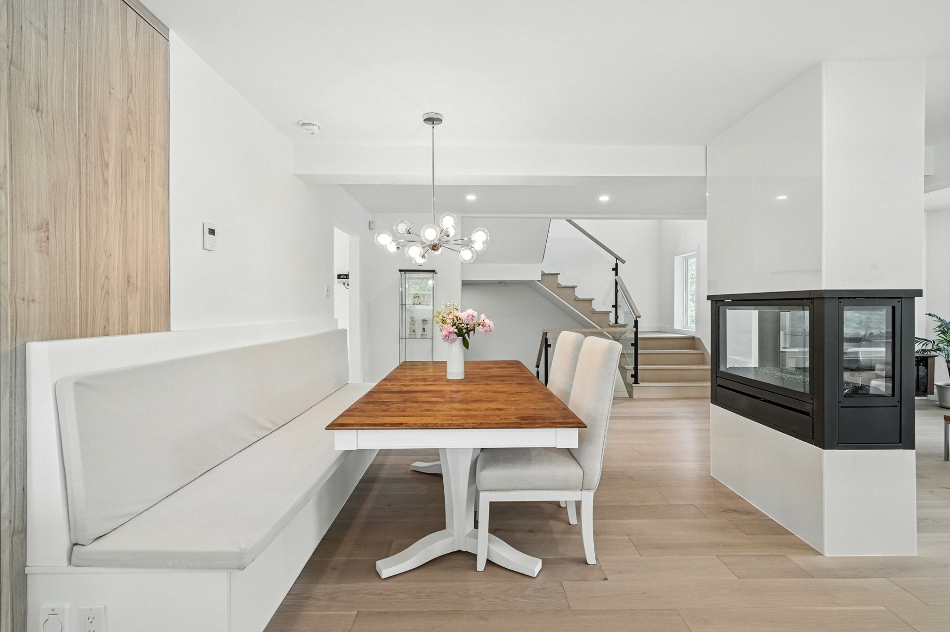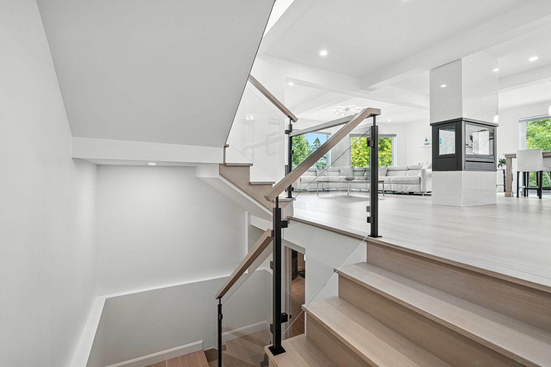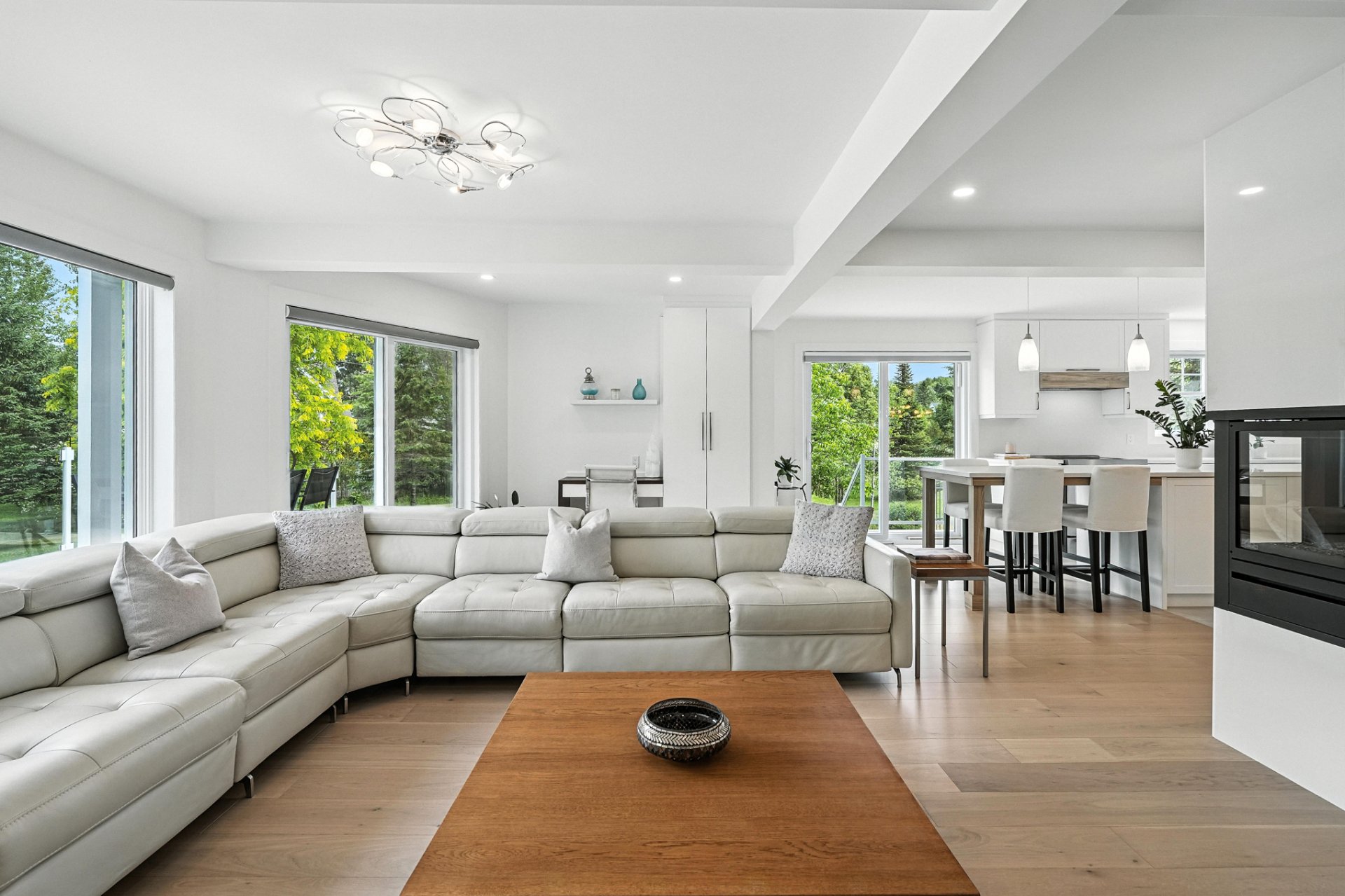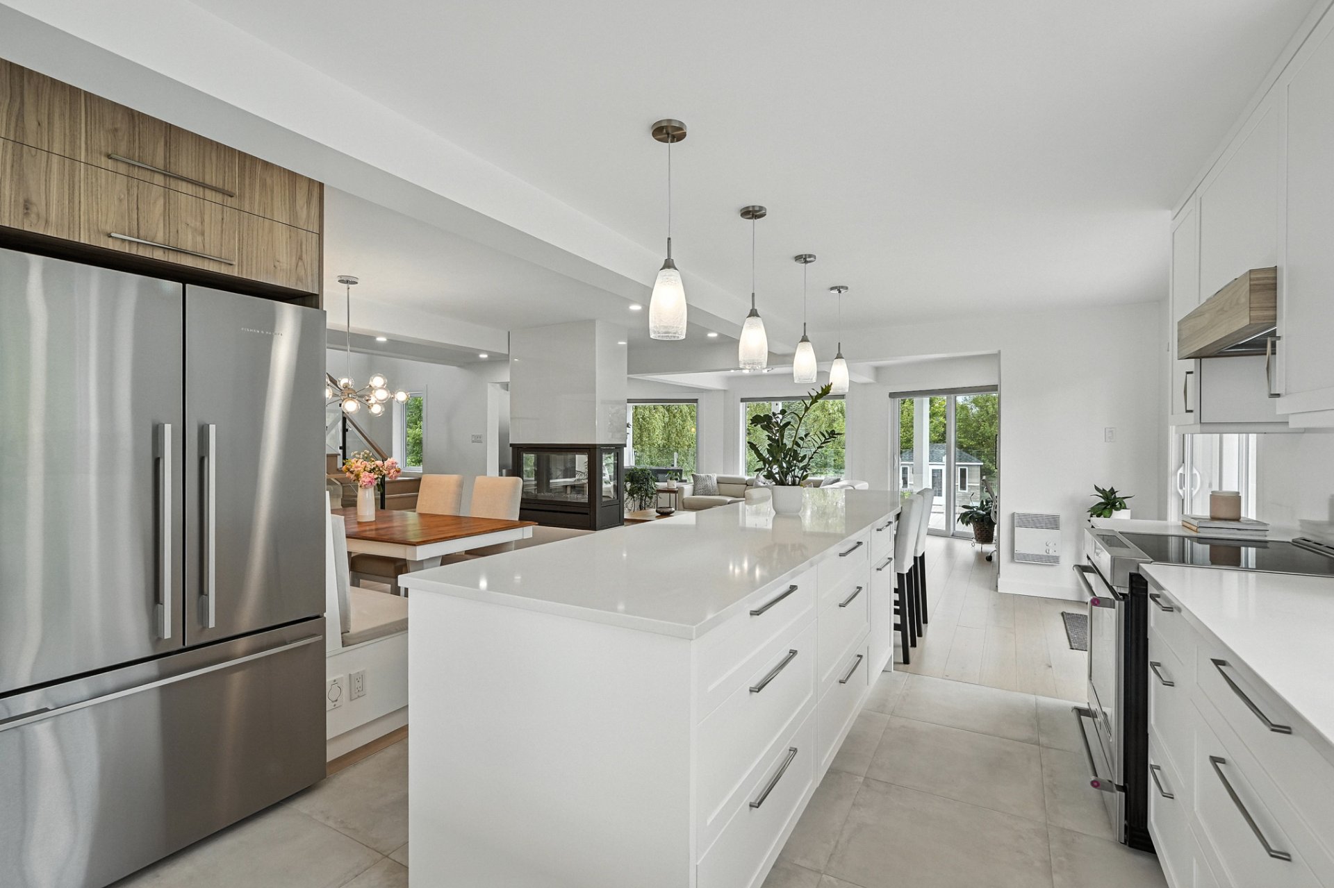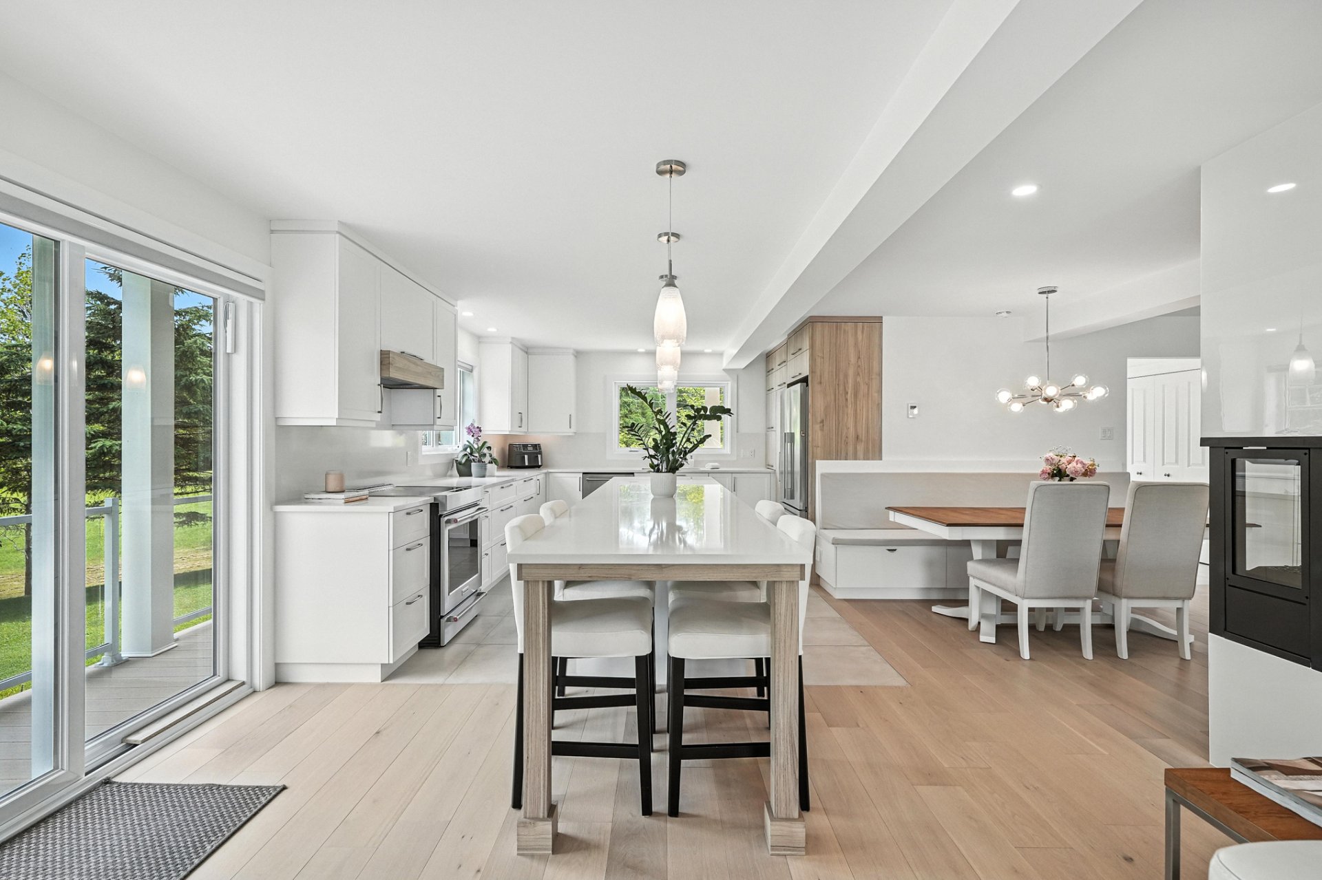 The interior design creates a calming atmosphere where light wood and clean lines combine with glass and natural light. The open-concept main floor exudes flow and warmth: a living room with a view of the pool, a four-sided gas fireplace, white oak engineered wood floors, and a thoughtfully designed kitchen featuring quartz countertops, a generous island, and ample Shaker-style cabinetry.